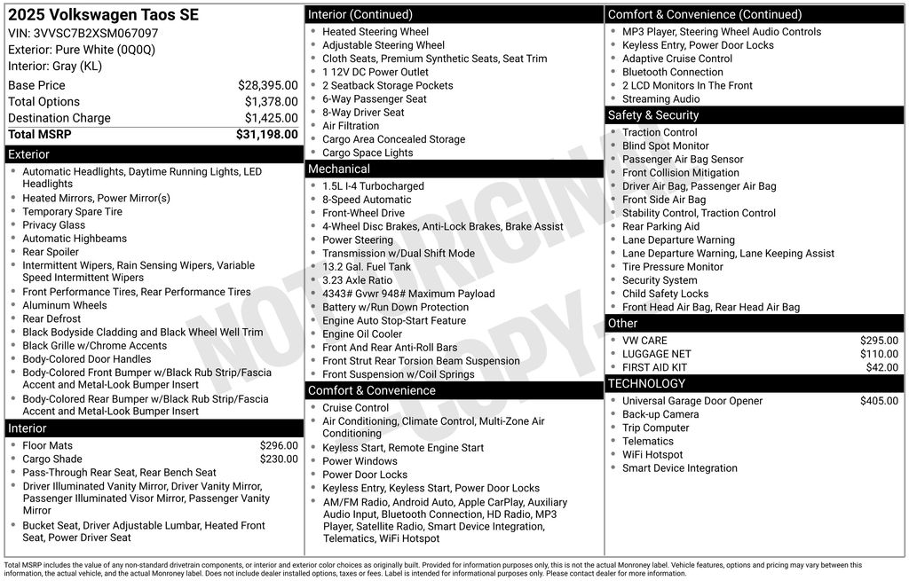 2025 Volkswagen Taos 1.5T SE SUV I4 Turbocharged DOHC 16V LEV3-SULEV30 174hp