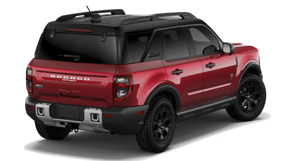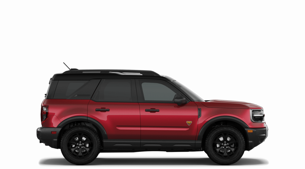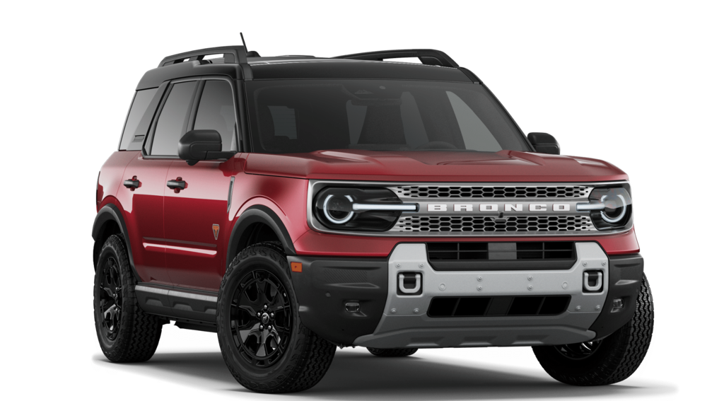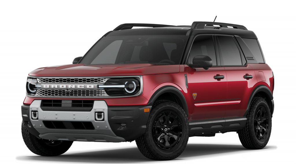 Ruby Red Metallic Tinted Clearcoat 2026 Ford Bronco Sport Badlands NFT 4WD 8-Speed Automatic EcoBoost 2.0L I4 GTDi DOHC Turbocharged VCT 2 Rear D-Ring Recovery Hooks, 4-Wheel Disc Brakes, 6 Speakers, 850W Engine Cooling Fan, ABS brakes, Air Conditioning, Alloy wheels, AM/FM radio: SiriusXM with 360L, AM/FM Stereo, Apple CarPlay/Android Auto, Auto High-beam Headlights, Auto-dimming Rear-View mirror, Automatic temperature control, Auxiliary Switches and Wiring, Badlands Tech Package, Brake assist, Compass, Connected Navigation (1-Year Included), Delay-off headlights, Driver door bin, Driver vanity mirror, Dual front impact airbags, Dual front side impact airbags, Electronic Stability Control, Emergency communication system: SYNC 4 911 Assist, Exterior Parking Camera Rear, Ford Connectivity Package (1-Year Included), Four wheel independent suspension, Front anti-roll bar, Front Bucket Seats, Front Center Armrest, Front fog lights, Front License Plate Bracket, Front reading lights, Fully automatic headlights, Heated door mirrors, Heated front seats, Heated steering wheel, High Clearance Fender Flares, HOSS 3.0 Off-Road Suspension, Illuminated entry, Internet access capable: 5G Modem - Ford Connectivity Package, Knee airbag, Leather-Trimmed Heated Front Sport Contour Bucket Seats, Low tire pressure warning, Memory seat, Noise Reduction Module, Occupant sensing airbag, Outside temperature display, Overhead airbag, Overhead console, Panic alarm, Passenger door bin, Passenger vanity mirror, Power door mirrors, Power driver seat, Power Moonroof, Power passenger seat, Power steering, Power windows, Radio data system, Radio: HD w/B&O Sound System by Bang & Olufsen, Rear anti-roll bar, Rear Black Bumpers with Steel Plates, Rear reading lights, Rear seat center armrest, Rear window defroster, Rear window wiper, Remote keyless entry, Sasquatch Badlands Package, Security system, SiriusXM with 360L, Speed control, Speed-sensing steering, Speed-Sensitive Wipers, Split folding rear seat, Steering wheel mounted audio controls, SYNC 4 with Enhanced Voice Recognition, Tachometer, Telescoping steering wheel, Tilt steering wheel, Traction control, Trip computer, Variably intermittent wipers, Wheels: 17" Ebony Black-Painted Aluminum, Wheels: 17" Matte Black-Painted Aluminum.