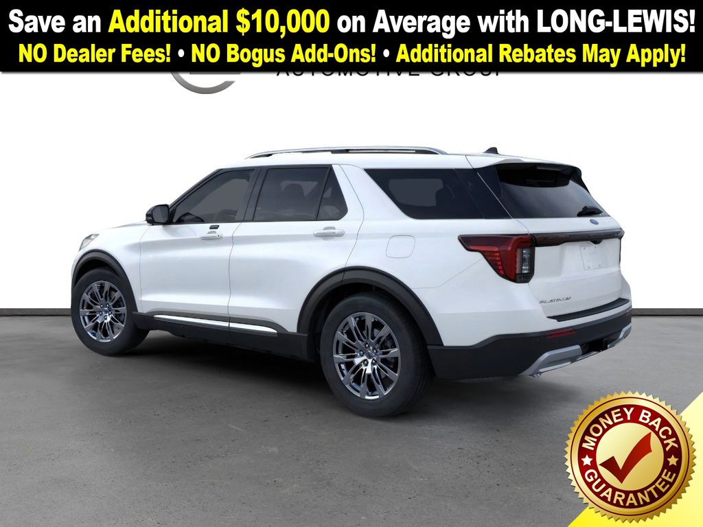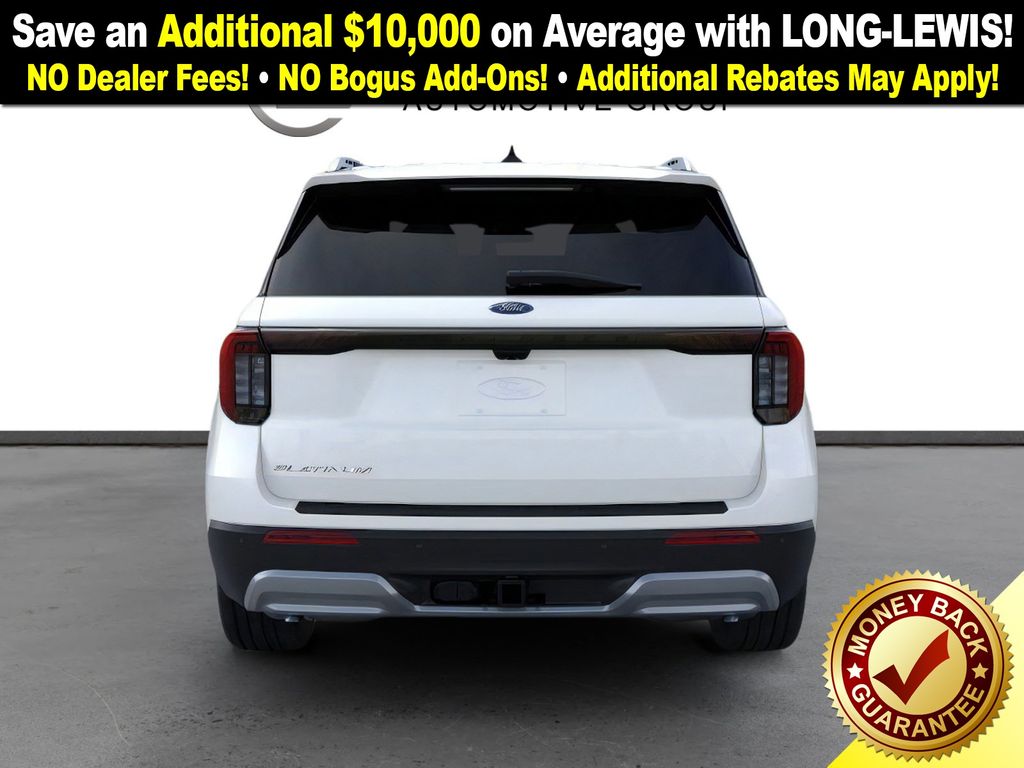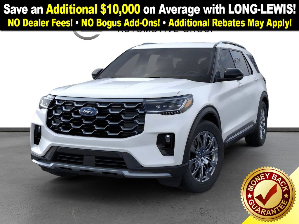 Star White Metallic Tri-Coat 2026 Ford Explorer Platinum NFT RWD 10-Speed Automatic 2.3L EcoBoost I-4 14 Speakers, 3rd row seats: bench, 4-Wheel Disc Brakes, ABS brakes, ActiveX Trimmed Captain's Chairs, Air Conditioning, Alloy wheels, AM/FM radio: SiriusXM with 360L, Apple CarPlay/Android Auto, Auto High-beam Headlights, Auto-dimming door mirrors, Auto-dimming Rear-View mirror, Automatic temperature control, Brake assist, Bumpers: body-color, Compass, Delay-off headlights, Driver door bin, Driver vanity mirror, Dual front impact airbags, Dual front side impact airbags, Electronic Stability Control, Emergency communication system: 911 Assist, Exterior Parking Camera Rear, Four wheel independent suspension, Front anti-roll bar, Front Bucket Seats, Front Center Armrest, Front dual zone A/C, Front fog lights, Front License Plate Bracket, Front reading lights, Fully automatic headlights, Garage door transmitter, Heated door mirrors, Heated front seats, Heated rear seats, Heated steering wheel, Illuminated entry, Knee airbag, Leather steering wheel, Low tire pressure warning, Memory seat, Navigation System, Occupant sensing airbag, Outside temperature display, Overhead airbag, Overhead console, Panic alarm, Panoramic Fixed Glass Roof with Power Shade, Passenger door bin, Passenger vanity mirror, Power door mirrors, Power driver seat, Power Liftgate, Power passenger seat, Power steering, Power windows, Radio data system, Radio: B&O Sound System by Bang & Olufsen with HD, Rain sensing wipers, Rear air conditioning, Rear anti-roll bar, Rear reading lights, Rear window defroster, Rear window wiper, Remote keyless entry, SecuriCode Keyless Entry Keypad, Security system, Speed control, Speed-sensing steering, Speed-Sensitive Wipers, Split folding rear seat, Spoiler, Steering wheel mounted audio controls, Tachometer, Telescoping steering wheel, Tilt steering wheel, Traction control, Trip computer, Turn signal indicator mirrors, Variably intermittent wipers, Ventilated front seats, Wheels: 20" Luster Nickel-Painted Aluminum.
