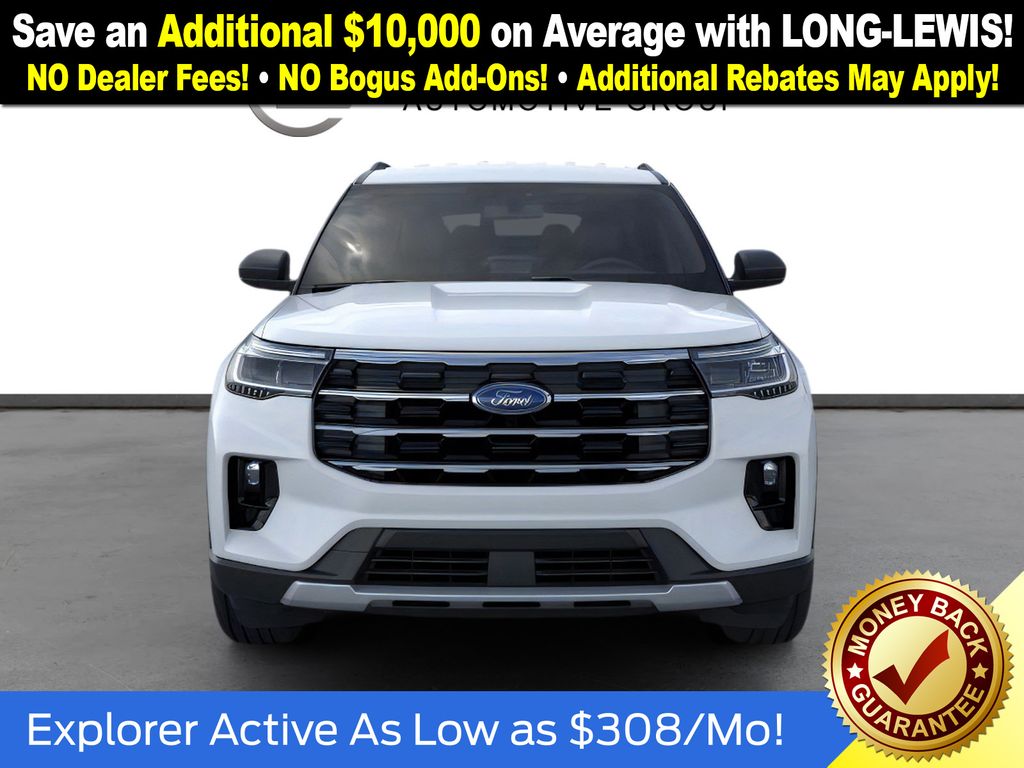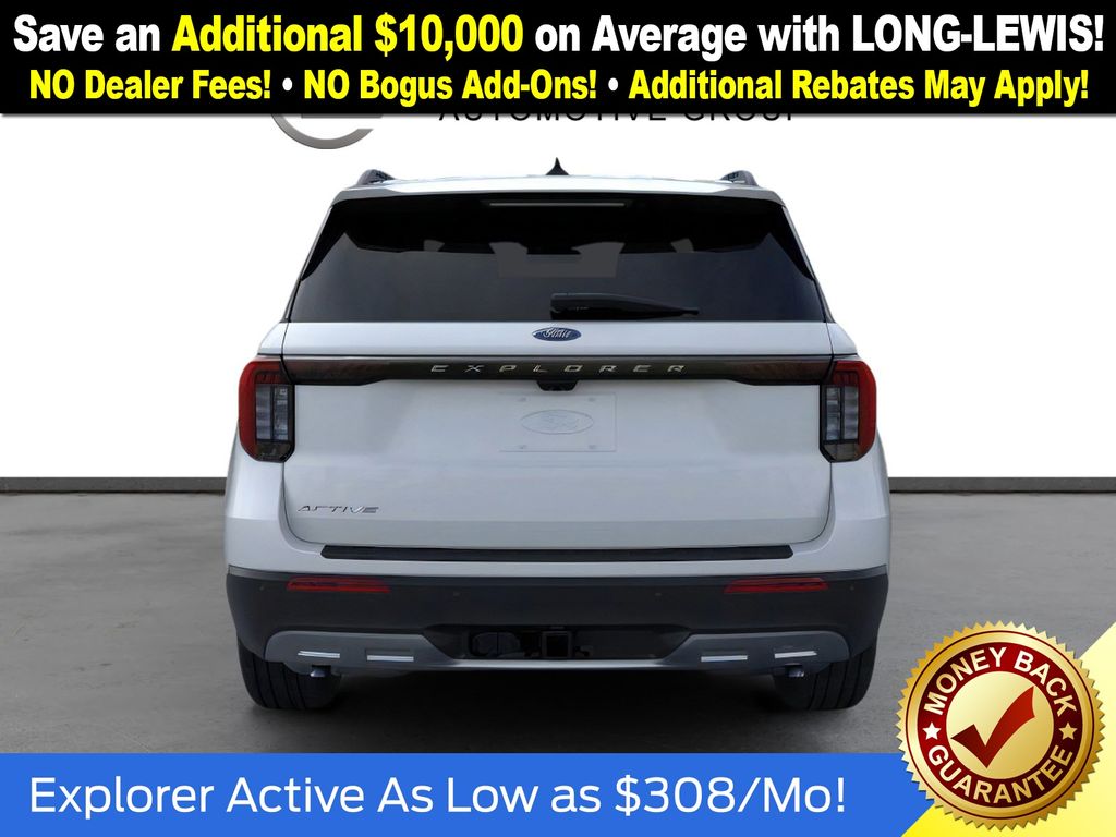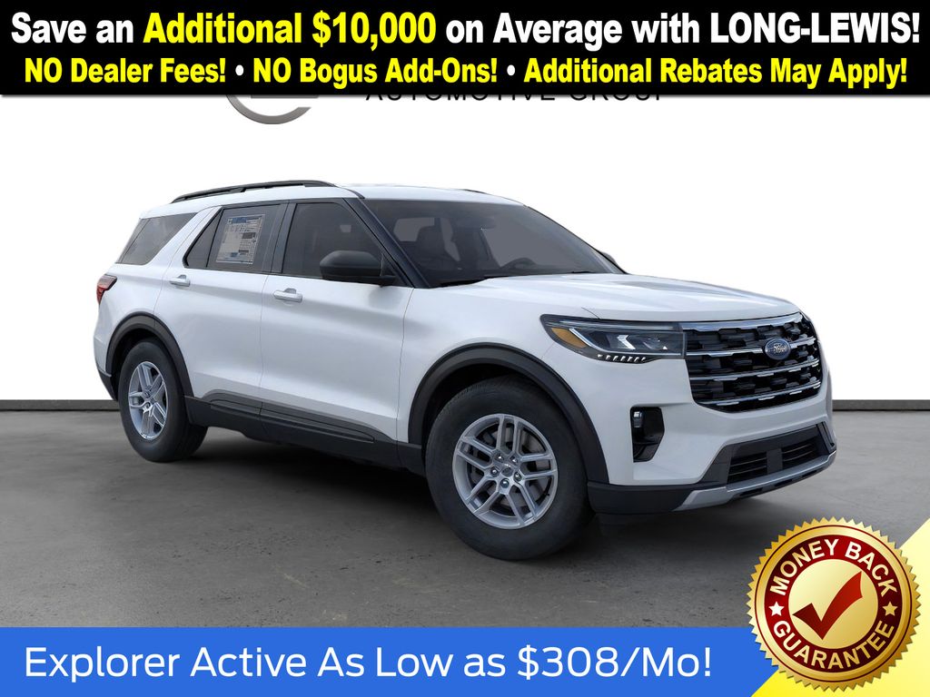 Space White Metallic 2026 Ford Explorer Active NFT RWD 10-Speed Automatic 2.3L EcoBoost I-4 3rd row seats: bench, 4-Wheel Disc Brakes, 6 Speakers, ABS brakes, Air Conditioning, Alloy wheels, AM/FM radio: SiriusXM with 360L, AM/FM Stereo, Apple CarPlay/Android Auto, Auto High-beam Headlights, Automatic temperature control, Brake assist, Bumpers: body-color, Compass, Delay-off headlights, Driver door bin, Driver vanity mirror, Dual front impact airbags, Dual front side impact airbags, Electronic Stability Control, Emergency communication system: 911 Assist, Exterior Parking Camera Rear, Four wheel independent suspension, Front anti-roll bar, Front Bucket Seats, Front Center Armrest, Front dual zone A/C, Front License Plate Bracket, Front reading lights, Fully automatic headlights, Heated door mirrors, Illuminated entry, Knee airbag, Low tire pressure warning, Navigation System, Occupant sensing airbag, Outside temperature display, Overhead airbag, Overhead console, Panic alarm, Passenger door bin, Passenger vanity mirror, Power door mirrors, Power driver seat, Power steering, Power windows, Rear air conditioning, Rear anti-roll bar, Rear reading lights, Rear window defroster, Rear window wiper, Remote keyless entry, Security system, Speed control, Speed-sensing steering, Speed-Sensitive Wipers, Split folding rear seat, Spoiler, Steering wheel mounted audio controls, Tachometer, Telescoping steering wheel, Tilt steering wheel, Traction control, Trip computer, Variably intermittent wipers, Wheels: 18" Sparkle Silver-Painted Aluminum.