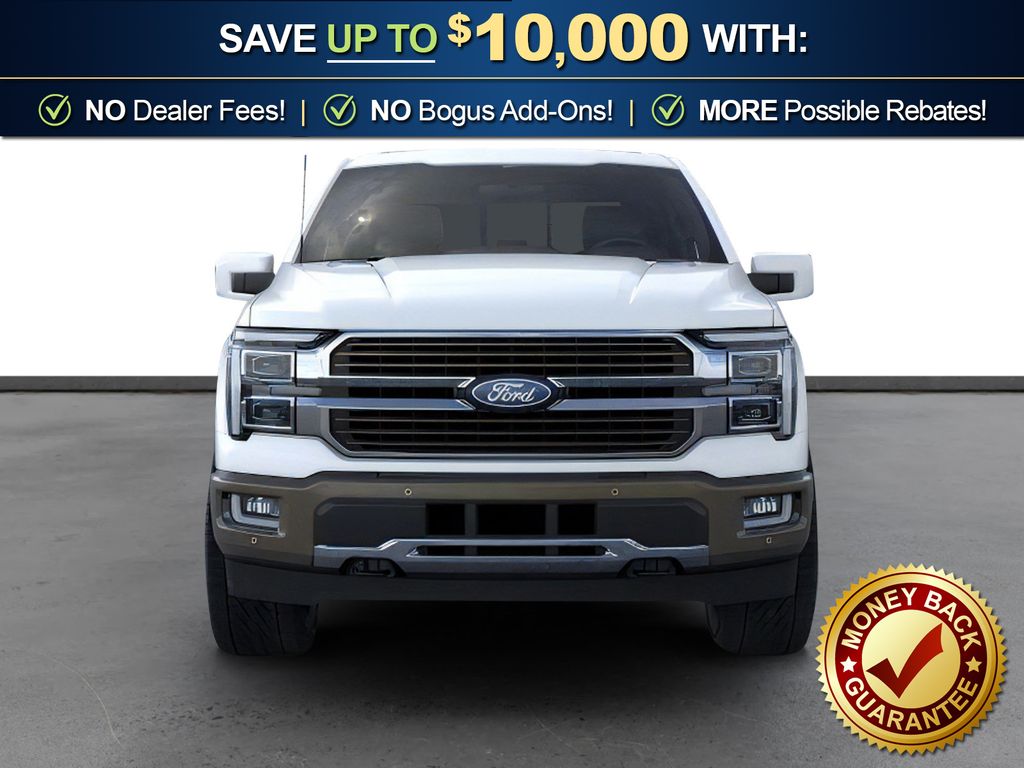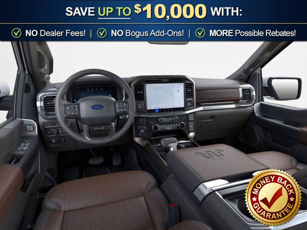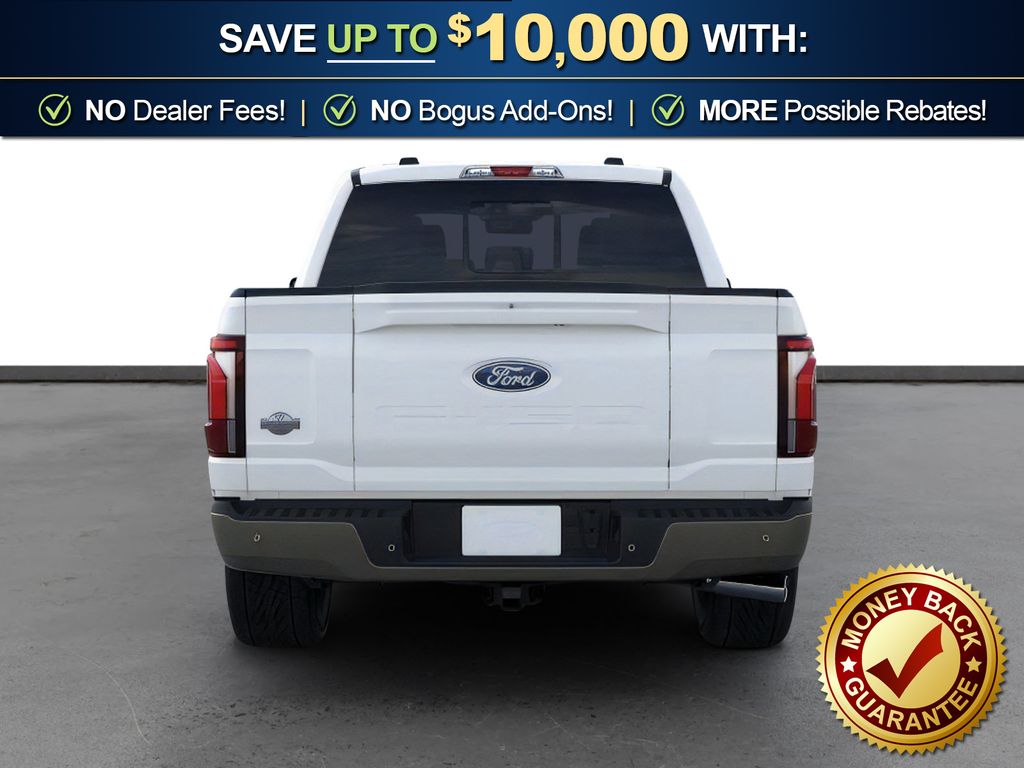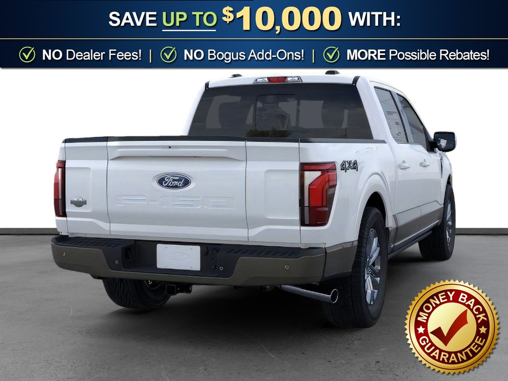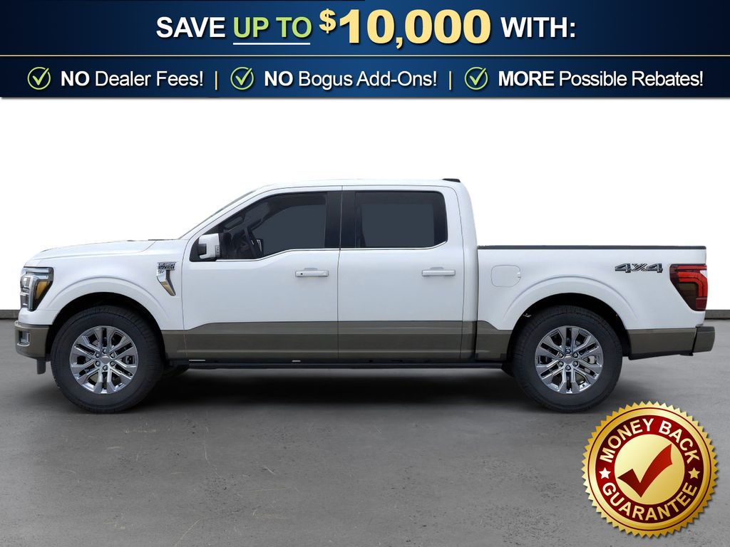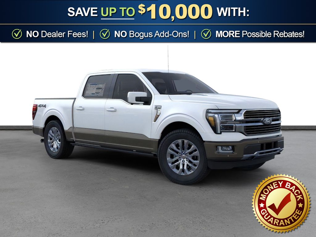 Star White Metallic Tri-Coat 2026 Ford F-150 King Ranch NFT 4WD 10-Speed Automatic 3.5L V6 EcoBoost 4WD, 4-Wheel Disc Brakes, 8 Speakers, ABS brakes, Adjustable pedals, Air Conditioning, Alloy wheels, AM/FM radio: SiriusXM with 360L, Auto High-beam Headlights, Auto tilt-away steering wheel, Auto-dimming door mirrors, Auto-dimming Rear-View mirror, Automatic temperature control, Brake assist, Chrome wheels, Compass, Delay-off headlights, Driver door bin, Driver vanity mirror, Driver's Side SecuriCode Keyless-Entry Keypad, Dual front impact airbags, Dual front side impact airbags, Electronic Locking with 3.55 Axle Ratio, Electronic Stability Control, Emergency communication system: SYNC 4 911 Assist, Ford Connectivity Package (1-Year Included), Front anti-roll bar, Front Bucket Seats, Front Center Armrest, Front dual zone A/C, Front fog lights, Front License Plate Bracket, Front reading lights, Front wheel independent suspension, Fully automatic headlights, Garage door transmitter, Genuine wood dashboard insert, GVWR: 7,400 lbs Payload Package, Heated door mirrors, Heated front seats, Heated rear seats, Heated steering wheel, Illuminated entry, Internet access capable: 5G Modem - Ford Connectivity Package, King Ranch Multicontour Leather Bucket Seats, Leather steering wheel, Low tire pressure warning, Memory seat, Navigation system: Connected Navigation, Occupant sensing airbag, Outside temperature display, Overhead airbag, Overhead console, Panic alarm, Passenger door bin, Passenger vanity mirror, Pedal memory, Power door mirrors, Power driver seat, Power passenger seat, Power steering, Power windows, Pro Access Tailgate, Radio data system, Radio: B&O Sound System by Bang and Olufsen, Rain sensing wipers, Rear reading lights, Rear seat center armrest, Rear step bumper, Rear window defroster, Remote keyless entry, Security system, Speed control, Split folding rear seat, Steering wheel memory, Steering wheel mounted audio controls, SYNC 4 with Enhanced Voice Recognition, Tachometer, Telescoping steering wheel, Tilt steering wheel, Traction control, Trip computer, Turn signal indicator mirrors, Twin Panel Moonroof, Variably intermittent wipers, Ventilated front seats, Wheels: 20" Chrome-Like PVD, 4WD.