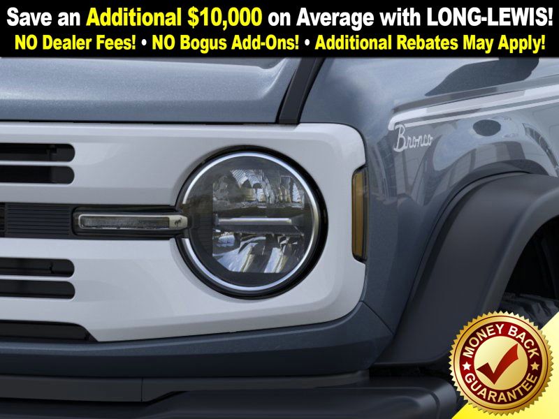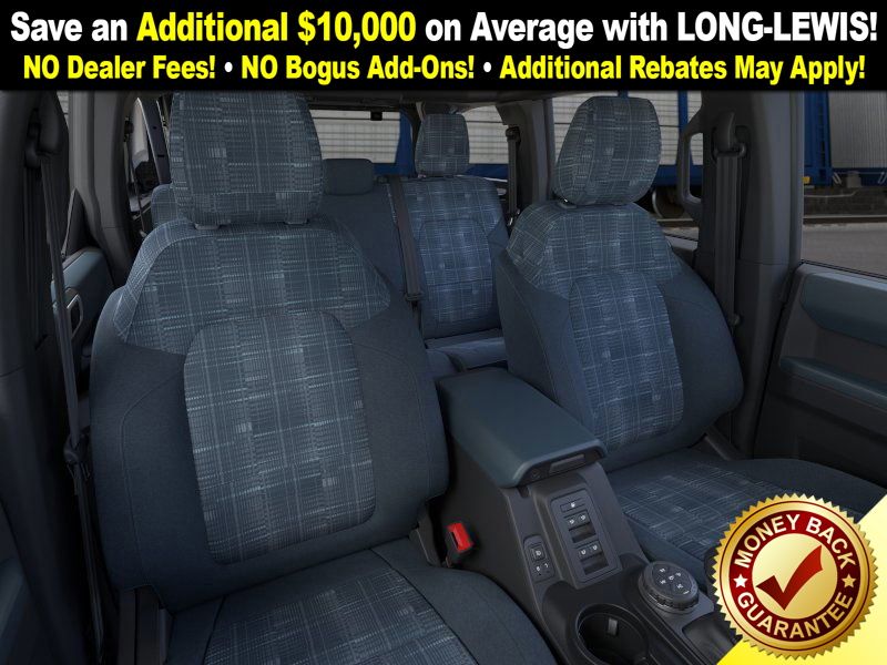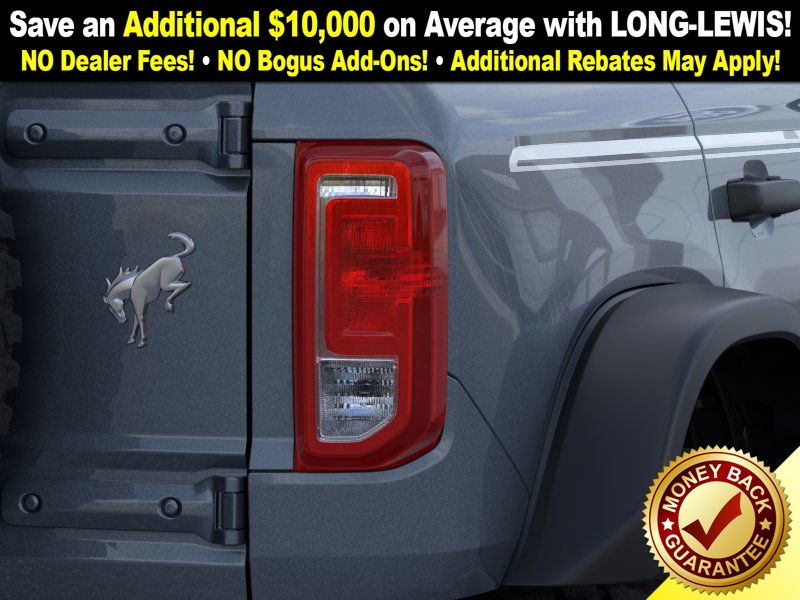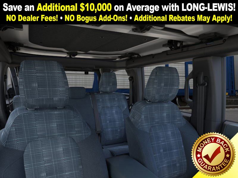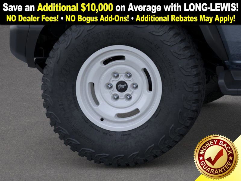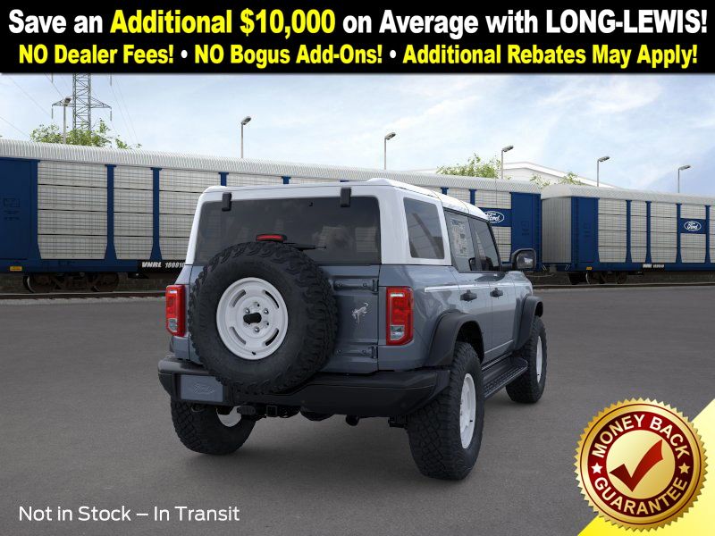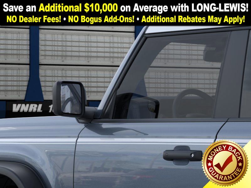 Azure Gray Metallic Tri-Coat 2025 Ford Bronco Heritage Edition NFT 4WD 10-Speed Automatic 2.7L EcoBoost V6 4-Wheel Disc Brakes, 7 Speakers, ABS brakes, Air Conditioning, Alloy wheels, AM/FM radio: SiriusXM with 360L, AM/FM Stereo, Auto High-beam Headlights, Auto-dimming Rear-View mirror, Automatic temperature control, Brake assist, Compass, Connected Navigation, Convertible HardTop, Convertible roof lining, Delay-off headlights, Driver door bin, Driver vanity mirror, Dual front impact airbags, Dual front side impact airbags, Electronic Stability Control, Emergency communication system: 911 Assist, Exterior Parking Camera Rear, Front anti-roll bar, Front Bucket Seats, Front Center Armrest, Front dual zone A/C, Front fog lights, Front License Plate Bracket, Front reading lights, Front wheel independent suspension, Fully automatic headlights, Glass rear window, Heated door mirrors, Heated front seats, Heated steering wheel, Illuminated entry, Integrated roll-over protection, Internet access capable: FordPass Connect, Leather Shift Knob, Low tire pressure warning, Navigation system: Connected Navigation, Occupant sensing airbag, Outside temperature display, Overhead airbag, Overhead console, Panic alarm, Passenger door bin, Passenger vanity mirror, Plaid Cloth Front Heated Bucket Seats, Power door mirrors, Power steering, Power windows, Radio data system, Rear window defroster, Rear window wiper, Remote keyless entry, Security system, SiriusXM w/360L, Speed control, Split folding rear seat, Steering wheel mounted audio controls, SYNC 4, Tachometer, Telescoping steering wheel, Tilt steering wheel, Traction control, Trip computer, Variably intermittent wipers, Wheels: 17" Unique White.