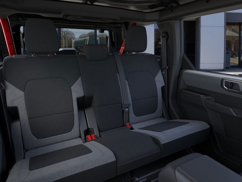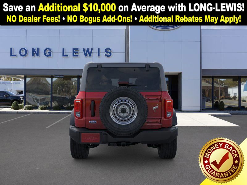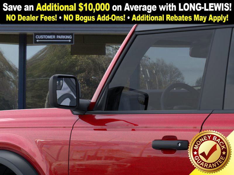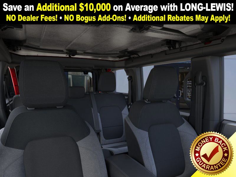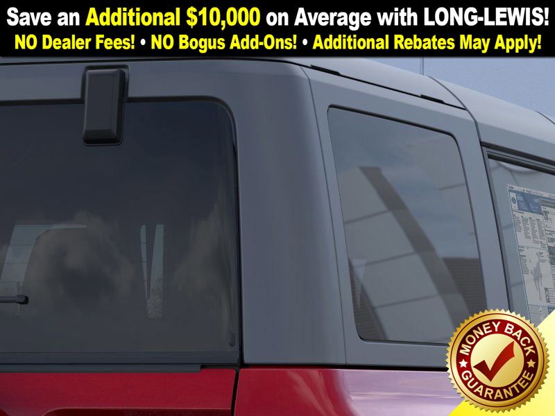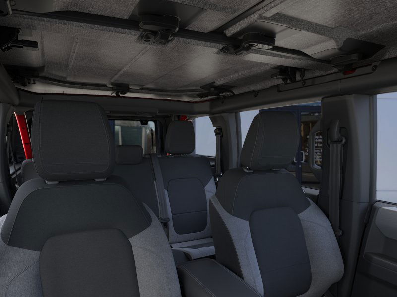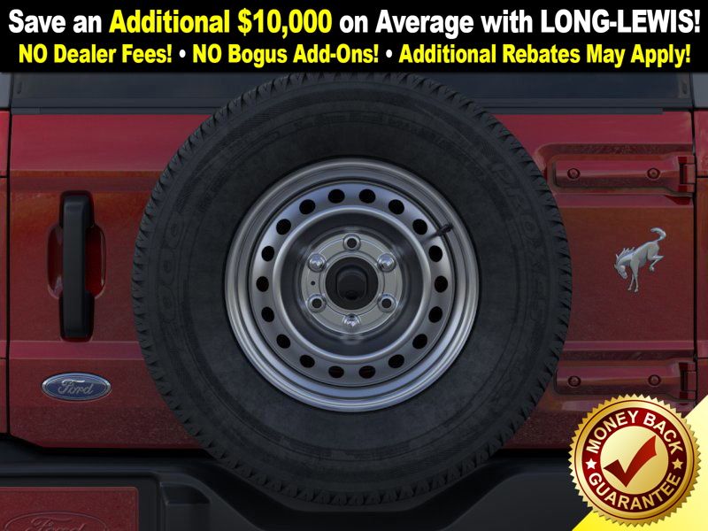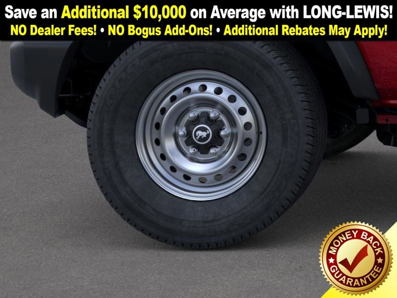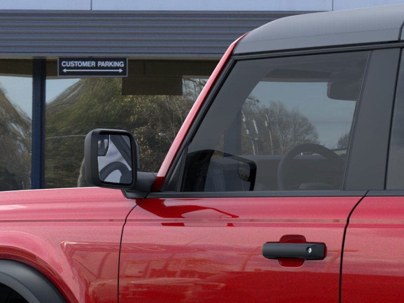 Ruby Red Metallic Tinted Clearcoat 2025 Ford Bronco fctp 4WD 10-Speed Automatic 2.3L EcoBoost I-4 4-Wheel Disc Brakes, 4.46 Axle Ratio, 7 Speakers, ABS brakes, Air Conditioning, AM/FM radio: SiriusXM with 360L, AM/FM Stereo, Auto High-beam Headlights, Brake assist, Carbonized Gray Molded-In-Color Hard Top, Cloth Bucket Seats, Compass, Delay-off headlights, Driver door bin, Driver vanity mirror, Dual front impact airbags, Dual front side impact airbags, Electronic Stability Control, Emergency communication system: 911 Assist, Exterior Parking Camera Rear, Front anti-roll bar, Front Bucket Seats, Front Center Armrest, Front License Plate Bracket, Front reading lights, Front wheel independent suspension, Fully automatic headlights, Hard Top Sound Deadening Headliner, Heated door mirrors, Illuminated entry, Integrated roll-over protection, Low tire pressure warning, Occupant sensing airbag, Outside temperature display, Overhead airbag, Overhead console, Panic alarm, Passenger door bin, Passenger vanity mirror, Power door mirrors, Power steering, Power windows, Radio data system, Rear-Window Defroster & Washer, Remote keyless entry, Security system, SiriusXM w/360L, Speed control, Split folding rear seat, Steering wheel mounted audio controls, SYNC 4, Tachometer, Telescoping steering wheel, Tilt steering wheel, Traction control, Trip computer, Variably intermittent wipers, Wheels: 16" Bright Polished Silver-Painted Steel.
