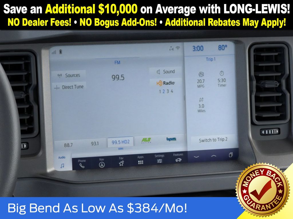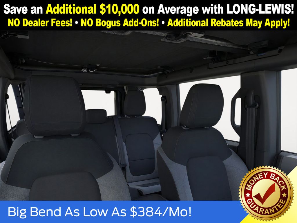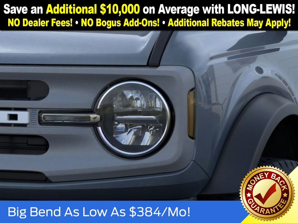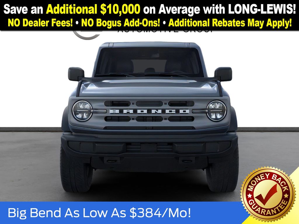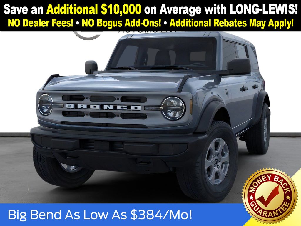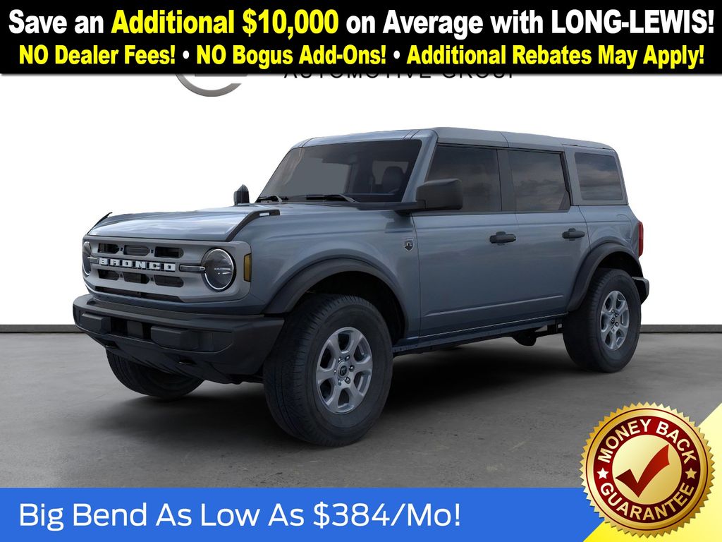 Dealer Discount of $1,364 off MSRP Azure Gray Metallic Tri-Coat 2025 Ford Bronco Big Bend NFT 4WD 2.3L EcoBoost I-4 4-Wheel Disc Brakes, 4.46 Axle Ratio, 7 Speakers, ABS brakes, Air Conditioning, Alloy wheels, AM/FM radio: SiriusXM with 360L, AM/FM Stereo, Auto High-beam Headlights, Brake assist, Cloth Bucket Seats, Compass, Delay-off headlights, Driver door bin, Driver vanity mirror, Dual front impact airbags, Dual front side impact airbags, Electronic Stability Control, Emergency communication system: 911 Assist, Exterior Parking Camera Rear, Front anti-roll bar, Front Bucket Seats, Front Center Armrest, Front reading lights, Front wheel independent suspension, Fully automatic headlights, Heated door mirrors, Illuminated entry, Integrated roll-over protection, Internet access capable: FordPass Connect, Leather Shift Knob, Low tire pressure warning, Occupant sensing airbag, Outside temperature display, Overhead airbag, Overhead console, Panic alarm, Passenger door bin, Passenger vanity mirror, Power door mirrors, Power steering, Power windows, Radio data system, Remote keyless entry, Security system, SiriusXM w/360L, Speed control, Split folding rear seat, Steering wheel mounted audio controls, SYNC 4, Tachometer, Telescoping steering wheel, Tilt steering wheel, Traction control, Trip computer, Variably intermittent wipers, Wheels: 17" Carbonized Gray-Painted Aluminum. Price includes: $2500 - Retail Customer Cash. Exp. 03/31/2026