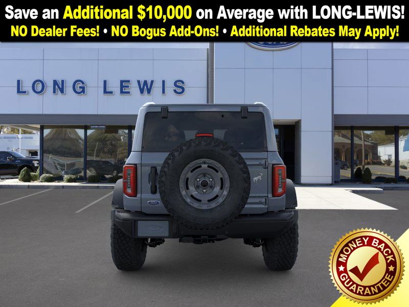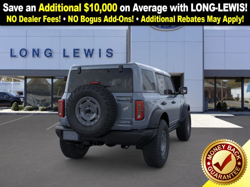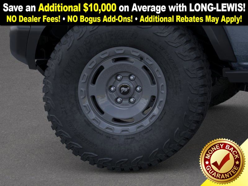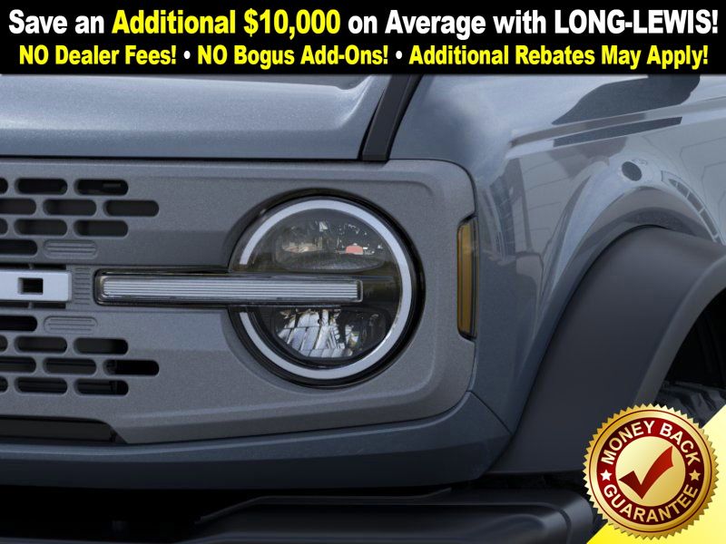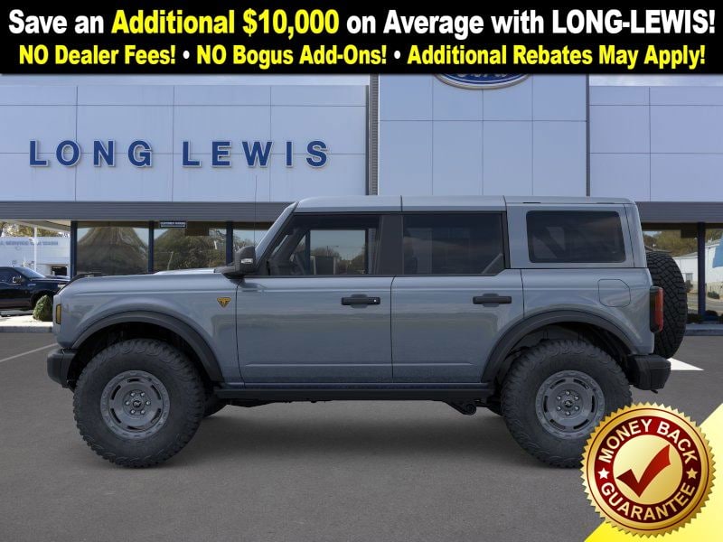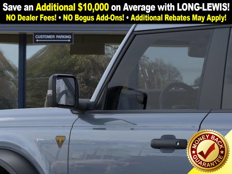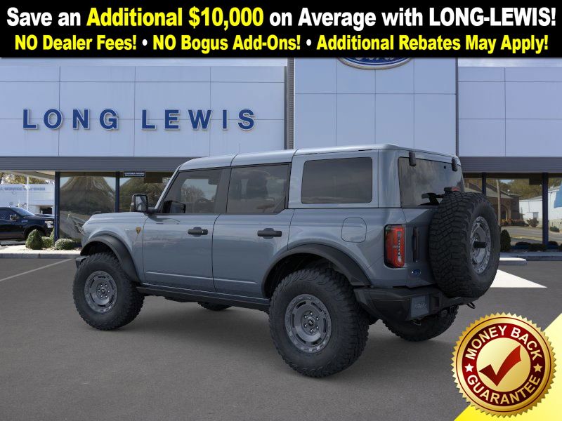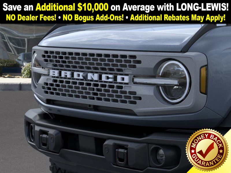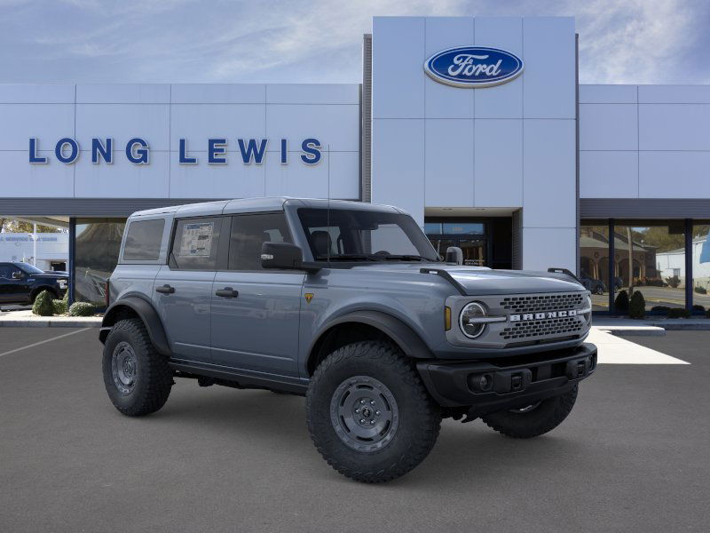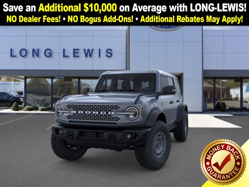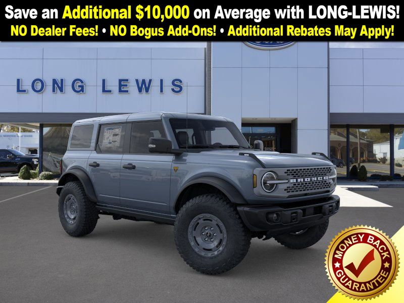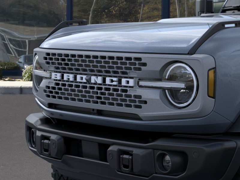Azure Gray Metallic Tri-Coat 2025 Ford Bronco Badlands FCT 4WD 10-Speed Automatic 2.7L EcoBoost V6 4-Wheel Disc Brakes, 7 Speakers, ABS brakes, Air Conditioning, Alloy wheels, AM/FM radio: SiriusXM with 360L, AM/FM Stereo, Auto High-beam Headlights, Auto-dimming Rear-View mirror, Body Color-Painted Hard Top, Brake assist, Compass, Delay-off headlights, Driver door bin, Driver vanity mirror, Dual front impact airbags, Dual front side impact airbags, Electronic Stability Control, Emergency communication system: 911 Assist, Exterior Parking Camera Rear, Front anti-roll bar, Front Bucket Seats, Front Center Armrest, Front fog lights, Front License Plate Bracket, Front reading lights, Front wheel independent suspension, Fully automatic headlights, Hard Top Sound Deadening Headliner, Heated door mirrors, Heated front seats, Heated steering wheel, High Clearance Fender Flares, High Clearance Suspension, Illuminated entry, Integrated roll-over protection, Leather Shift Knob, Low tire pressure warning, Marine Grade Vinyl Heated Bucket Seats, Occupant sensing airbag, Outside temperature display, Overhead airbag, Overhead console, Panic alarm, Passenger door bin, Passenger vanity mirror, Position-Sensitive Bilstein Shock Absorbers, Power door mirrors, Power steering, Power windows, Radio data system, Rear-Window Defroster & Washer, Remote keyless entry, Sasquatch Package, Security system, SiriusXM w/360L, Speed control, Split folding rear seat, Steering wheel mounted audio controls, SYNC 4, Tachometer, Telescoping steering wheel, Tilt steering wheel, Traction control, Trip computer, Variably intermittent wipers, Voltmeter, Wheels: 17" Carbonized Gray Painted Aluminum, Wheels: 17" Carbonized Gray-Painted Aluminum.
