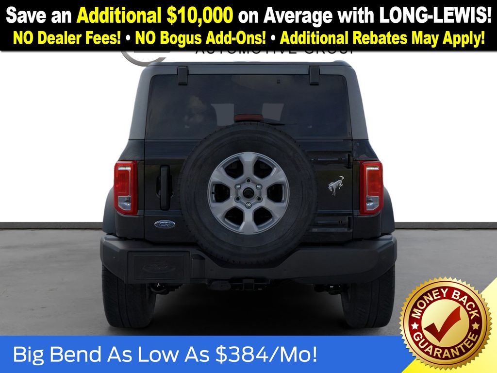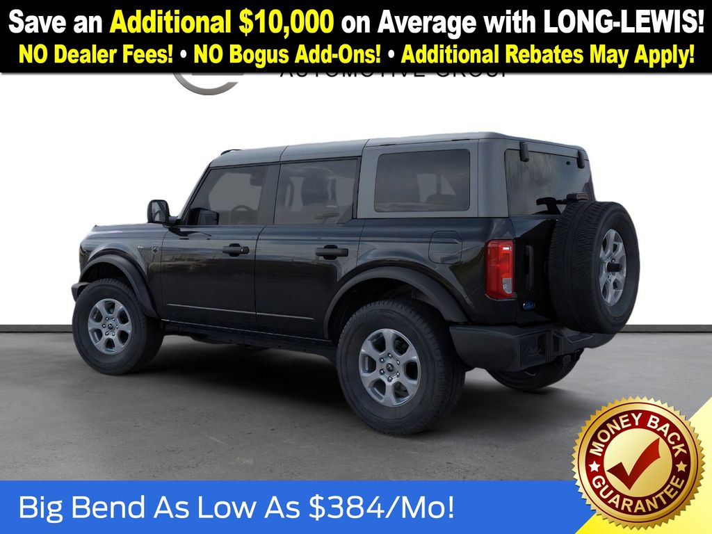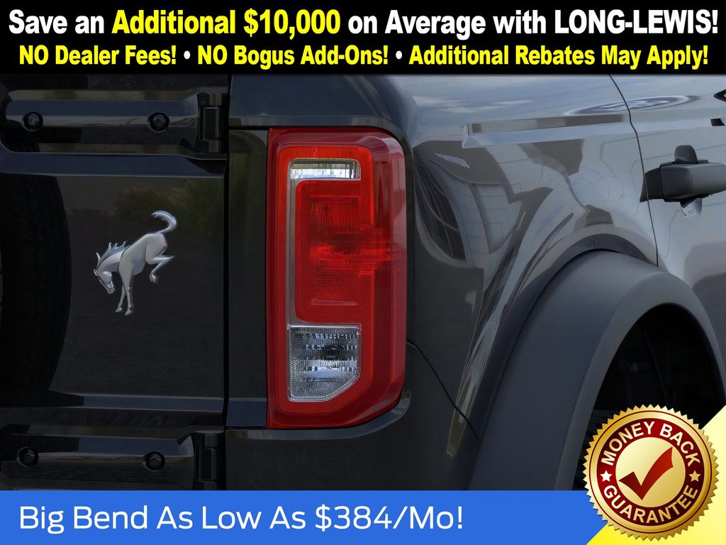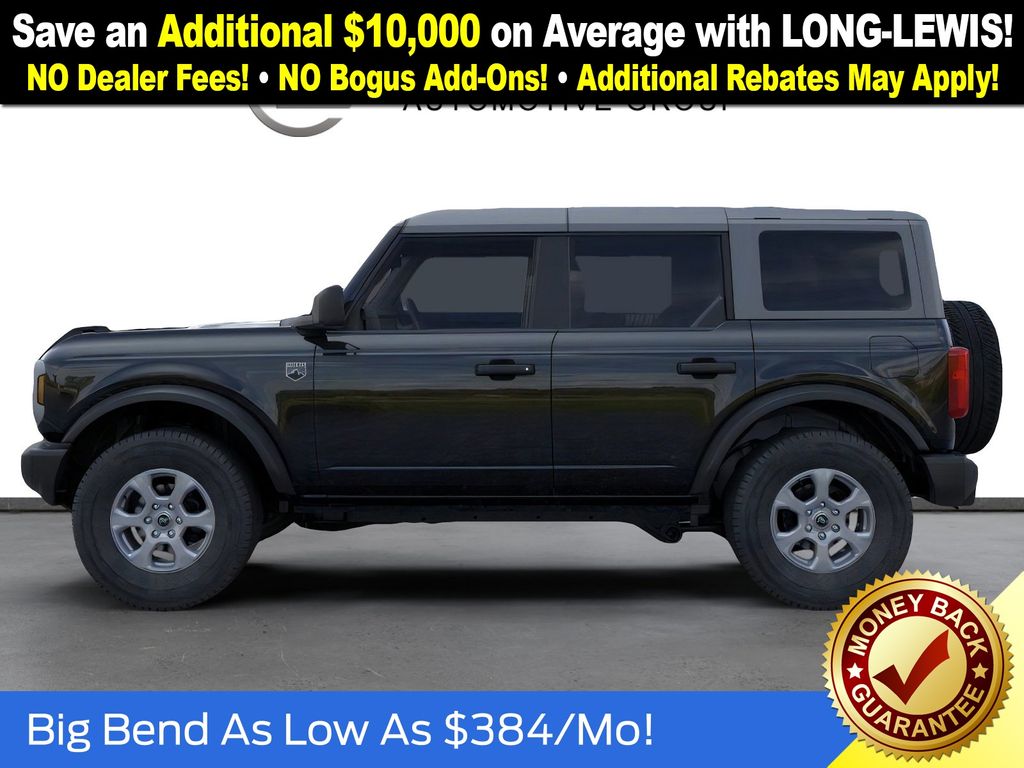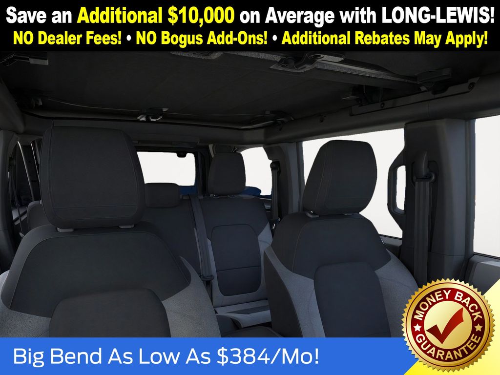 Dealer Discount of $1,260 off MSRP Shadow Black 2025 Ford Bronco Big Bend NFT 4WD 2.3L EcoBoost I-4 4-Wheel Disc Brakes, 4.46 Axle Ratio, 7 Speakers, ABS brakes, Air Conditioning, Alloy wheels, AM/FM radio: SiriusXM with 360L, AM/FM Stereo, Auto High-beam Headlights, Brake assist, Cloth Bucket Seats, Compass, Delay-off headlights, Driver door bin, Driver vanity mirror, Dual front impact airbags, Dual front side impact airbags, Electronic Stability Control, Emergency communication system: 911 Assist, Exterior Parking Camera Rear, Front anti-roll bar, Front Bucket Seats, Front Center Armrest, Front reading lights, Front wheel independent suspension, Fully automatic headlights, Heated door mirrors, Illuminated entry, Integrated roll-over protection, Internet access capable: FordPass Connect, Leather Shift Knob, Low tire pressure warning, Occupant sensing airbag, Outside temperature display, Overhead airbag, Overhead console, Panic alarm, Passenger door bin, Passenger vanity mirror, Power door mirrors, Power steering, Power windows, Radio data system, Remote keyless entry, Security system, SiriusXM w/360L, Speed control, Split folding rear seat, Steering wheel mounted audio controls, SYNC 4, Tachometer, Telescoping steering wheel, Tilt steering wheel, Traction control, Trip computer, Variably intermittent wipers, Wheels: 17" Carbonized Gray-Painted Aluminum.