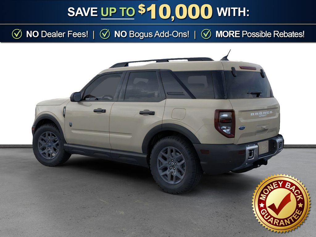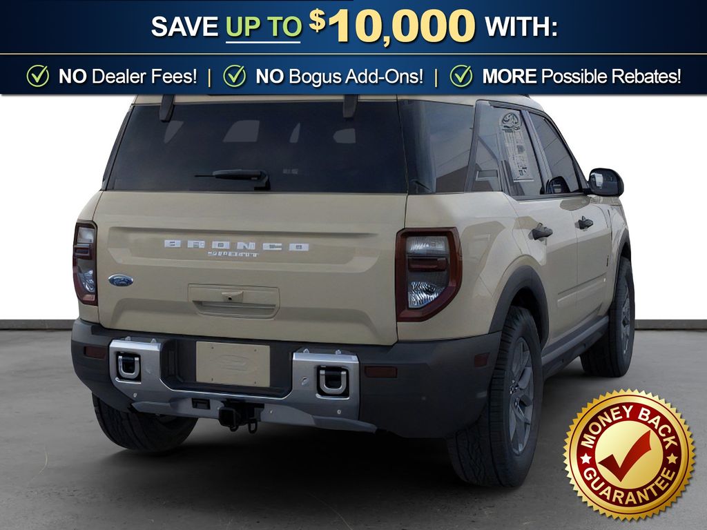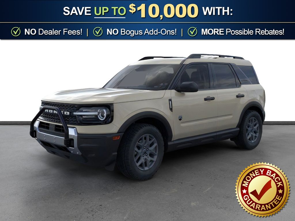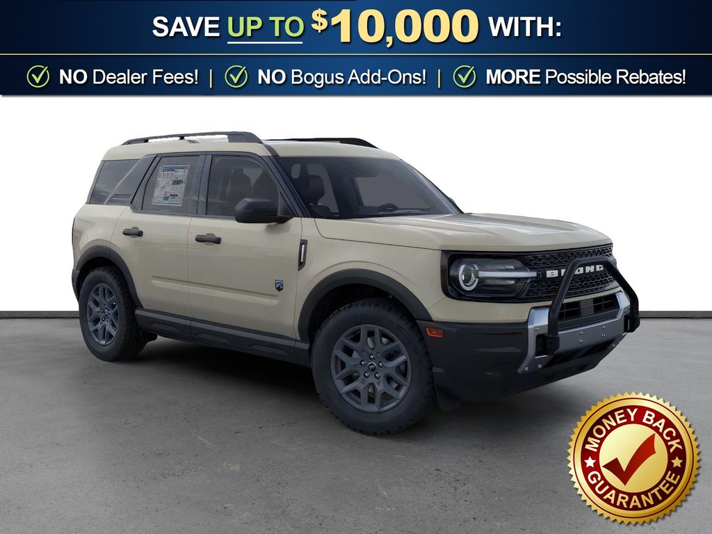 Desert Sand 2025 Ford Bronco Sport Big Bend FCT 4WD 8-Speed Automatic 1.5L EcoBoost 110V/400W AC Power Outlet, 2nd Row Carpeted Seatback, 4-Wheel Disc Brakes, 6 Speakers, ABS brakes, Air Conditioning, Alloy wheels, AM/FM radio: SiriusXM, AM/FM Stereo, Auto High-beam Headlights, Automatic temperature control, Auxiliary Switches & Wiring, Black Diamond Off-Road Package, Brake assist, Brush Guard, Cargo Management System (Shelf/Divider/Table), Cargo Mat, Class II Trailer Tow Pack w/Trailer Sway Control, Cloth w/Easy-to-Clean Front Bucket Seats, Compass, Delay-off headlights, Driver door bin, Driver vanity mirror, Dual front impact airbags, Dual front side impact airbags, Electronic Stability Control, Emergency communication system: SYNC 4 911 Assist, Fender Tie Downs, Four wheel independent suspension, Front & Rear Black Bumpers, Front anti-roll bar, Front Bucket Seats, Front Center Armrest, Front License Plate Bracket, Front reading lights, Fully automatic headlights, Heated door mirrors, Illuminated entry, Interior Grab Handle, Knee airbag, Low tire pressure warning, Occupant sensing airbag, Outside temperature display, Overhead airbag, Overhead console, Panic alarm, Passenger door bin, Passenger vanity mirror, Power door mirrors, Power steering, Power windows, Radio data system, Rear anti-roll bar, Rear Parking Sensors, Rear reading lights, Rear seat center armrest, Rear window defroster, Rear window wiper, Recovery Hooks, Remote keyless entry, Security system, SiriusXM, Speed control, Speed-sensing steering, Speed-Sensitive Wipers, Split folding rear seat, Steering wheel mounted audio controls, SYNC 4 w/Enhanced Voice Recognition, Tachometer, Telescoping steering wheel, Tilt steering wheel, Traction control, Trip computer, Variably intermittent wipers, Wheels: 17" Carbonized Gray Painted Aluminum, Wheels: 17" Carbonized Gray-Painted Aluminum.