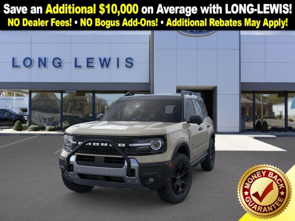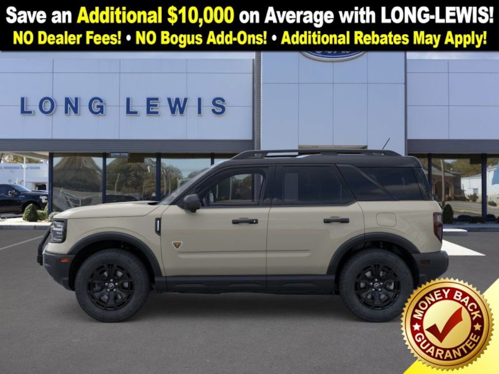 Desert Sand 2025 Ford Bronco Sport Badlands 4WD 8-Speed Automatic EcoBoost 2.0L I4 GTDi DOHC Turbocharged VCT 4-Wheel Disc Brakes, 6 Speakers, 850W Engine Cooling Fan, ABS brakes, Air Conditioning, Alloy wheels, AM/FM radio: SiriusXM, AM/FM Stereo, Auto High-beam Headlights, Auto-dimming Rear-View mirror, Automatic temperature control, Auxiliary Switches & Wiring, B&O Sound System by Bang & Olufsen, Badlands Tech Package, Brake assist, Brush Guard, Compass, Connected Navigation, Delay-off headlights, Driver door bin, Driver vanity mirror, Dual front impact airbags, Dual front side impact airbags, Electronic Stability Control, Emergency communication system: SYNC 4 911 Assist, Fender Tie Downs, Four wheel independent suspension, Front anti-roll bar, Front Bucket Seats, Front Center Armrest, Front fog lights, Front License Plate Bracket, Front reading lights, Fully automatic headlights, Garage door transmitter, HD Radio, Heated door mirrors, Heated front seats, Heated steering wheel, High Clearance Fender Flares, HOSS 3.0 Off-Road Suspension, Illuminated entry, Knee airbag, Leather Trimmed Front Bucket Seats, Low tire pressure warning, Memory seat, Occupant sensing airbag, Outside temperature display, Overhead airbag, Overhead console, Panic alarm, Passenger door bin, Passenger vanity mirror, Power door mirrors, Power driver seat, Power Moonroof, Power passenger seat, Power steering, Power windows, Radio data system, Rear anti-roll bar, Rear Black Bumpers, Rear reading lights, Rear seat center armrest, Rear window defroster, Rear window wiper, Recovery Hooks, Remote keyless entry, Sasquatch Badlands Package, Security system, SiriusXM, Speed control, Speed-sensing steering, Speed-Sensitive Wipers, Split folding rear seat, Steering wheel mounted audio controls, SYNC 4 w/Enhanced Voice Recognition, Tachometer, Telescoping steering wheel, Tilt steering wheel, Traction control, Trip computer, Variably intermittent wipers, Wheels: 17" Ebony Black-Painted Aluminum, Wheels: 17" Matte Black-Painted Aluminum.