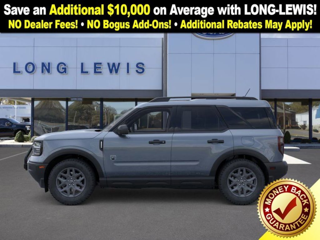 Azure Gray Metallic Tri-Coat 2025 Ford Bronco Sport Big Bend 4WD 8-Speed Automatic 1.5L EcoBoost 110V/400W AC Power Outlet, 2nd Row Carpeted Seatback, 4-Wheel Disc Brakes, 6 Speakers, ABS brakes, Air Conditioning, Alloy wheels, AM/FM radio: SiriusXM, AM/FM Stereo, Auto High-beam Headlights, Automatic temperature control, Auxiliary Switches & Wiring, Black Diamond Off-Road Package, Brake assist, Brush Guard, Cargo Management System (Shelf/Divider/Table), Cargo Mat, Class II Trailer Tow Pack w/Trailer Sway Control, Cloth w/Easy-to-Clean Front Bucket Seats, Compass, Delay-off headlights, Driver door bin, Driver vanity mirror, Dual front impact airbags, Dual front side impact airbags, Electronic Stability Control, Emergency communication system: SYNC 4 911 Assist, Fender Tie Downs, Four wheel independent suspension, Front & Rear Black Bumpers, Front anti-roll bar, Front Bucket Seats, Front Center Armrest, Front License Plate Bracket, Front reading lights, Fully automatic headlights, Heated door mirrors, Illuminated entry, Interior Grab Handle, Knee airbag, Low tire pressure warning, Occupant sensing airbag, Outside temperature display, Overhead airbag, Overhead console, Panic alarm, Passenger door bin, Passenger vanity mirror, Power door mirrors, Power steering, Power windows, Radio data system, Rear anti-roll bar, Rear Parking Sensors, Rear reading lights, Rear seat center armrest, Rear window defroster, Rear window wiper, Recovery Hooks, Remote keyless entry, Security system, SiriusXM, Speed control, Speed-sensing steering, Speed-Sensitive Wipers, Split folding rear seat, Steering wheel mounted audio controls, SYNC 4 w/Enhanced Voice Recognition, Tachometer, Telescoping steering wheel, Tilt steering wheel, Traction control, Trip computer, Variably intermittent wipers, Wheels: 17" Carbonized Gray Painted Aluminum, Wheels: 17" Carbonized Gray-Painted Aluminum.
