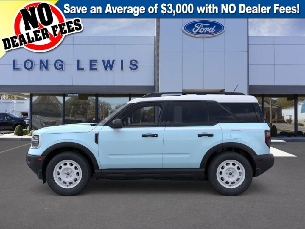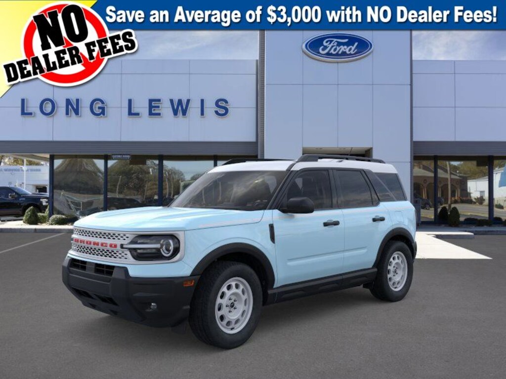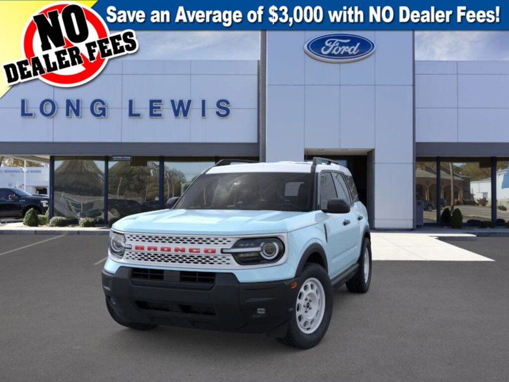 Robins Egg Blue 2025 Ford Bronco Sport Heritage fctp 4WD 8-Speed Automatic 1.5L EcoBoost 4-Wheel Disc Brakes, 6 Speakers, ABS brakes, Air Conditioning, Alloy wheels, AM/FM radio: SiriusXM, AM/FM Stereo, Auto High-beam Headlights, Automatic temperature control, Brake assist, Compass, Convenience Package, Delay-off headlights, Driver door bin, Driver vanity mirror, Dual front impact airbags, Dual front side impact airbags, Electronic Stability Control, Emergency communication system: SYNC 4 911 Assist, Four wheel independent suspension, Front anti-roll bar, Front Bucket Seats, Front Center Armrest, Front License Plate Bracket, Front reading lights, Fully automatic headlights, Heated 8-Way Power Driver's Seat, Heated door mirrors, Illuminated entry, Knee airbag, LED Fog Lamps, Low tire pressure warning, Occupant sensing airbag, Outside temperature display, Overhead airbag, Overhead console, Panic alarm, Passenger door bin, Passenger vanity mirror, Plaid Cloth Front Bucket Seats, Power door mirrors, Power steering, Power windows, Premium Wrapped Steering Wheel, Radio data system, Rear anti-roll bar, Rear Parking Sensors, Rear reading lights, Rear seat center armrest, Rear window defroster, Rear window wiper, Remote keyless entry, Security system, SiriusXM, Speed control, Speed-sensing steering, Speed-Sensitive Wipers, Split folding rear seat, Steering wheel mounted audio controls, SYNC 4 w/Enhanced Voice Recognition, Tachometer, Telescoping steering wheel, Tilt steering wheel, Traction control, Trip computer, Universal Garage Door Opener (UGDO), Variably intermittent wipers, Wheels: 17" Oxford White-Painted Aluminum.