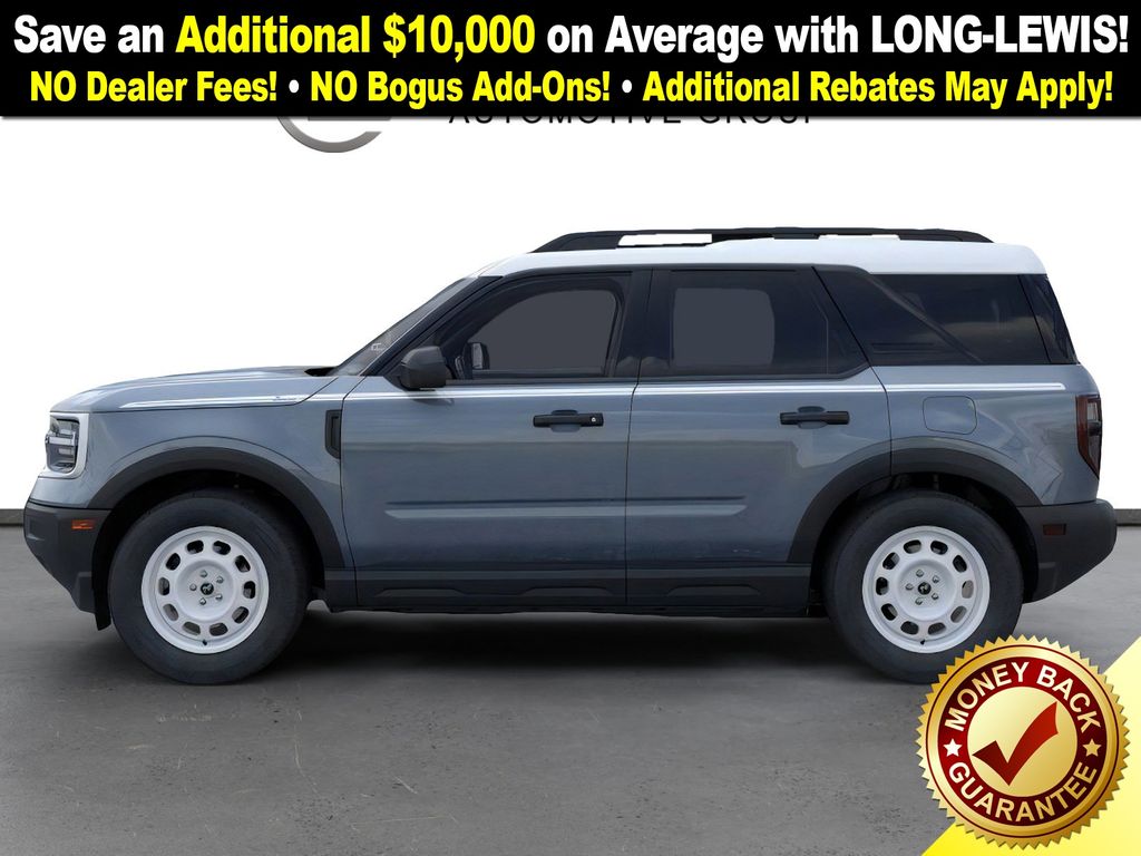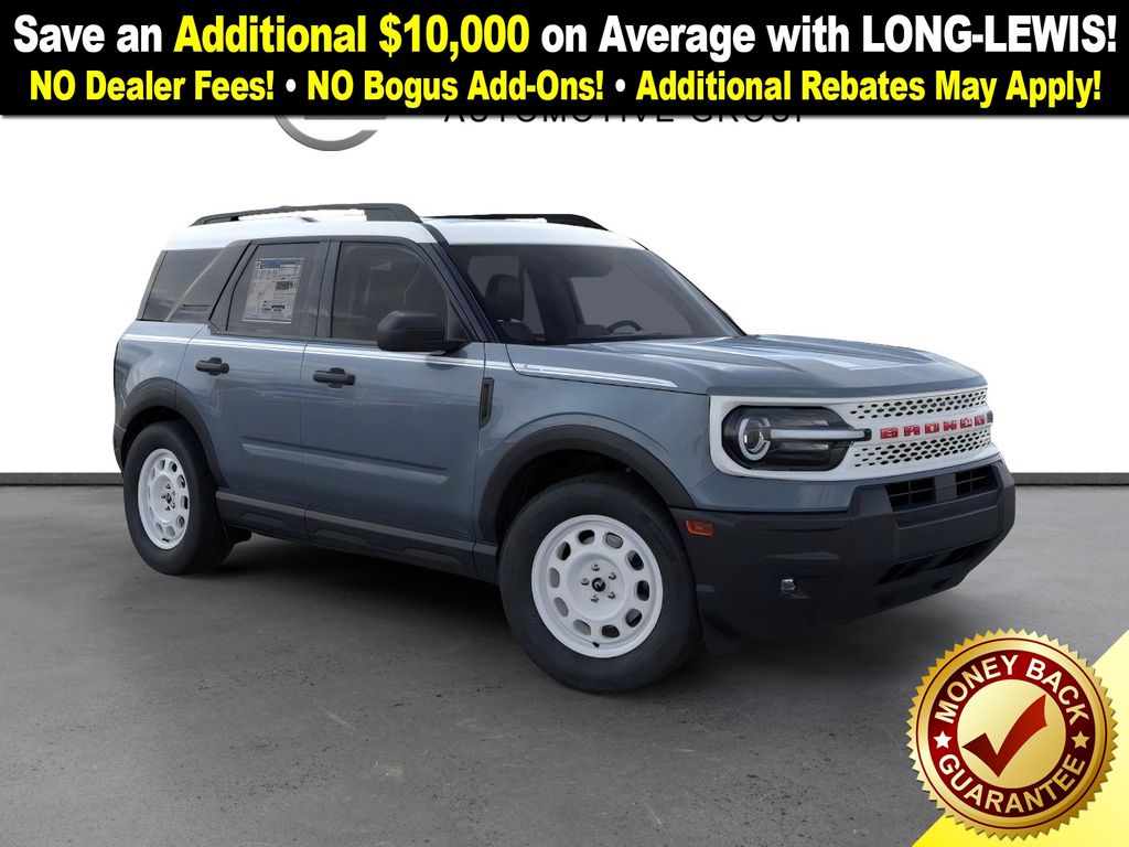 Azure Gray Metallic Tri-Coat 2025 Ford Bronco Sport Heritage fctp 4WD 8-Speed Automatic 1.5L EcoBoost 4-Wheel Disc Brakes, 6 Speakers, ABS brakes, Air Conditioning, Alloy wheels, AM/FM radio: SiriusXM, AM/FM Stereo, Auto High-beam Headlights, Automatic temperature control, Brake assist, Compass, Convenience Package, Delay-off headlights, Driver door bin, Driver vanity mirror, Dual front impact airbags, Dual front side impact airbags, Electronic Stability Control, Emergency communication system: SYNC 4 911 Assist, Four wheel independent suspension, Front anti-roll bar, Front Bucket Seats, Front Center Armrest, Front License Plate Bracket, Front reading lights, Fully automatic headlights, Heated 8-Way Power Driver's Seat, Heated door mirrors, Illuminated entry, Knee airbag, LED Fog Lamps, Low tire pressure warning, Occupant sensing airbag, Outside temperature display, Overhead airbag, Overhead console, Panic alarm, Passenger door bin, Passenger vanity mirror, Plaid Cloth Front Bucket Seats, Power door mirrors, Power Moonroof, Power steering, Power windows, Premium Wrapped Steering Wheel, Radio data system, Rear anti-roll bar, Rear Parking Sensors, Rear reading lights, Rear seat center armrest, Rear window defroster, Rear window wiper, Remote keyless entry, Security system, SiriusXM, Speed control, Speed-sensing steering, Speed-Sensitive Wipers, Split folding rear seat, Steering wheel mounted audio controls, SYNC 4 w/Enhanced Voice Recognition, Tachometer, Telescoping steering wheel, Tilt steering wheel, Traction control, Trip computer, Universal Garage Door Opener (UGDO), Variably intermittent wipers, Wheels: 17" Oxford White-Painted Aluminum.