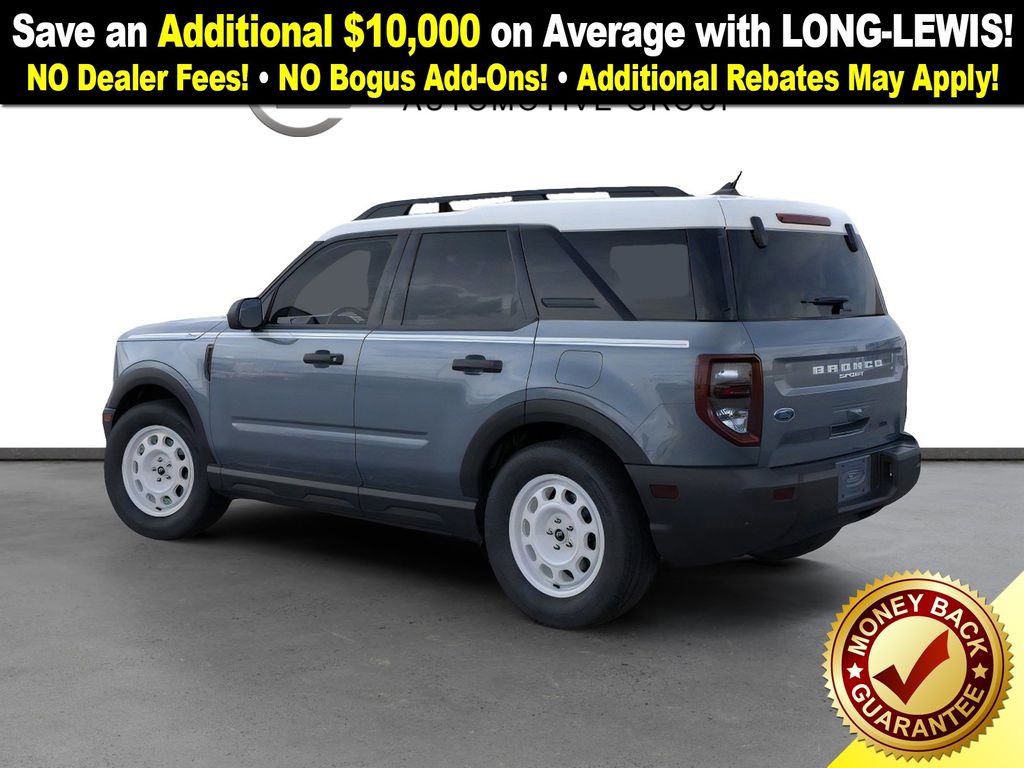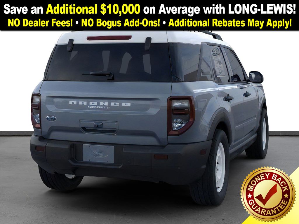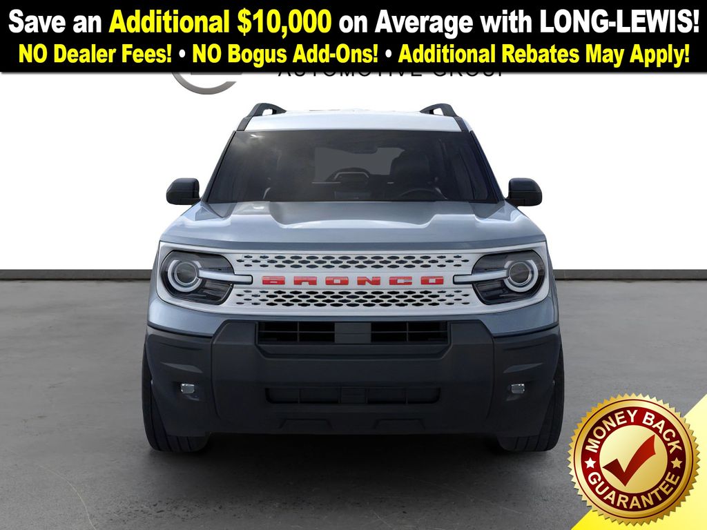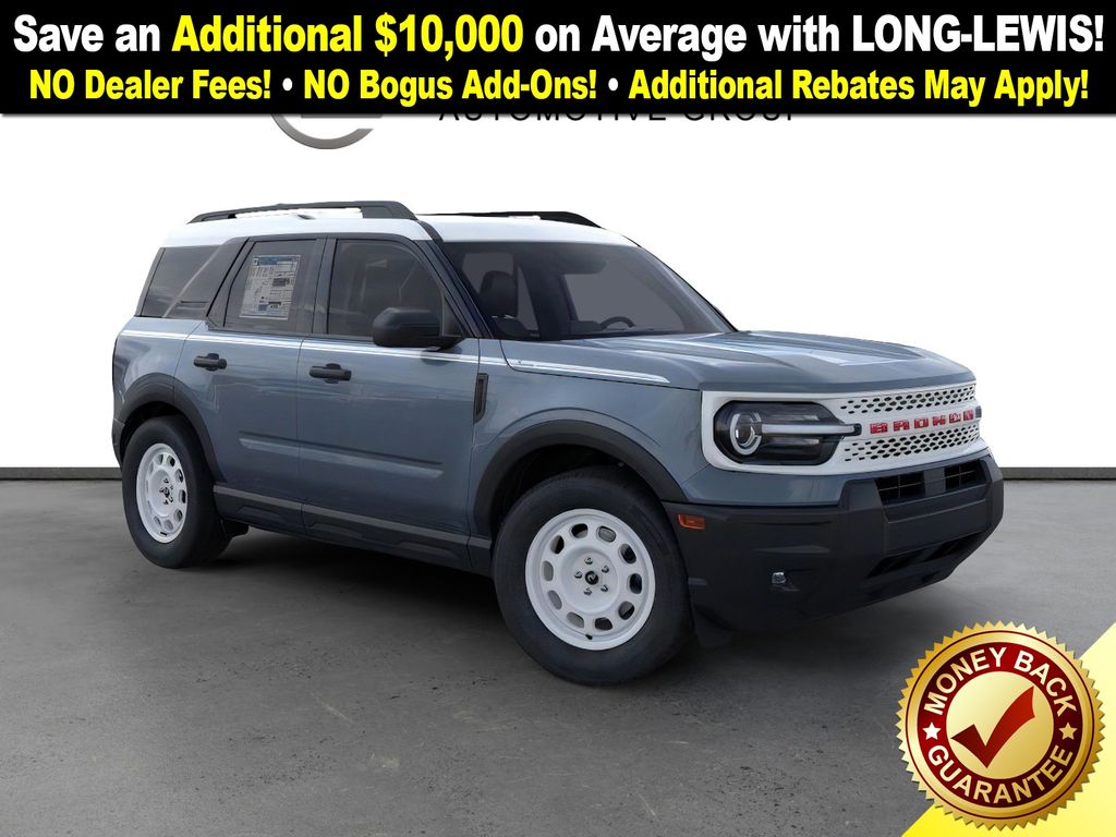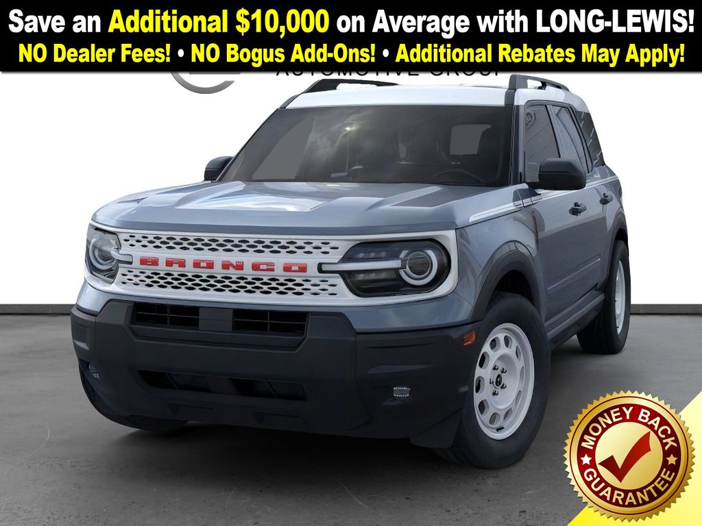 Azure Gray Metallic Tri-Coat 2025 Ford Bronco Sport Heritage FCT 4WD 8-Speed Automatic 1.5L EcoBoost 4-Wheel Disc Brakes, 6 Speakers, ABS brakes, Air Conditioning, Alloy wheels, AM/FM radio: SiriusXM, AM/FM Stereo, Auto High-beam Headlights, Automatic temperature control, Brake assist, Compass, Convenience Package, Delay-off headlights, Driver door bin, Driver vanity mirror, Dual front impact airbags, Dual front side impact airbags, Electronic Stability Control, Emergency communication system: SYNC 4 911 Assist, Four wheel independent suspension, Front anti-roll bar, Front Bucket Seats, Front Center Armrest, Front Driver/Passenger Seat Back Map Pockets, Front License Plate Bracket, Front reading lights, Fully automatic headlights, Heated 8-Way Power Driver's Seat, Heated door mirrors, Illuminated entry, Knee airbag, LED Fog Lamps, Low tire pressure warning, Occupant sensing airbag, Outside temperature display, Overhead airbag, Overhead console, Panic alarm, Passenger door bin, Passenger vanity mirror, Plaid Cloth Front Bucket Seats, Power door mirrors, Power steering, Power windows, Premium Wrapped Steering Wheel, Radio data system, Rear anti-roll bar, Rear Parking Sensors, Rear reading lights, Rear seat center armrest, Rear window defroster, Rear window wiper, Remote keyless entry, Security system, SiriusXM, Speed control, Speed-sensing steering, Speed-Sensitive Wipers, Split folding rear seat, Steering wheel mounted audio controls, SYNC 4 w/Enhanced Voice Recognition, Tachometer, Telescoping steering wheel, Tilt steering wheel, Traction control, Trip computer, Universal Garage Door Opener (UGDO), Variably intermittent wipers, Wheels: 17" Oxford White-Painted Aluminum.