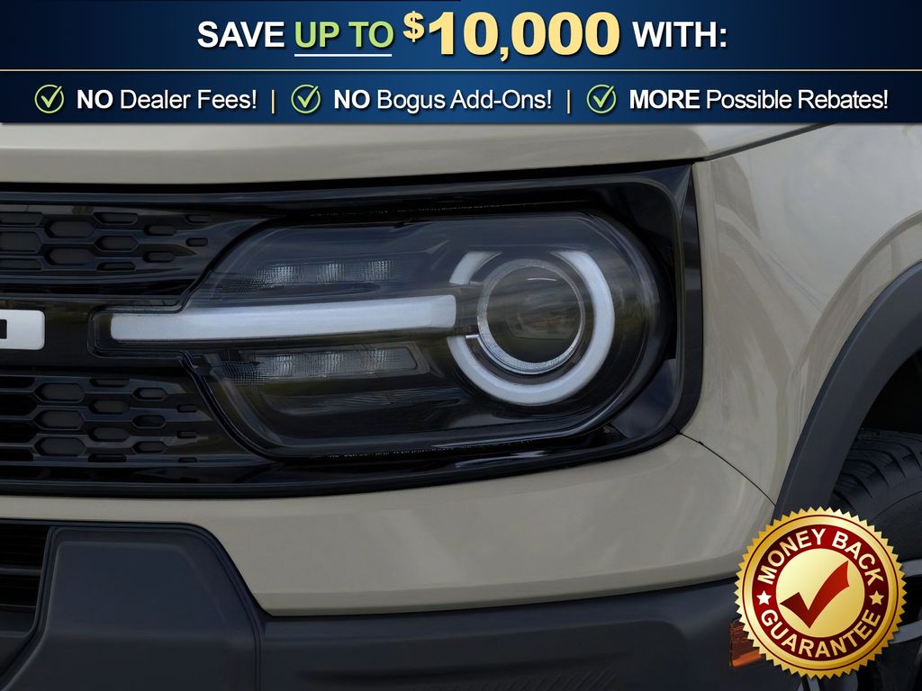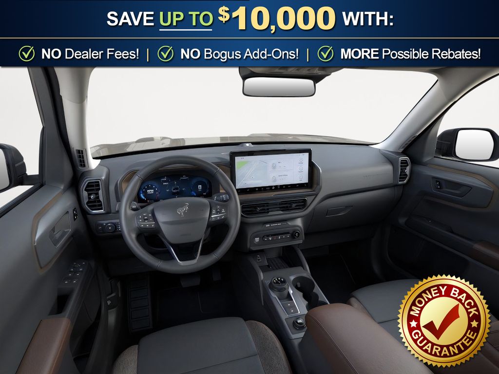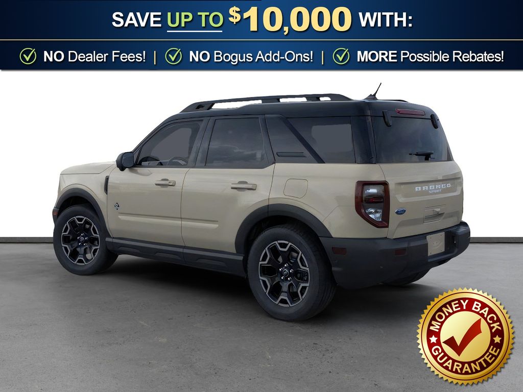 Desert Sand 2025 Ford Bronco Sport Outer Banks fctp 4WD 8-Speed Automatic 1.5L EcoBoost 360-Degree Camera w/Trail & Split View, 4-Wheel Disc Brakes, 6 Speakers, ABS brakes, Air Conditioning, Alloy wheels, AM/FM radio: SiriusXM, AM/FM Stereo, Auto High-beam Headlights, Auto-dimming Rear-View mirror, Automatic temperature control, B&O Sound System by Bang & Olufsen, Brake assist, Compass, Connected Navigation, Delay-off headlights, Driver door bin, Driver vanity mirror, Dual front impact airbags, Dual front side impact airbags, Electronic Stability Control, Emergency communication system: SYNC 4 911 Assist, Four wheel independent suspension, Front anti-roll bar, Front Bucket Seats, Front Center Armrest, Front Driver/Passenger Seat Back Map Pockets, Front dual zone A/C, Front fog lights, Front License Plate Bracket, Front Parking Sensors, Front reading lights, Fully automatic headlights, Garage door transmitter, HD Radio, Heated door mirrors, Heated front seats, Heated steering wheel, Illuminated entry, Knee airbag, Low tire pressure warning, Memory seat, Occupant sensing airbag, Outer Banks Tech Package+, Outside temperature display, Overhead airbag, Overhead console, Panic alarm, Passenger door bin, Passenger vanity mirror, Power door mirrors, Power driver seat, Power Moonroof, Power passenger seat, Power steering, Power windows, Premium Trimmed Front Bucket Seats w/Ebony/Roast, Radio data system, Rain sensing wipers, Rear anti-roll bar, Rear Parking Sensors, Rear reading lights, Rear seat center armrest, Rear window defroster, Rear window wiper, Remote keyless entry, Reverse Brake Assist, Security system, SiriusXM, Speed control, Speed-sensing steering, Speed-Sensitive Wipers, Split folding rear seat, Steering wheel mounted audio controls, SYNC 4 w/Enhanced Voice Recognition, Tachometer, Telescoping steering wheel, Tilt steering wheel, Traction control, Trip computer, Variably intermittent wipers, Wheels: 18" Ebony Black-Painted Aluminum.