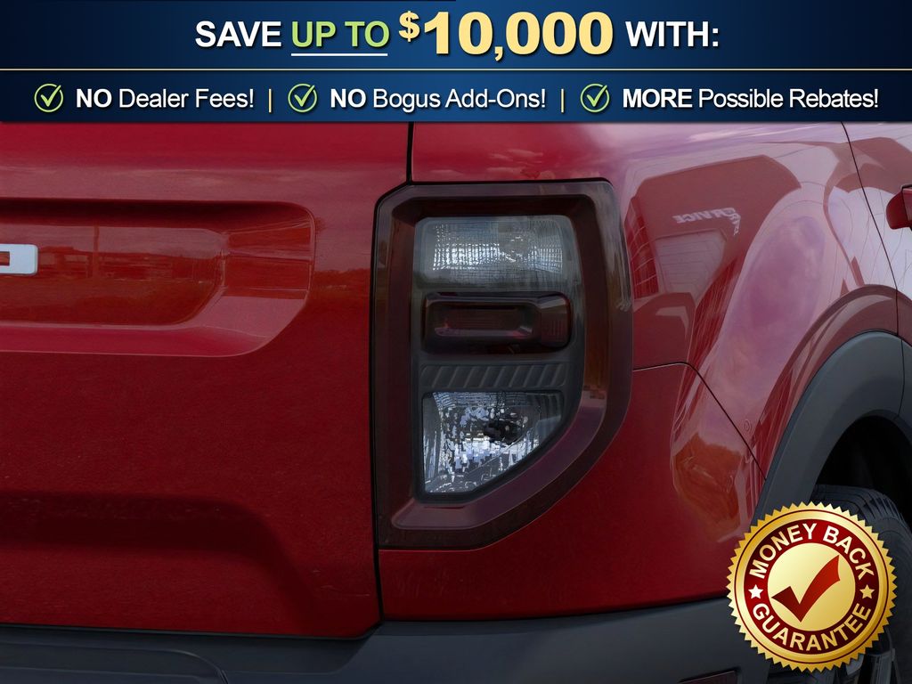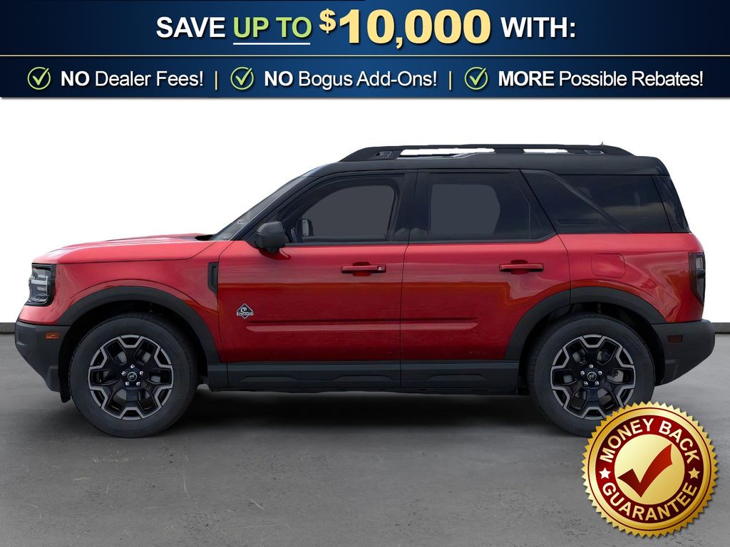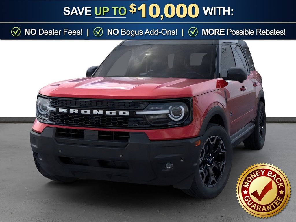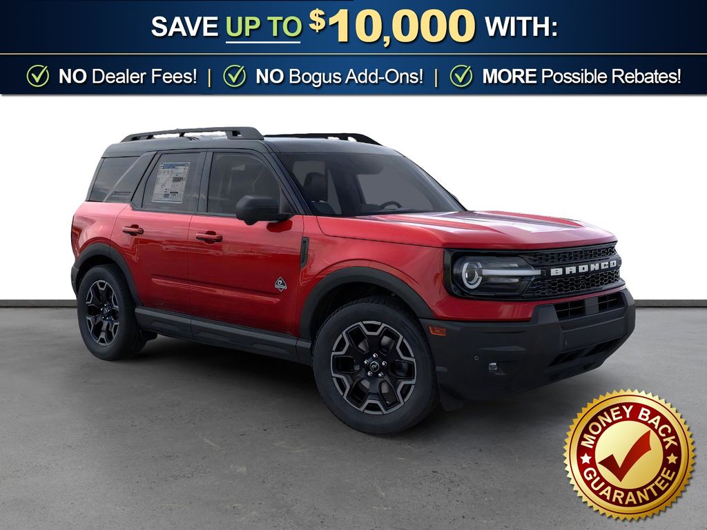 Ruby Red Metallic Tinted Clearcoat 2025 Ford Bronco Sport Outer Banks fctp 4WD 8-Speed Automatic 1.5L EcoBoost 360-Degree Camera w/Trail & Split View, 4-Wheel Disc Brakes, 6 Speakers, ABS brakes, Air Conditioning, Alloy wheels, AM/FM radio: SiriusXM, AM/FM Stereo, Auto High-beam Headlights, Auto-dimming Rear-View mirror, Automatic temperature control, B&O Sound System by Bang & Olufsen, Brake assist, Compass, Connected Navigation, Delay-off headlights, Driver door bin, Driver vanity mirror, Dual front impact airbags, Dual front side impact airbags, Electronic Stability Control, Emergency communication system: SYNC 4 911 Assist, Four wheel independent suspension, Front anti-roll bar, Front Bucket Seats, Front Center Armrest, Front Driver/Passenger Seat Back Map Pockets, Front dual zone A/C, Front fog lights, Front License Plate Bracket, Front Parking Sensors, Front reading lights, Fully automatic headlights, Garage door transmitter, HD Radio, Heated door mirrors, Heated front seats, Heated steering wheel, Illuminated entry, Knee airbag, Low tire pressure warning, Memory seat, Occupant sensing airbag, Outer Banks Tech Package+, Outside temperature display, Overhead airbag, Overhead console, Panic alarm, Passenger door bin, Passenger vanity mirror, Power door mirrors, Power driver seat, Power passenger seat, Power steering, Power windows, Premium Trimmed Front Bucket Seats w/Ebony/Roast, Radio data system, Rain sensing wipers, Rear anti-roll bar, Rear Parking Sensors, Rear reading lights, Rear seat center armrest, Rear window defroster, Rear window wiper, Remote keyless entry, Reverse Brake Assist, Security system, SiriusXM, Speed control, Speed-sensing steering, Speed-Sensitive Wipers, Split folding rear seat, Steering wheel mounted audio controls, SYNC 4 w/Enhanced Voice Recognition, Tachometer, Telescoping steering wheel, Tilt steering wheel, Traction control, Trip computer, Variably intermittent wipers, Wheels: 18" Ebony Black-Painted Aluminum.