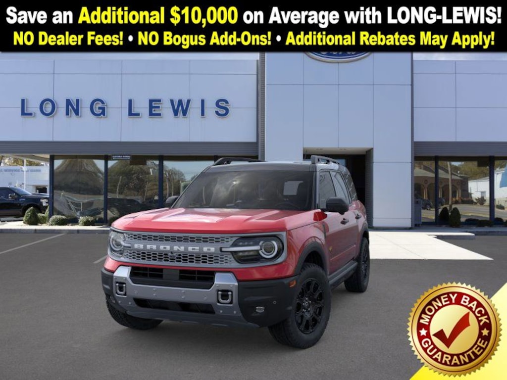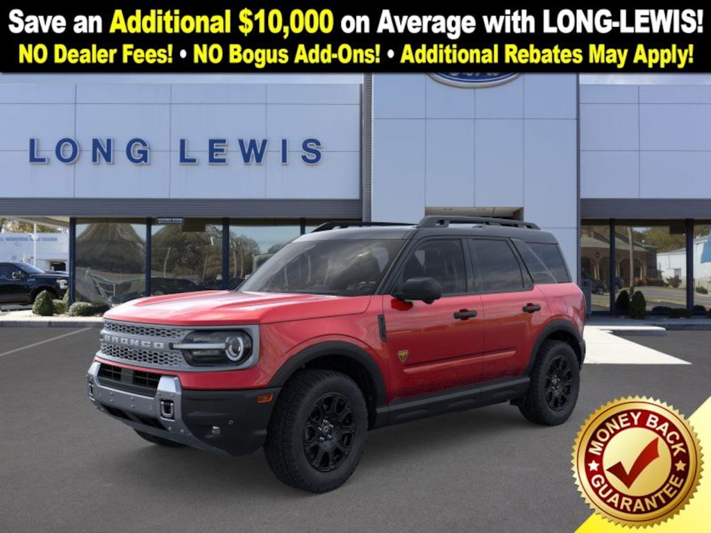 Ruby Red Metallic Tinted Clearcoat 2025 Ford Bronco Sport Badlands fctp 4WD 8-Speed Automatic EcoBoost 2.0L I4 GTDi DOHC Turbocharged VCT 4-Wheel Disc Brakes, 6 Speakers, ABS brakes, Air Conditioning, Alloy wheels, AM/FM radio: SiriusXM, AM/FM Stereo, Auto High-beam Headlights, Auto-dimming Rear-View mirror, Automatic temperature control, Brake assist, Compass, Delay-off headlights, Driver door bin, Driver vanity mirror, Dual front impact airbags, Dual front side impact airbags, Electronic Stability Control, Emergency communication system: SYNC 4 911 Assist, Four wheel independent suspension, Front anti-roll bar, Front Bucket Seats, Front Center Armrest, Front fog lights, Front reading lights, Fully automatic headlights, Garage door transmitter, Heated door mirrors, Heated front seats, Heated steering wheel, Illuminated entry, Knee airbag, Leather Trimmed Front Bucket Seats, Low tire pressure warning, Memory seat, Occupant sensing airbag, Outside temperature display, Overhead airbag, Overhead console, Panic alarm, Passenger door bin, Passenger vanity mirror, Power door mirrors, Power driver seat, Power passenger seat, Power steering, Power windows, Radio data system, Rear anti-roll bar, Rear reading lights, Rear seat center armrest, Rear window defroster, Rear window wiper, Remote keyless entry, Security system, SiriusXM, Speed control, Speed-sensing steering, Speed-Sensitive Wipers, Split folding rear seat, Steering wheel mounted audio controls, SYNC 4 w/Enhanced Voice Recognition, Tachometer, Telescoping steering wheel, Tilt steering wheel, Traction control, Trip computer, Variably intermittent wipers, Wheels: 17" Matte Black-Painted Aluminum.