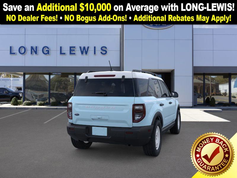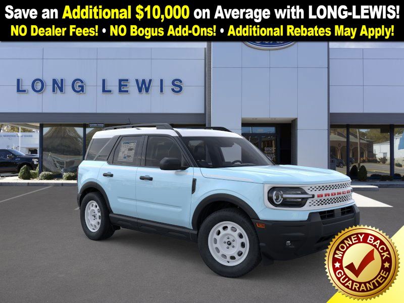 Robins Egg Blue 2025 Ford Bronco Sport Heritage fctp 4WD 8-Speed Automatic 1.5L EcoBoost 4-Wheel Disc Brakes, 6 Speakers, ABS brakes, Air Conditioning, Alloy wheels, AM/FM radio: SiriusXM, AM/FM Stereo, Auto High-beam Headlights, Automatic temperature control, Brake assist, Compass, Convenience Package, Delay-off headlights, Driver door bin, Driver vanity mirror, Dual front impact airbags, Dual front side impact airbags, Electronic Stability Control, Emergency communication system: SYNC 4 911 Assist, Four wheel independent suspension, Front anti-roll bar, Front Bucket Seats, Front Center Armrest, Front Driver/Passenger Seat Back Map Pockets, Front License Plate Bracket, Front reading lights, Fully automatic headlights, Heated 8-Way Power Driver's Seat, Heated door mirrors, Illuminated entry, Knee airbag, LED Fog Lamps, Low tire pressure warning, Occupant sensing airbag, Outside temperature display, Overhead airbag, Overhead console, Panic alarm, Passenger door bin, Passenger vanity mirror, Plaid Cloth Front Bucket Seats, Power door mirrors, Power Moonroof, Power steering, Power windows, Premium Wrapped Steering Wheel, Radio data system, Rear anti-roll bar, Rear Parking Sensors, Rear reading lights, Rear seat center armrest, Rear window defroster, Rear window wiper, Remote keyless entry, Security system, SiriusXM, Speed control, Speed-sensing steering, Speed-Sensitive Wipers, Split folding rear seat, Steering wheel mounted audio controls, SYNC 4 w/Enhanced Voice Recognition, Tachometer, Telescoping steering wheel, Tilt steering wheel, Traction control, Trip computer, Universal Garage Door Opener (UGDO), Variably intermittent wipers, Wheels: 17" Oxford White-Painted Aluminum.