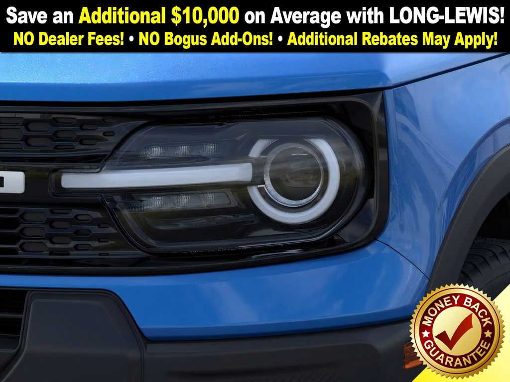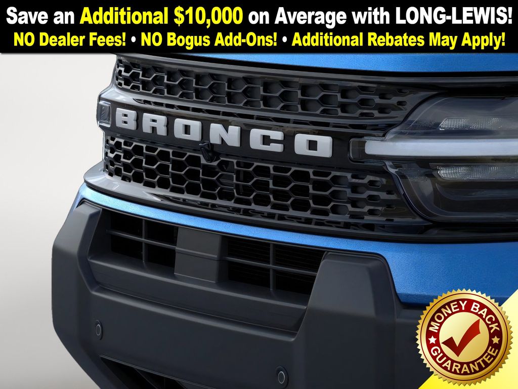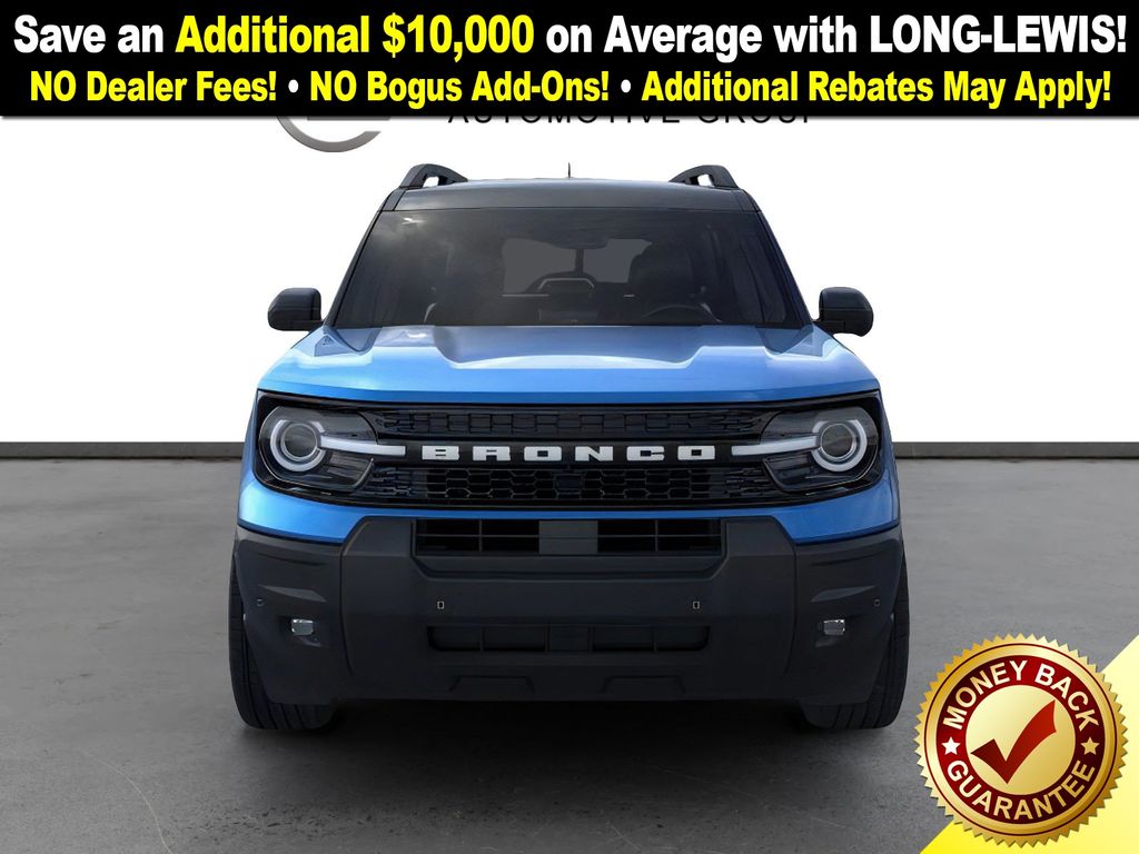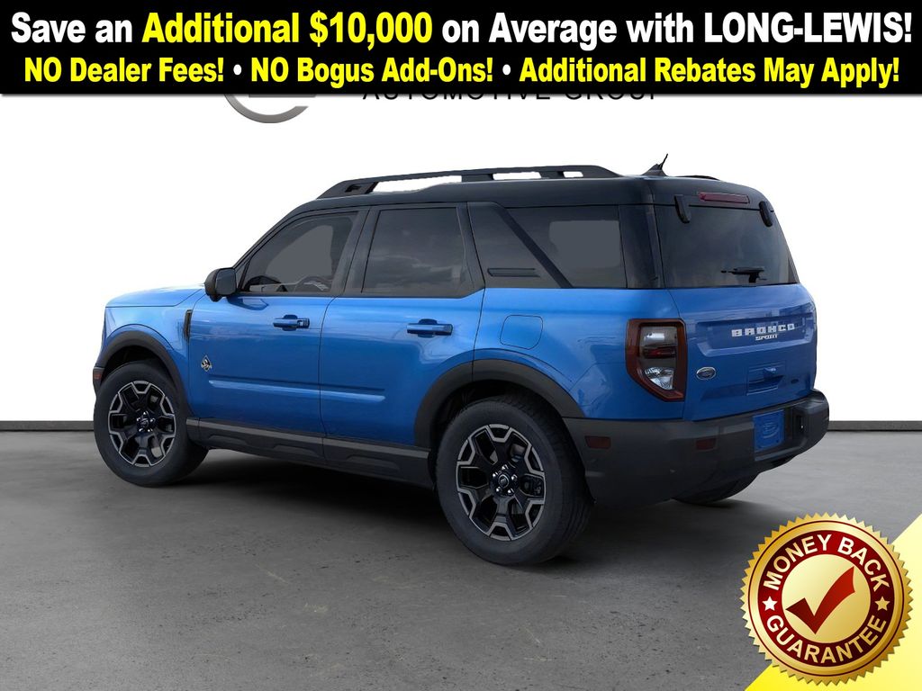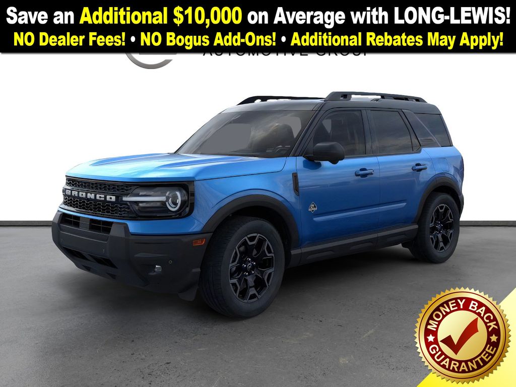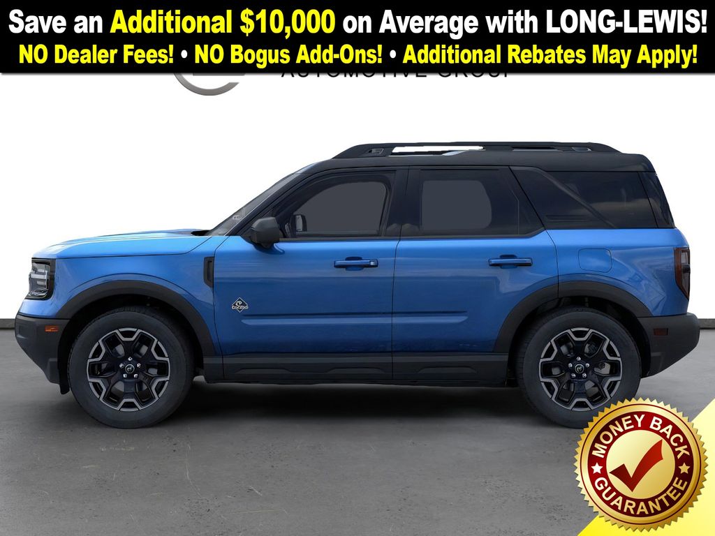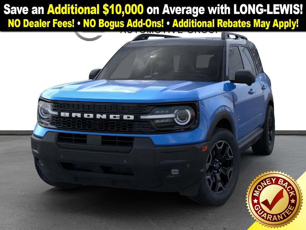 Velocity Blue Metallic 2025 Ford Bronco Sport Outer Banks fctp 4WD 8-Speed Automatic 1.5L EcoBoost 360-Degree Camera w/Trail & Split View, 4-Wheel Disc Brakes, 6 Speakers, ABS brakes, Air Conditioning, Alloy wheels, AM/FM radio: SiriusXM, AM/FM Stereo, Auto High-beam Headlights, Auto-dimming Rear-View mirror, Automatic temperature control, B&O Sound System by Bang & Olufsen, Brake assist, Compass, Connected Navigation, Delay-off headlights, Driver door bin, Driver vanity mirror, Dual front impact airbags, Dual front side impact airbags, Electronic Stability Control, Emergency communication system: SYNC 4 911 Assist, Four wheel independent suspension, Front anti-roll bar, Front Bucket Seats, Front Center Armrest, Front Driver/Passenger Seat Back Map Pockets, Front dual zone A/C, Front fog lights, Front License Plate Bracket, Front Parking Sensors, Front reading lights, Fully automatic headlights, Garage door transmitter, HD Radio, Heated door mirrors, Heated front seats, Heated steering wheel, Illuminated entry, Knee airbag, Low tire pressure warning, Memory seat, Occupant sensing airbag, Outer Banks Tech Package+, Outside temperature display, Overhead airbag, Overhead console, Panic alarm, Passenger door bin, Passenger vanity mirror, Power door mirrors, Power driver seat, Power Moonroof, Power passenger seat, Power steering, Power windows, Premium Trimmed Front Bucket Seats w/Ebony/Roast, Radio data system, Rain sensing wipers, Rear anti-roll bar, Rear Parking Sensors, Rear reading lights, Rear seat center armrest, Rear window defroster, Rear window wiper, Remote keyless entry, Reverse Brake Assist, Security system, SiriusXM, Speed control, Speed-sensing steering, Speed-Sensitive Wipers, Split folding rear seat, Steering wheel mounted audio controls, SYNC 4 w/Enhanced Voice Recognition, Tachometer, Telescoping steering wheel, Tilt steering wheel, Traction control, Trip computer, Variably intermittent wipers, Wheels: 18" Ebony Black-Painted Aluminum.