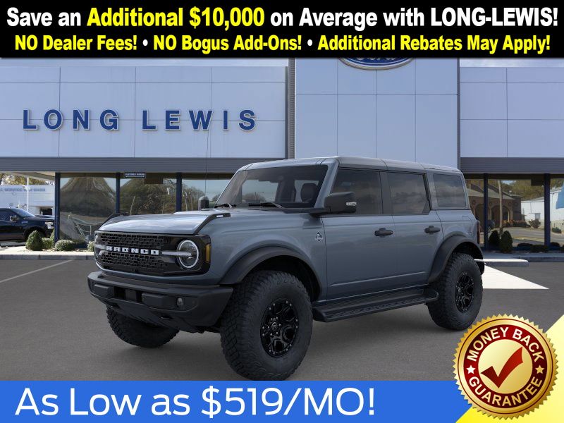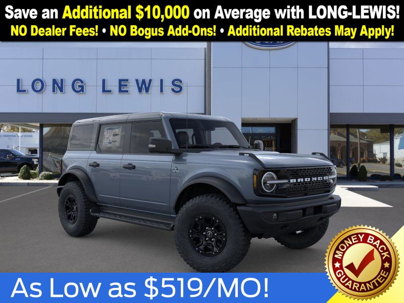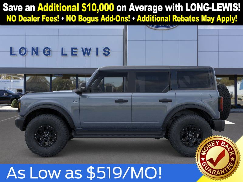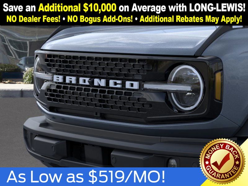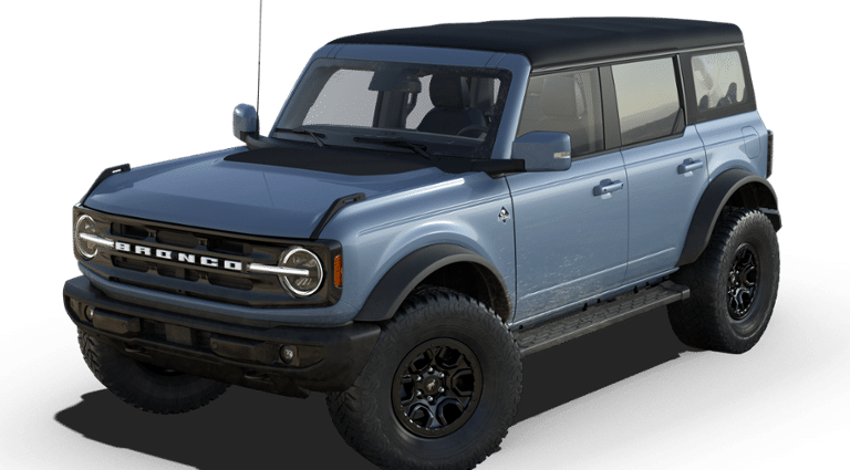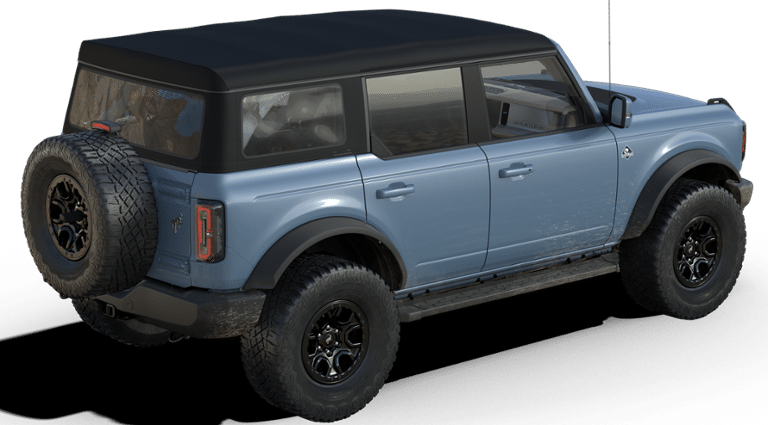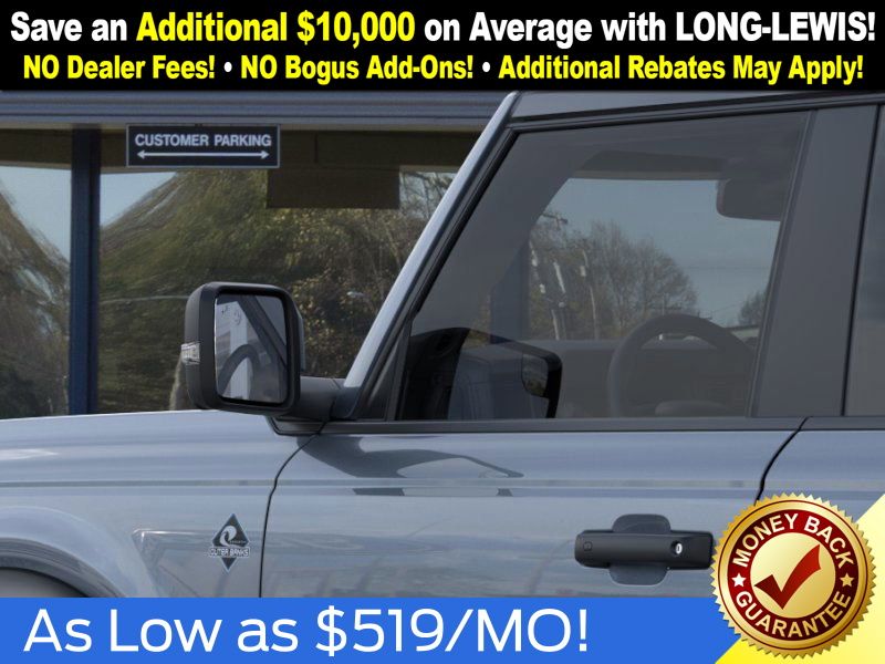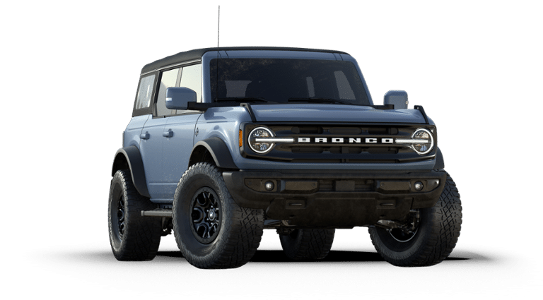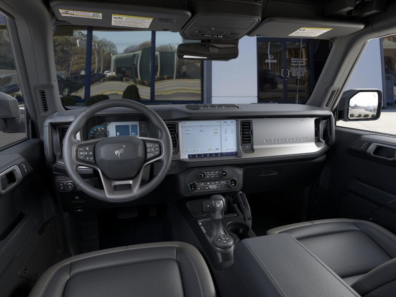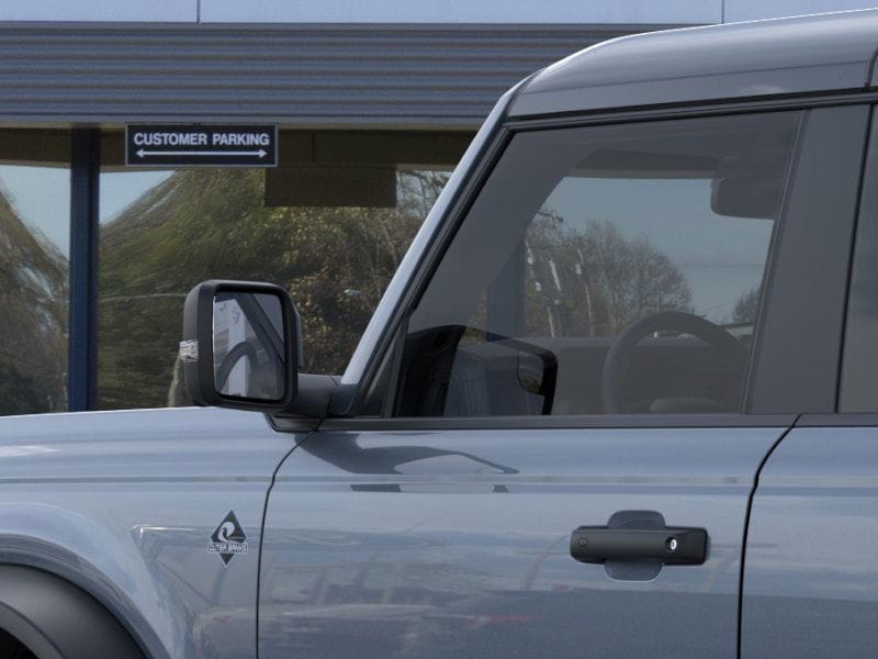 Azure Gray Metallic Tri-Coat 2025 Ford Bronco Outer Banks FCT 4WD 10-Speed Automatic 2.7L EcoBoost V6 18" Bright Machined Aluminum Wheels, 3.73 Axle Ratio, 4-Wheel Disc Brakes, 4.7 Final Drive Ratio, 7 Speakers, ABS brakes, Air Conditioning, Alloy wheels, AM/FM radio: SiriusXM with 360L, AM/FM Stereo, Auto High-beam Headlights, Auto-dimming Rear-View mirror, Automatic temperature control, Black Appearance Package, Black Molded-In-Color Door Handles, Black Molded-In-Color Fender Flares, Black Molded-In-Color Sideview Mirror Caps, Black-Painted Molded-In-Color Grille, Brake assist, Compass, Connected Navigation, Delay-off headlights, Driver door bin, Driver vanity mirror, Dual front impact airbags, Dual front side impact airbags, Electronic Stability Control, Emergency communication system: 911 Assist, Exterior Parking Camera Rear, Front anti-roll bar, Front Bucket Seats, Front Center Armrest, Front dual zone A/C, Front fog lights, Front License Plate Bracket, Front reading lights, Front wheel independent suspension, Fully automatic headlights, Hard Top Sound Deadening Headliner, Heated door mirrors, Heated front seats, Heated Leather-Trimmed/Vinyl Bucket Seats, Heated steering wheel, High Clearance Fender Flares, High Clearance Suspension, Illuminated entry, Integrated roll-over protection, Leather Shift Knob, Low tire pressure warning, Navigation system: Connected Navigation, Occupant sensing airbag, Outside temperature display, Overhead airbag, Overhead console, Panic alarm, Passenger door bin, Passenger vanity mirror, Position-Sensitive Bilstein Shock Absorbers, Power door mirrors, Power driver seat, Power passenger seat, Power steering, Power windows, Radio data system, Rear seat center armrest, Rear-Window Defroster & Washer, Remote keyless entry, Sasquatch Package, Security system, Shadow Black-Painted Hard Top, SiriusXM w/360L, Speed control, Split folding rear seat, Steering wheel mounted audio controls, SYNC 4, Tachometer, Telescoping steering wheel, Tilt steering wheel, Traction control, Trip computer, Variably intermittent wipers, Voltmeter.