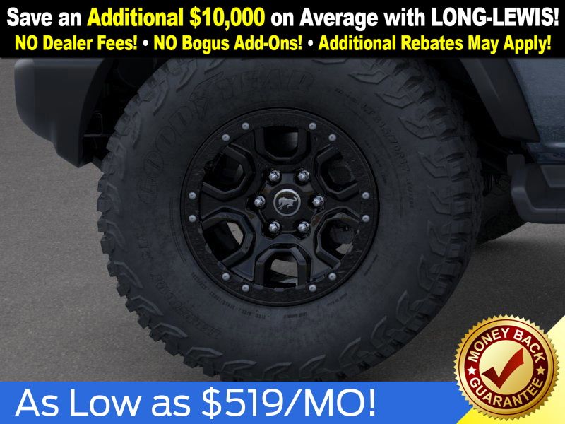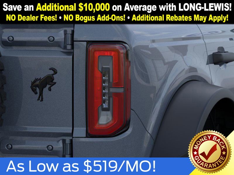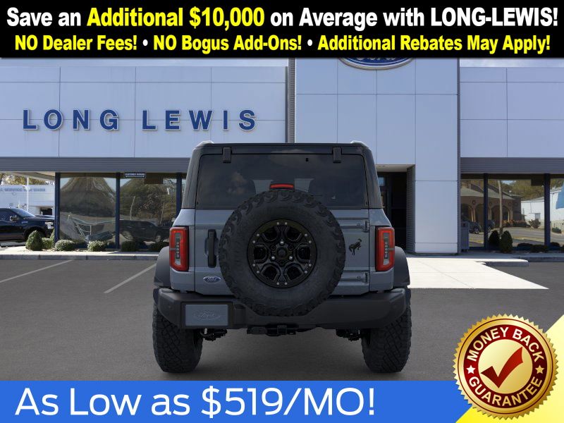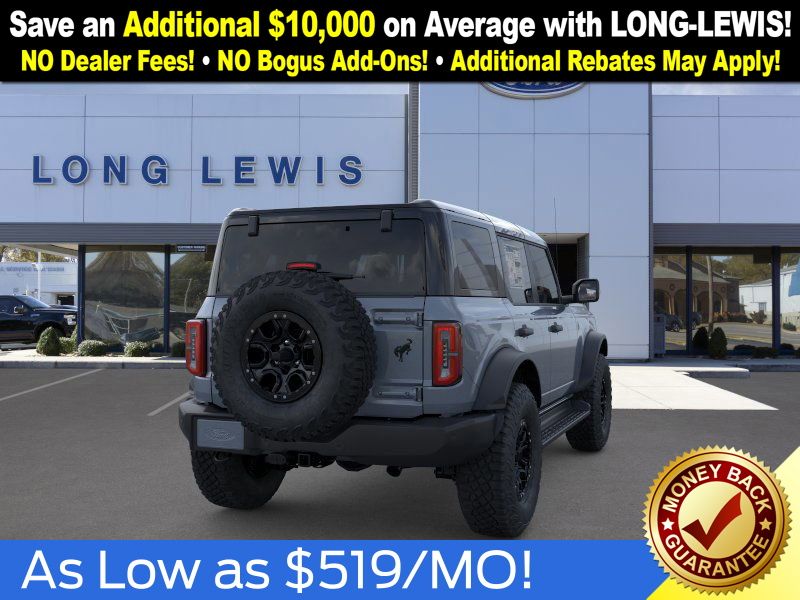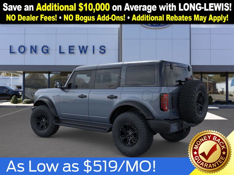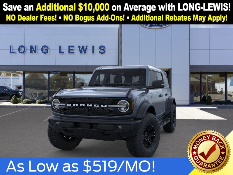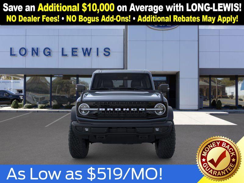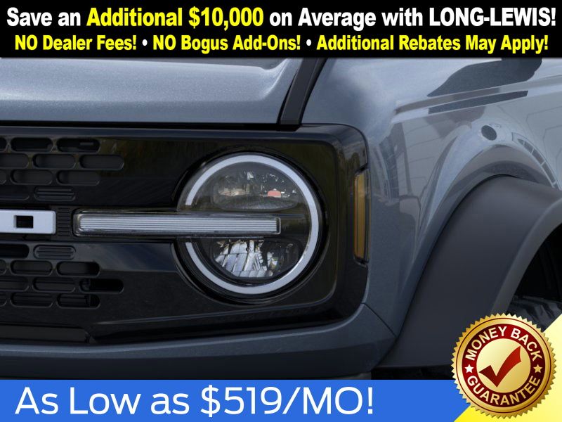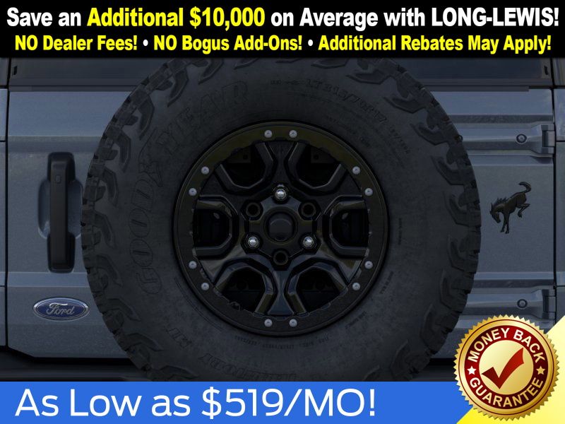 Azure Gray Metallic Tri-Coat 2025 Ford Bronco Outer Banks FCT 4WD 10-Speed Automatic 2.7L EcoBoost V6 18" Bright Machined Aluminum Wheels, 3.73 Axle Ratio, 4-Wheel Disc Brakes, 4.7 Final Drive Ratio, 7 Speakers, ABS brakes, Air Conditioning, Alloy wheels, AM/FM radio: SiriusXM with 360L, AM/FM Stereo, Auto High-beam Headlights, Auto-dimming Rear-View mirror, Automatic temperature control, Black Appearance Package, Black Molded-In-Color Door Handles, Black Molded-In-Color Fender Flares, Black Molded-In-Color Sideview Mirror Caps, Black-Painted Molded-In-Color Grille, Brake assist, Compass, Connected Navigation, Delay-off headlights, Driver door bin, Driver vanity mirror, Dual front impact airbags, Dual front side impact airbags, Electronic Stability Control, Emergency communication system: 911 Assist, Exterior Parking Camera Rear, Front anti-roll bar, Front Bucket Seats, Front Center Armrest, Front dual zone A/C, Front fog lights, Front License Plate Bracket, Front reading lights, Front wheel independent suspension, Fully automatic headlights, Hard Top Sound Deadening Headliner, Heated door mirrors, Heated front seats, Heated Leather-Trimmed/Vinyl Bucket Seats, Heated steering wheel, High Clearance Fender Flares, High Clearance Suspension, Illuminated entry, Integrated roll-over protection, Leather Shift Knob, Low tire pressure warning, Navigation system: Connected Navigation, Occupant sensing airbag, Outside temperature display, Overhead airbag, Overhead console, Panic alarm, Passenger door bin, Passenger vanity mirror, Position-Sensitive Bilstein Shock Absorbers, Power door mirrors, Power driver seat, Power passenger seat, Power steering, Power windows, Radio data system, Rear seat center armrest, Rear-Window Defroster & Washer, Remote keyless entry, Sasquatch Package, Security system, Shadow Black-Painted Hard Top, SiriusXM w/360L, Speed control, Split folding rear seat, Steering wheel mounted audio controls, SYNC 4, Tachometer, Telescoping steering wheel, Tilt steering wheel, Traction control, Trip computer, Variably intermittent wipers, Voltmeter.