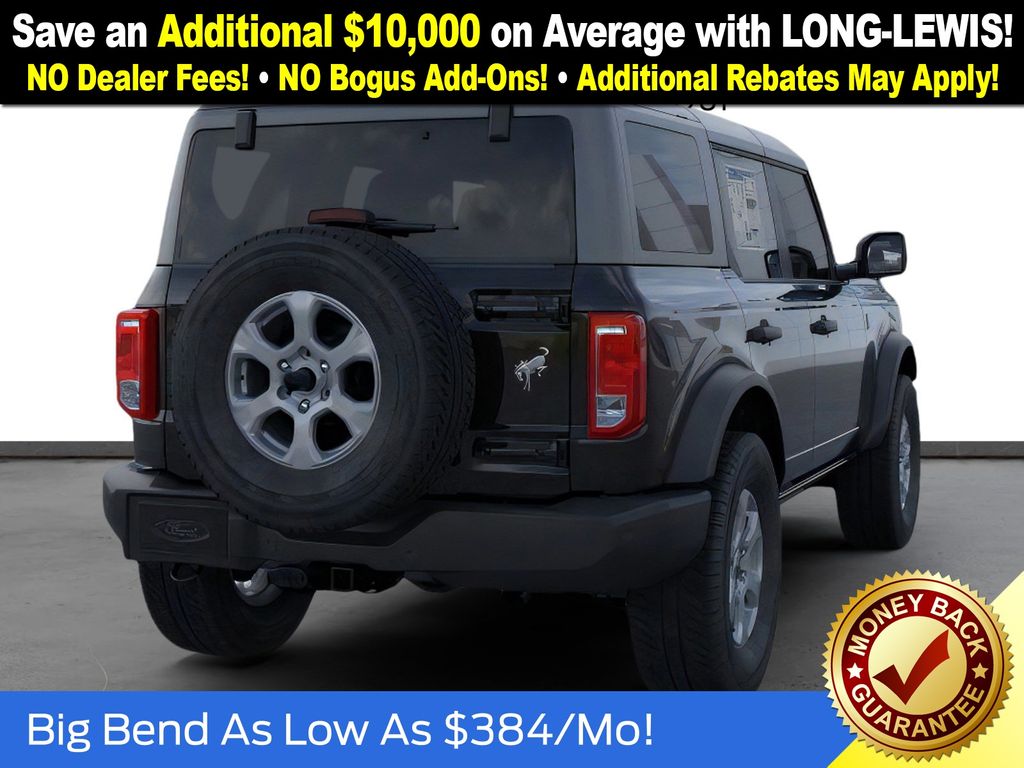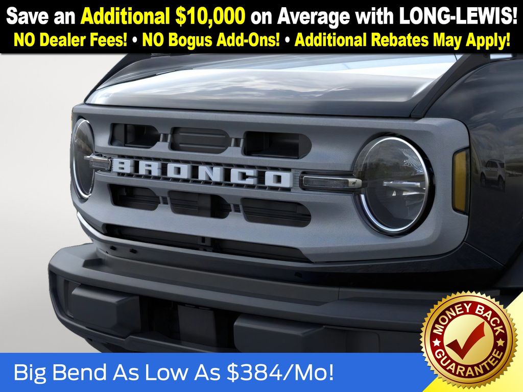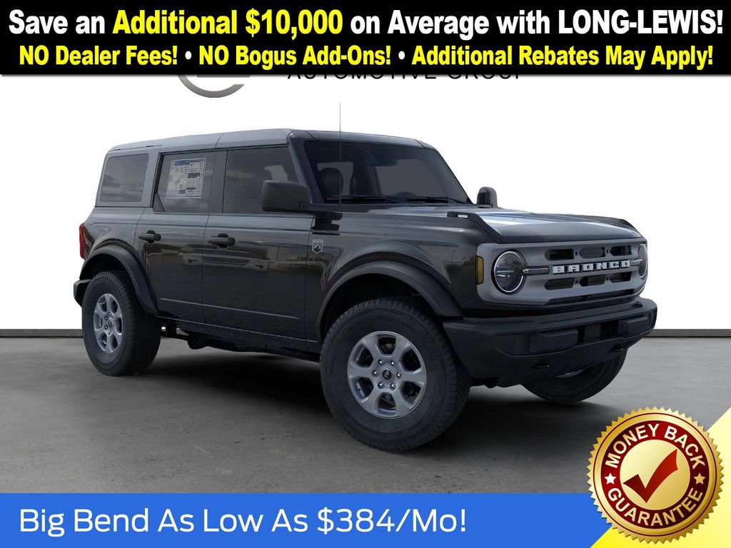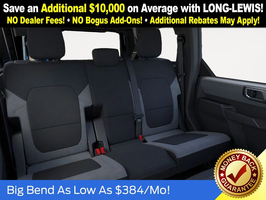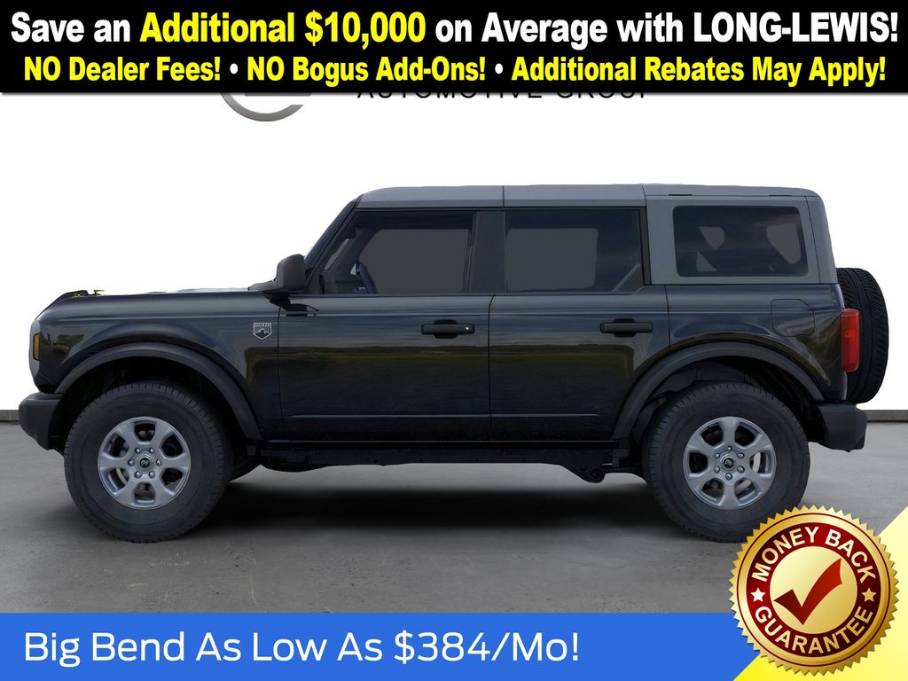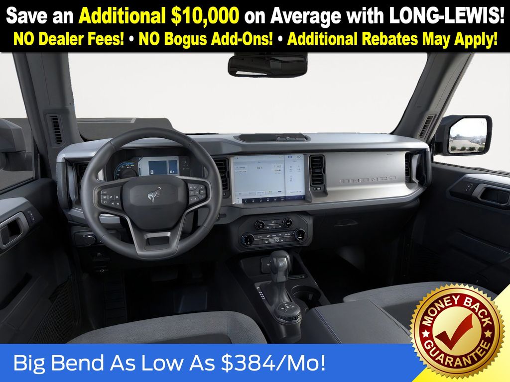 Dealer Discount of $1,260 off MSRP Shadow Black 2025 Ford Bronco Big Bend NFT 4WD 2.3L EcoBoost I-4 4-Wheel Disc Brakes, 4.46 Axle Ratio, 7 Speakers, ABS brakes, Air Conditioning, Alloy wheels, AM/FM radio: SiriusXM with 360L, AM/FM Stereo, Auto High-beam Headlights, Brake assist, Cloth Bucket Seats, Compass, Delay-off headlights, Driver door bin, Driver vanity mirror, Dual front impact airbags, Dual front side impact airbags, Electronic Stability Control, Emergency communication system: 911 Assist, Exterior Parking Camera Rear, Front anti-roll bar, Front Bucket Seats, Front Center Armrest, Front reading lights, Front wheel independent suspension, Fully automatic headlights, Heated door mirrors, Illuminated entry, Integrated roll-over protection, Internet access capable: FordPass Connect, Leather Shift Knob, Low tire pressure warning, Occupant sensing airbag, Outside temperature display, Overhead airbag, Overhead console, Panic alarm, Passenger door bin, Passenger vanity mirror, Power door mirrors, Power steering, Power windows, Radio data system, Remote keyless entry, Security system, SiriusXM w/360L, Speed control, Split folding rear seat, Steering wheel mounted audio controls, SYNC 4, Tachometer, Telescoping steering wheel, Tilt steering wheel, Traction control, Trip computer, Variably intermittent wipers, Wheels: 17" Carbonized Gray-Painted Aluminum.