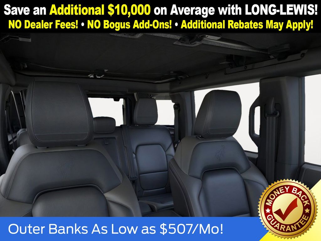 Shadow Black 2025 Ford Bronco Outer Banks NFT 4WD 10-Speed Automatic 2.7L EcoBoost V6 18" Bright Machined Aluminum Wheels, 3.73 Axle Ratio, 4-Wheel Disc Brakes, 7 Speakers, ABS brakes, Air Conditioning, Alloy wheels, AM/FM radio: SiriusXM with 360L, AM/FM Stereo, Auto High-beam Headlights, Auto-dimming Rear-View mirror, Automatic temperature control, Brake assist, Carbonized Gray Molded-In-Color Hard Top, Compass, Connected Navigation, Delay-off headlights, Driver door bin, Driver vanity mirror, Dual front impact airbags, Dual front side impact airbags, Electronic Stability Control, Emergency communication system: 911 Assist, Exterior Parking Camera Rear, Front anti-roll bar, Front Bucket Seats, Front Center Armrest, Front dual zone A/C, Front fog lights, Front License Plate Bracket, Front reading lights, Front wheel independent suspension, Fully automatic headlights, Hard Top Sound Deadening Headliner, Heated door mirrors, Heated front seats, Heated Leather-Trimmed/Vinyl Bucket Seats, Heated steering wheel, Illuminated entry, Integrated roll-over protection, Internet access capable: FordPass Connect, Leather Shift Knob, Low tire pressure warning, Navigation system: Connected Navigation, Occupant sensing airbag, Outside temperature display, Overhead airbag, Overhead console, Panic alarm, Passenger door bin, Passenger vanity mirror, Power door mirrors, Power driver seat, Power passenger seat, Power steering, Power windows, Radio data system, Rear seat center armrest, Rear-Window Defroster & Washer, Remote keyless entry, Security system, SiriusXM w/360L, Speed control, Split folding rear seat, Steering wheel mounted audio controls, SYNC 4, Tachometer, Telescoping steering wheel, Tilt steering wheel, Traction control, Trip computer, Variably intermittent wipers, Voltmeter.