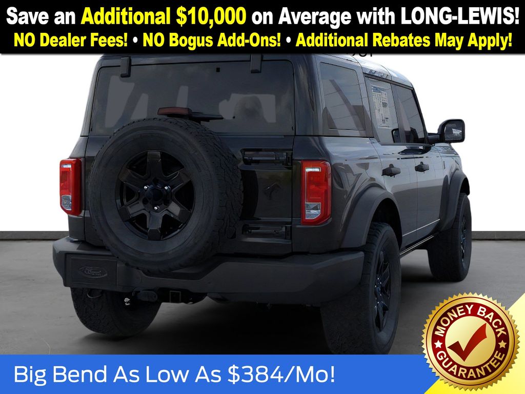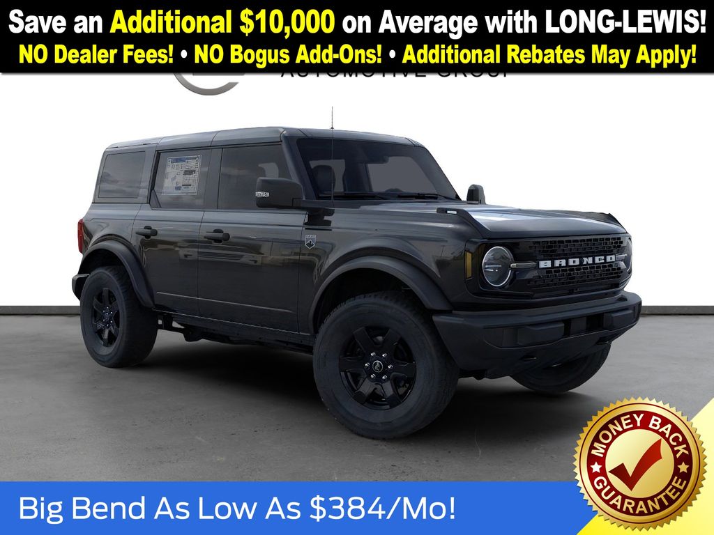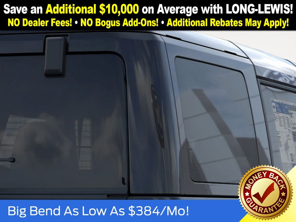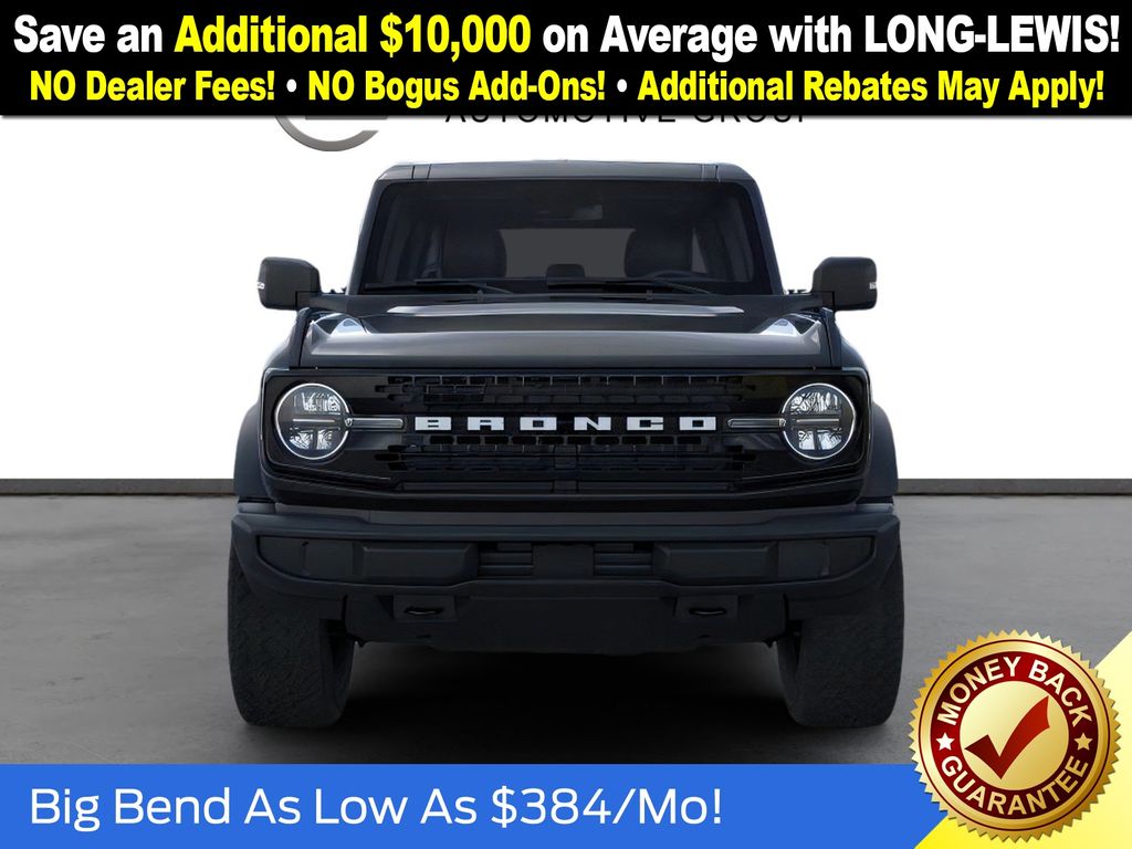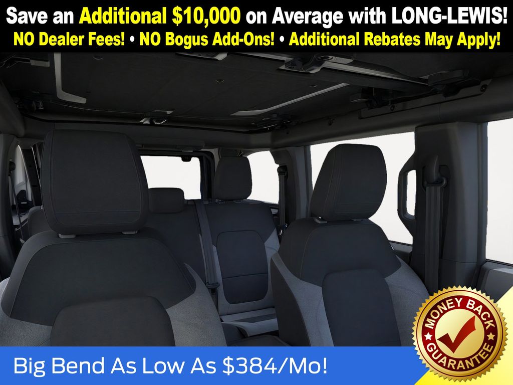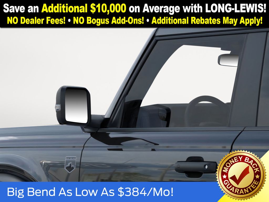 Shadow Black 2025 Ford Bronco Big Bend 4WD 2.3L EcoBoost I-4 4-Wheel Disc Brakes, 4.46 Axle Ratio, 7 Speakers, ABS brakes, Air Conditioning, Alloy wheels, AM/FM radio: SiriusXM with 360L, AM/FM Stereo, Auto High-beam Headlights, Brake assist, Cloth Bucket Seats, Compass, Delay-off headlights, Driver door bin, Driver vanity mirror, Dual front impact airbags, Dual front side impact airbags, Electronic Stability Control, Emergency communication system: 911 Assist, Exterior Parking Camera Rear, Front anti-roll bar, Front Bucket Seats, Front Center Armrest, Front reading lights, Front wheel independent suspension, Fully automatic headlights, Heated door mirrors, Illuminated entry, Integrated roll-over protection, Internet access capable: FordPass Connect, Leather Shift Knob, Low tire pressure warning, Occupant sensing airbag, Outside temperature display, Overhead airbag, Overhead console, Panic alarm, Passenger door bin, Passenger vanity mirror, Power door mirrors, Power steering, Power windows, Radio data system, Remote keyless entry, Security system, SiriusXM w/360L, Speed control, Split folding rear seat, Steering wheel mounted audio controls, SYNC 4, Tachometer, Telescoping steering wheel, Tilt steering wheel, Traction control, Trip computer, Variably intermittent wipers, Wheels: 17" Carbonized Gray-Painted Aluminum.
