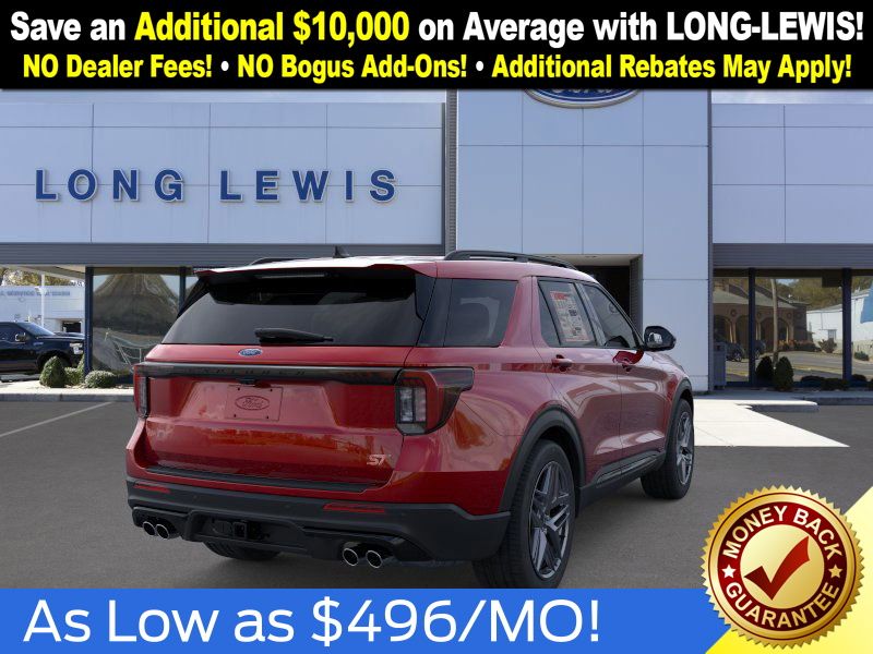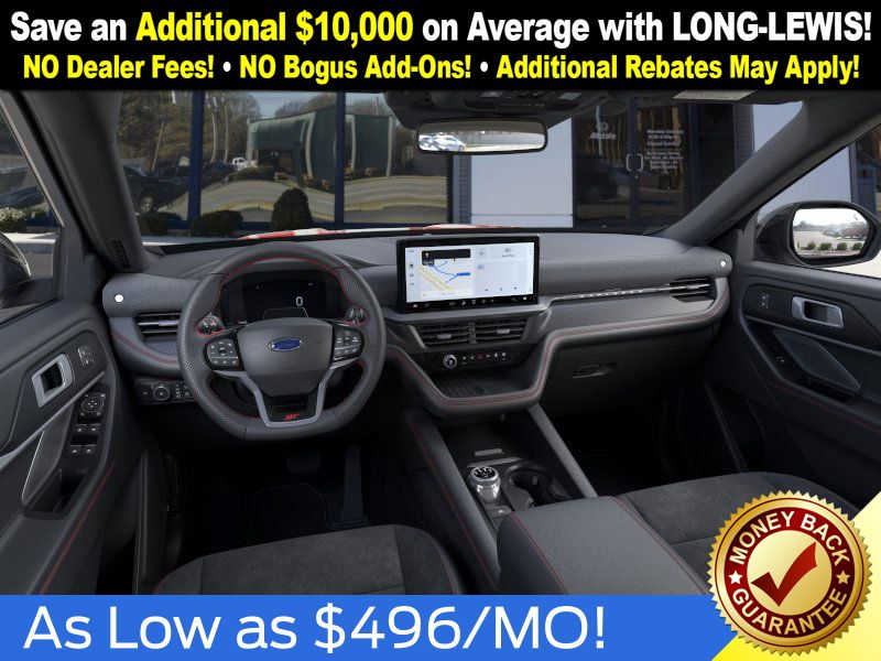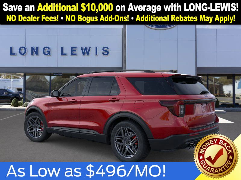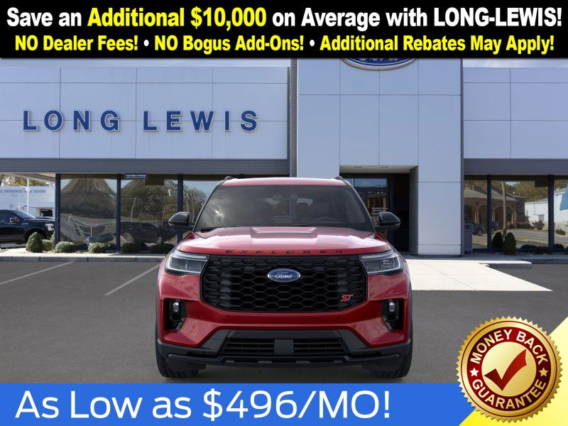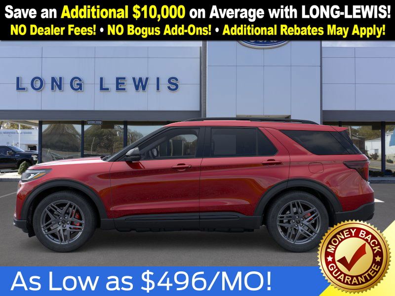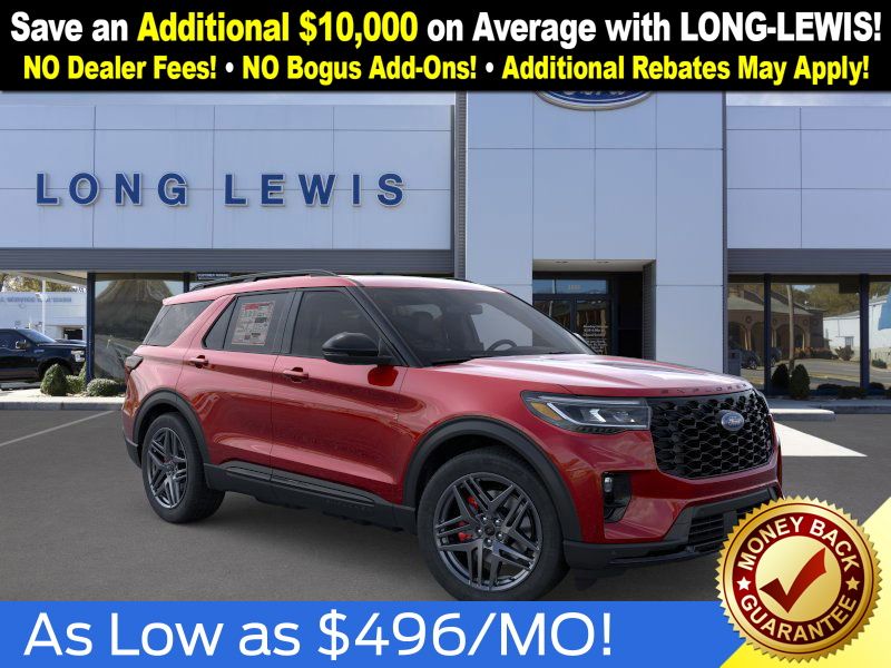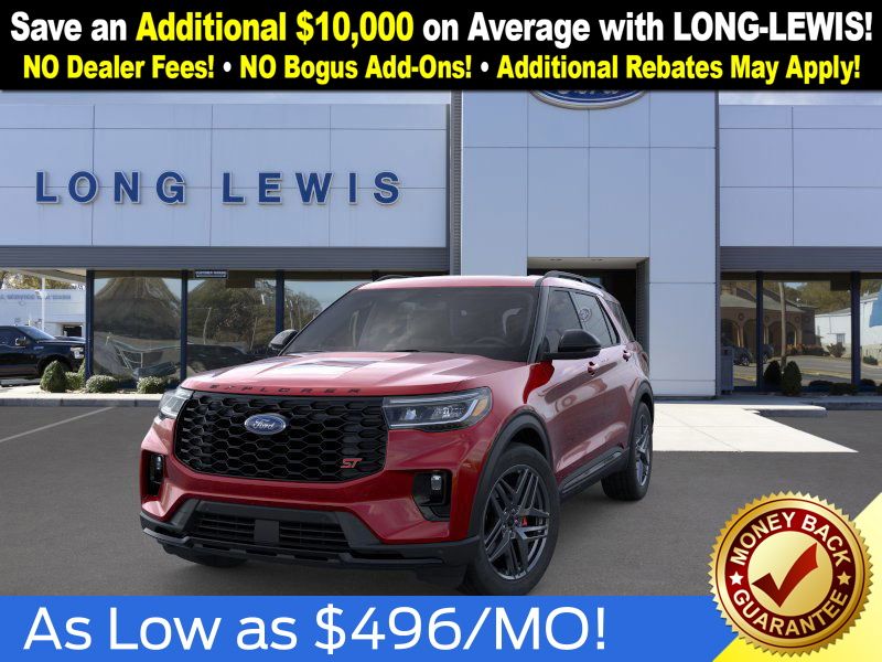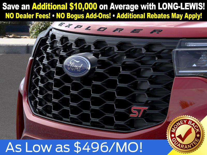 Rapid Red Metallic Tinted Clearcoat 2025 Ford Explorer ST fctp 4WD 10-Speed Automatic 3.0L EcoBoost V6 4WD, 10 Speakers, 3.58 Non-Limited Slip Rear Axle, 3rd row seats: bench, 4-Wheel Disc Brakes, ABS brakes, Air Conditioning, Alloy wheels, Apple CarPlay/Android Auto, Auto High-beam Headlights, Auto-dimming door mirrors, Auto-dimming Rear-View mirror, Automatic temperature control, B&O Sound System by Bang & Olufsen, Brake assist, Bumpers: body-color, Compass, Delay-off headlights, Driver door bin, Driver vanity mirror, Dual front impact airbags, Dual front side impact airbags, Electronic Stability Control, Emergency communication system: 911 Assist, Exterior Parking Camera Rear, Four wheel independent suspension, Front anti-roll bar, Front Bucket Seats, Front Center Armrest, Front dual zone A/C, Front fog lights, Front License Plate Bracket, Front reading lights, Fully automatic headlights, Garage door transmitter, Heated door mirrors, Heated front seats, Heated rear seats, Heated steering wheel, Heated/Ventilated Miko Sport Captain's Chairs, Illuminated entry, Knee airbag, Leather steering wheel, Low tire pressure warning, Memory seat, Multicontour Seats w/Front Active Motion, Navigation System, Occupant sensing airbag, Outside temperature display, Overhead airbag, Overhead console, Panic alarm, Panoramic Vista Roof w/Power Shade, Passenger door bin, Passenger vanity mirror, Power door mirrors, Power driver seat, Power Liftgate, Power passenger seat, Power steering, Power windows, Radio: B&O Sound System by Bang & Olufsen, Rain sensing wipers, Rear air conditioning, Rear anti-roll bar, Rear reading lights, Rear window defroster, Rear window wiper, Remote keyless entry, SecuriCode Keyless Entry Keypad, Security system, Speed control, Speed-sensing steering, Speed-Sensitive Wipers, Split folding rear seat, Spoiler, Sport steering wheel, Steering wheel mounted audio controls, Sun and Sound Package, Tachometer, Telescoping steering wheel, Tilt steering wheel, Traction control, Trip computer, Turn signal indicator mirrors, Variably intermittent wipers, Ventilated front seats, Wheels: 21" Magnetite-Painted Aluminum, 4WD.