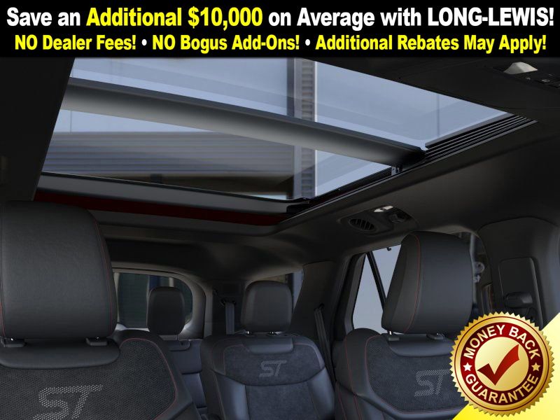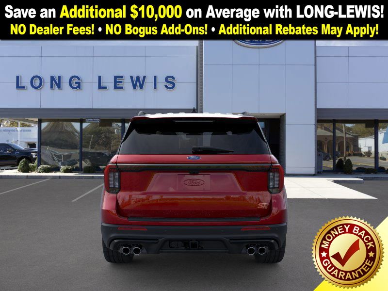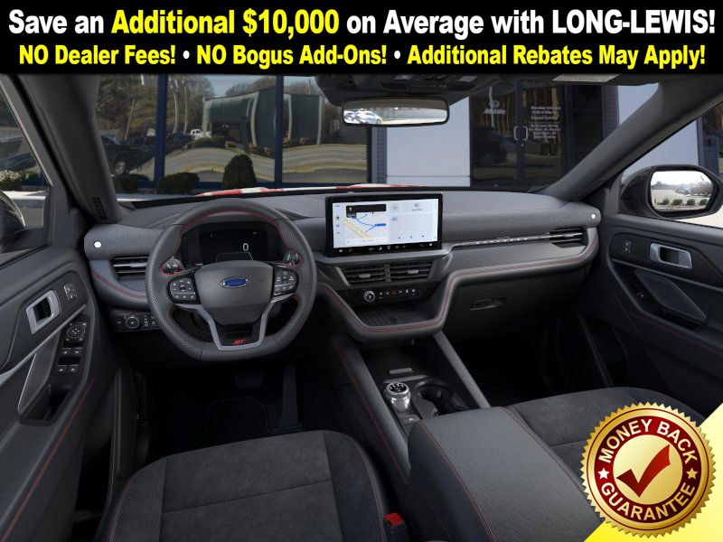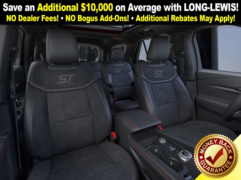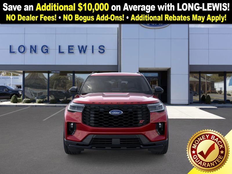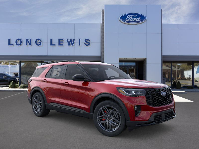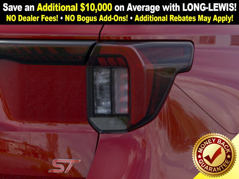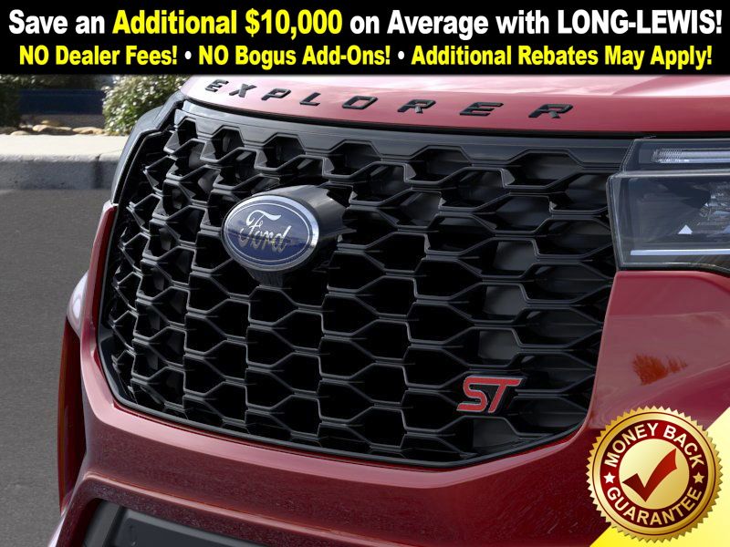 Rapid Red Metallic Tinted Clearcoat 2025 Ford Explorer ST fctp RWD 10-Speed Automatic 3.0L EcoBoost V6 10 Speakers, 3.58 Non-Limited Slip Rear Axle, 3rd row seats: bench, 4-Wheel Disc Brakes, ABS brakes, Air Conditioning, Alloy wheels, Apple CarPlay/Android Auto, Auto High-beam Headlights, Auto-dimming door mirrors, Auto-dimming Rear-View mirror, Automatic temperature control, B&O Sound System by Bang & Olufsen, Brake assist, Bumpers: body-color, Compass, Delay-off headlights, Driver door bin, Driver vanity mirror, Dual front impact airbags, Dual front side impact airbags, Electronic Stability Control, Emergency communication system: 911 Assist, Exterior Parking Camera Rear, Four wheel independent suspension, Front anti-roll bar, Front Bucket Seats, Front Center Armrest, Front dual zone A/C, Front fog lights, Front License Plate Bracket, Front reading lights, Fully automatic headlights, Garage door transmitter, Heated door mirrors, Heated front seats, Heated rear seats, Heated steering wheel, Heated/Ventilated Miko Sport Captain's Chairs, Illuminated entry, Knee airbag, Leather steering wheel, Low tire pressure warning, Memory seat, Multicontour Seats w/Front Active Motion, Navigation System, Occupant sensing airbag, Outside temperature display, Overhead airbag, Overhead console, Panic alarm, Panoramic Vista Roof w/Power Shade, Passenger door bin, Passenger vanity mirror, Power door mirrors, Power driver seat, Power Liftgate, Power passenger seat, Power steering, Power windows, Radio: B&O Sound System by Bang & Olufsen, Rain sensing wipers, Rear air conditioning, Rear anti-roll bar, Rear reading lights, Rear window defroster, Rear window wiper, Remote keyless entry, SecuriCode Keyless Entry Keypad, Security system, Speed control, Speed-sensing steering, Speed-Sensitive Wipers, Split folding rear seat, Spoiler, Sport steering wheel, Steering wheel mounted audio controls, Sun and Sound Package, Tachometer, Telescoping steering wheel, Tilt steering wheel, Traction control, Trip computer, Turn signal indicator mirrors, Variably intermittent wipers, Ventilated front seats, Wheels: 21" Magnetite-Painted Aluminum.
