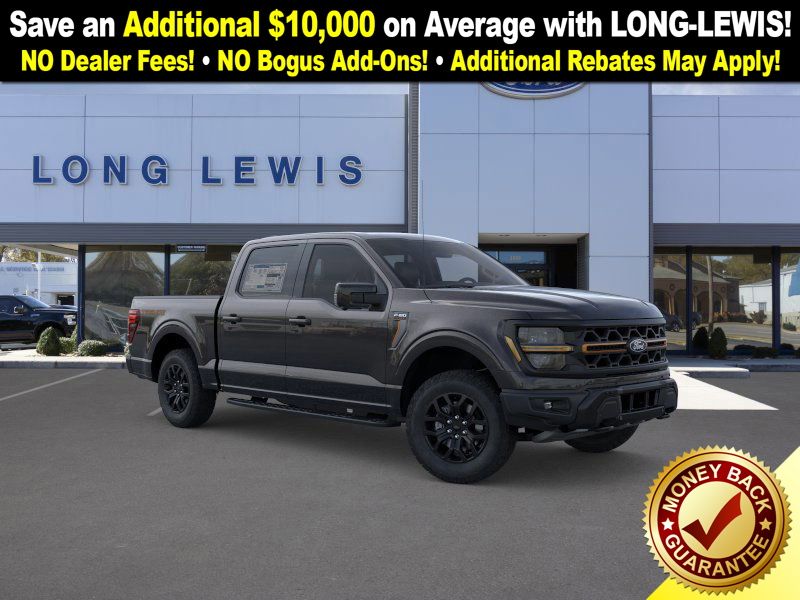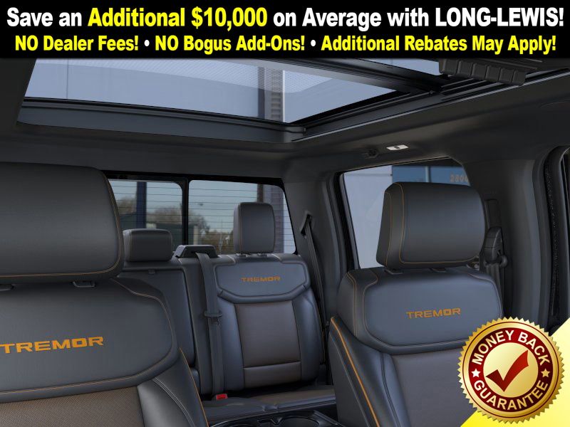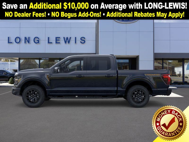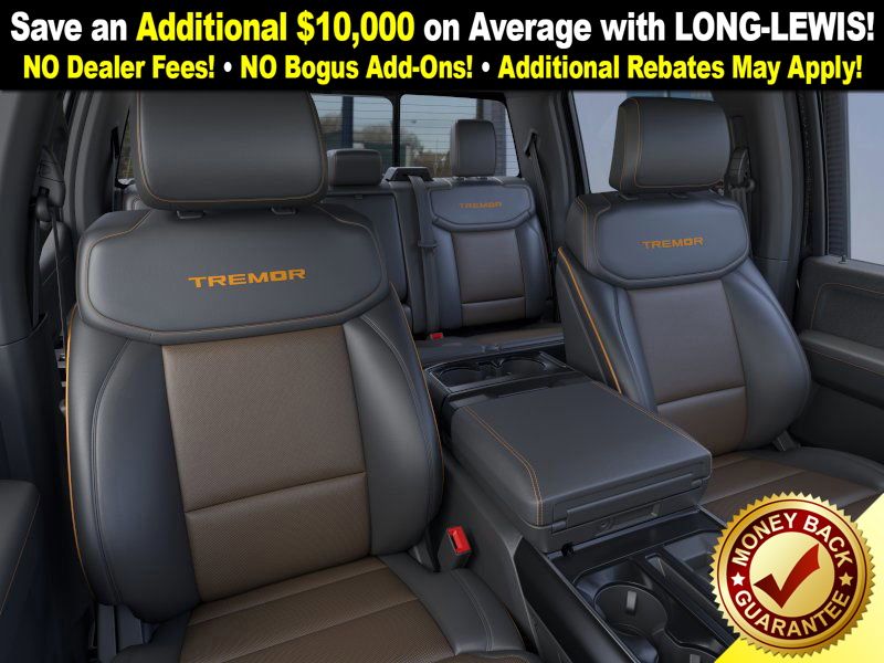 Agate Black Metallic 2025 Ford F-150 Tremor fctp 4WD 10-Speed Automatic 5.0L V8 4WD, 4-Wheel Disc Brakes, 8 Speakers, ABS brakes, Adjustable pedals, Air Conditioning, Alloy wheels, AM/FM radio: SiriusXM with 360L, Auto High-beam Headlights, Auto-dimming door mirrors, Auto-dimming Rear-View mirror, Automatic temperature control, Brake assist, Bumpers: body-color, Compass, Delay-off headlights, Driver door bin, Driver vanity mirror, Dual front impact airbags, Dual front side impact airbags, Electronic Locking w/3.73 Axle Ratio, Electronic Stability Control, Emergency communication system: SYNC 4 911 Assist, Front anti-roll bar, Front Bucket Seats, Front Center Armrest, Front dual zone A/C, Front fog lights, Front License Plate Bracket, Front reading lights, Front wheel independent suspension, Fully automatic headlights, GVWR: 7,100 lbs Payload Package, Heated door mirrors, Heated front seats, Illuminated entry, Low tire pressure warning, Navigation system: Connected Navigation, Occupant sensing airbag, Outside temperature display, Overhead airbag, Overhead console, Panic alarm, Passenger door bin, Passenger vanity mirror, Power door mirrors, Power driver seat, Power passenger seat, Power steering, Power windows, Radio data system, Radio: B&O Sound System by Bang & Olufsen, Rear reading lights, Rear step bumper, Rear window defroster, Remote keyless entry, Security system, Speed control, Split folding rear seat, Steering wheel mounted audio controls, SYNC 4 w/Enhanced Voice Recognition, Tachometer, Telescoping steering wheel, Tilt steering wheel, Traction control, Trip computer, Turn signal indicator mirrors, Twin Panel Moonroof, Unique Sport Cloth 40/Console/40 Power Front Seat, Unique Tremor Leather-Trimmed Bucket Seats, Variably intermittent wipers, Voltmeter, Wheels: 18" Alloy w/Dark Matte Finish, 4WD.