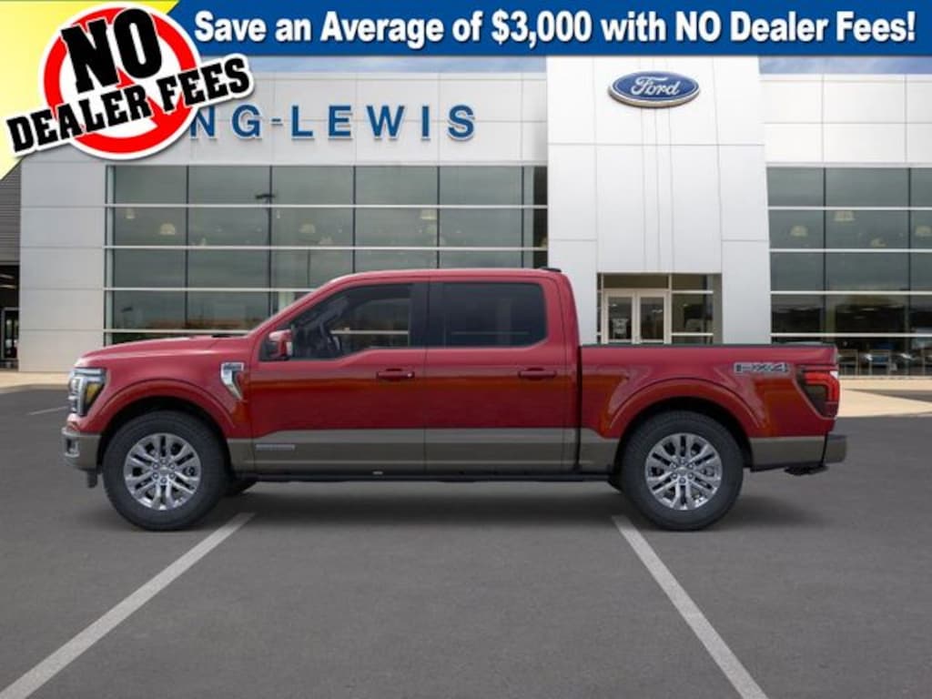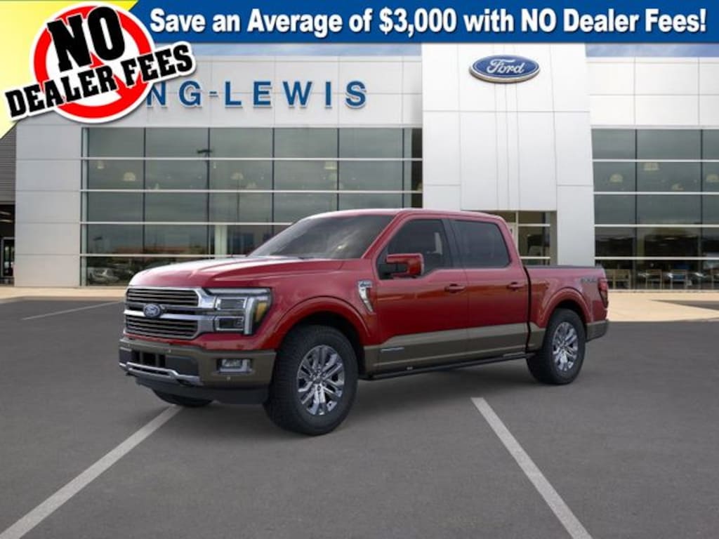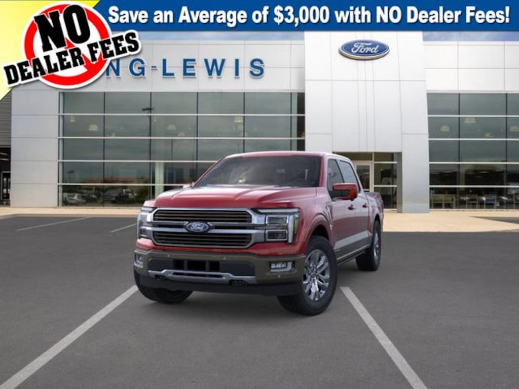 Rapid Red Metallic Tinted Clearcoat 2025 Ford F-150 King Ranch 4WD 10-Speed Automatic 3.5L PowerBoost Full-Hybrid V6 3.5L PowerBoost Full-Hybrid V6, 4WD, 14 Speakers, 4-Wheel Disc Brakes, ABS brakes, Adjustable pedals, Air Conditioning, Alloy wheels, AM/FM radio, Auto High-beam Headlights, Auto tilt-away steering wheel, Auto-dimming door mirrors, Auto-dimming Rear-View mirror, Automatic temperature control, Brake assist, Chrome wheels, Compass, Delay-off headlights, Driver door bin, Driver vanity mirror, Dual front impact airbags, Dual front side impact airbags, Electronic Locking w/3.55 Axle Ratio, Electronic Stability Control, Emergency communication system: SYNC 4 911 Assist, Front anti-roll bar, Front Bucket Seats, Front Center Armrest, Front dual zone A/C, Front fog lights, Front License Plate Bracket, Front reading lights, Front wheel independent suspension, Fully automatic headlights, FX4 Off-Road Package, Garage door transmitter, Genuine wood dashboard insert, Heads-Up Display, Heated door mirrors, Heated front seats, Heated rear seats, Heated steering wheel, Hill Descent Control, Illuminated entry, King Ranch Multicontour Leather Bucket Seats, Leather steering wheel, Low tire pressure warning, Max Tow Electronic Locking w/3.73 Axle Ratio, Memory seat, Monotube Rear Shocks, Navigation system: Connected Navigation, Occupant sensing airbag, Off-Road Tuned Front Shock Absorbers, Outside temperature display, Overhead airbag, Overhead console, Panic alarm, Passenger door bin, Passenger vanity mirror, Pedal memory, Power door mirrors, Power driver seat, Power moonroof, Power passenger seat, Power steering, Power windows, Radio data system, Radio: B&O Unleashed Sound System by Bang & Olufsen, Rain sensing wipers, Rear reading lights, Rear seat center armrest, Rear step bumper, Rear window defroster, Remote keyless entry, Retractable Rear Center Step, Rock Crawl Mode, Security system, Speed control, Split folding rear seat, Steering wheel memory, Steering wheel mounted audio controls, SYNC 4 w/Enhanced Voice Recognition, Tachometer, Telescoping steering wheel, Tilt steering wheel, Traction control, Trip computer, Turn signal indicator mirrors, Variably intermittent wipers, Ventilated front seats, Voltmeter, Wheels: 20" Chrome-Like PVD, 3.5L PowerBoost Full-Hybrid V6, 4WD.