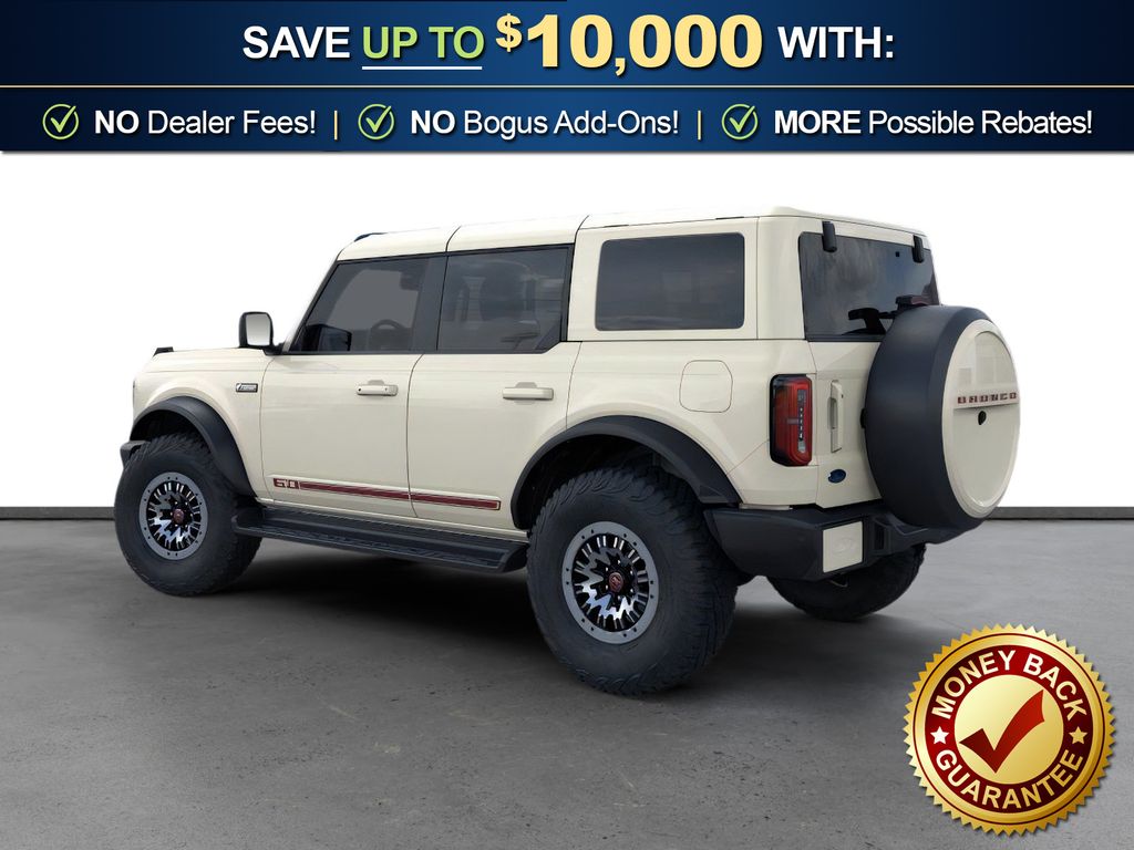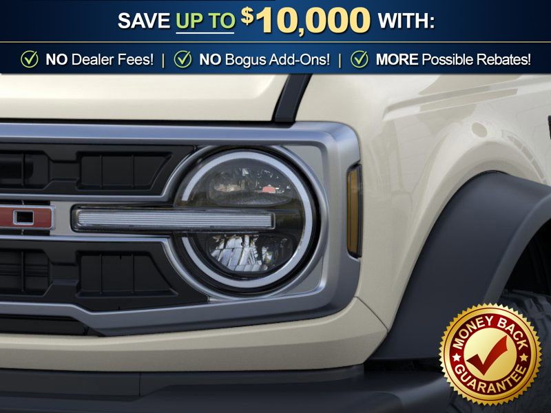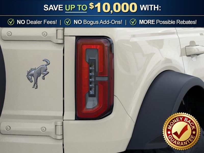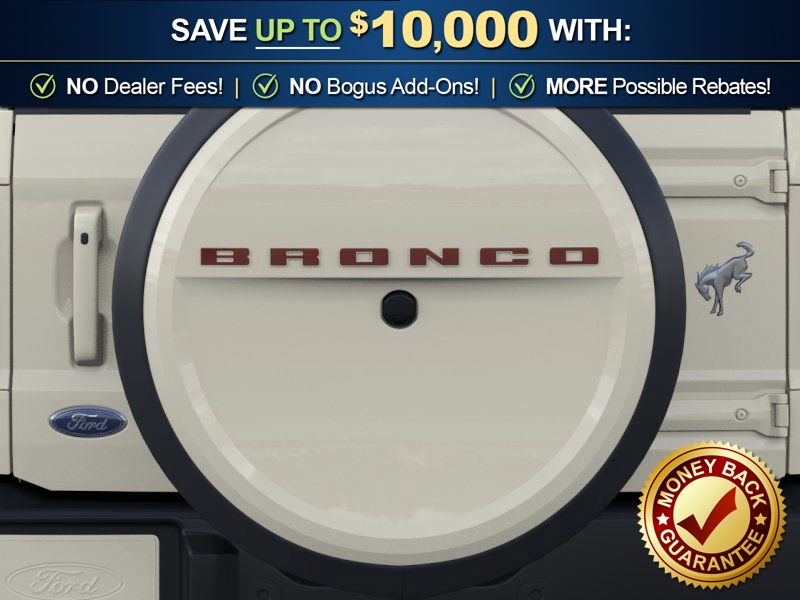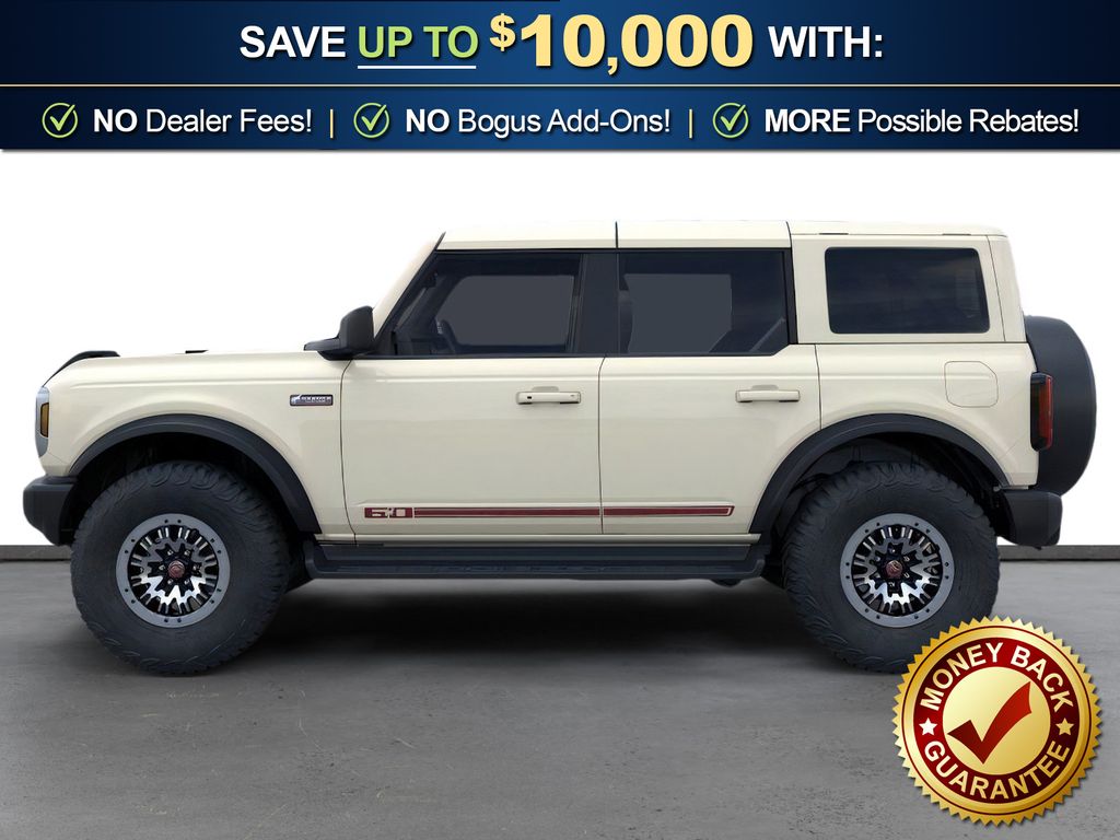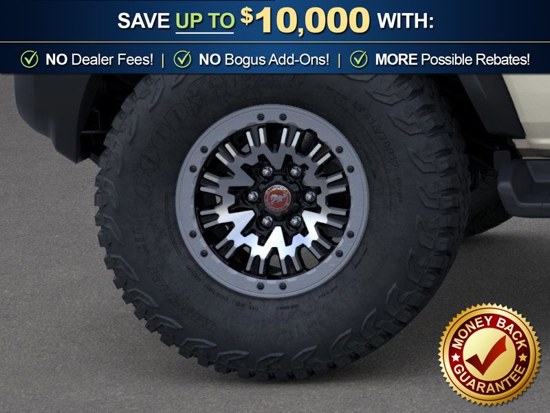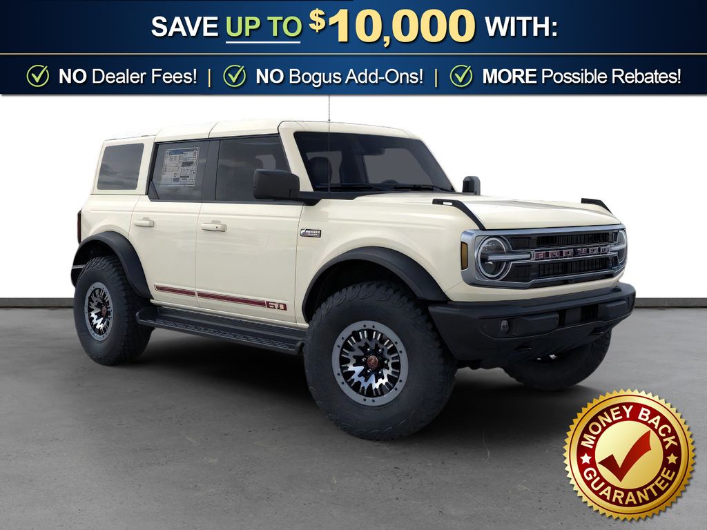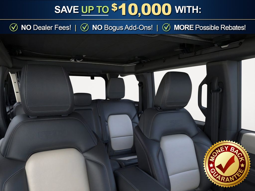 60th Anniversary Package (Black Molded-in-Color Door Handles, Hard Top Sound Deadening Headliner, Leather-Trimmed/Vinyl Bucket Seats, Painted Door Handles, Steel Front Bumper, Warm Alloy Grille, Wheels: 17" Gravity Gray-Painted Alloy, and Wimbledon White-Painted Hard Top), Ford Connectivity Package (1-Year Included), Sasquatch Package (High Clearance Fender Flares, High Clearance Suspension, Position-Sensitive Bilstein Shock Absorbers, and Wheels: 17" Matte Black Alloy), 18" Bright Machined Aluminum Wheels, 4-Wheel Disc Brakes, 7 Speakers, ABS brakes, Air Conditioning, Alloy wheels, AM/FM radio: SiriusXM with 360L, AM/FM Stereo, Auto High-beam Headlights, Auto-dimming Rear-View mirror, Automatic temperature control, Brake assist, Compass, Connected Navigation, Delay-off headlights, Driver door bin, Driver vanity mirror, Dual front impact airbags, Dual front side impact airbags, Electronic Stability Control, Emergency communication system: 911 Assist, Exterior Parking Camera Rear, Front anti-roll bar, Front Bucket Seats, Front Center Armrest, Front dual zone A/C, Front fog lights, Front reading lights, Front wheel independent suspension, Fully automatic headlights, Heated door mirrors, Heated front seats, Heated Leather-Trimmed/Vinyl Bucket Seats, Heated steering wheel, Illuminated entry, Integrated roll-over protection, Leather Shift Knob, Low tire pressure warning, Navigation system: Connected Navigation, Occupant sensing airbag, Outside temperature display, Overhead airbag, Overhead console, Panic alarm, Passenger door bin, Passenger vanity mirror, Power door mirrors, Power driver seat, Power passenger seat, Power steering, Power windows, Radio data system, Rear seat center armrest, Remote keyless entry, Security system, SiriusXM with 360L, Speed control, Split folding rear seat, Steering wheel mounted audio controls, SYNC 4, Tachometer, Telescoping steering wheel, Tilt steering wheel, Traction control, Trip computer, Variably intermittent wipers, and Voltmeter. Price includes: $750 - Retail Customer Cash. Exp. 04/30/2026