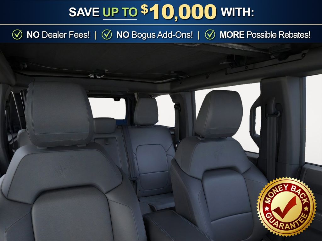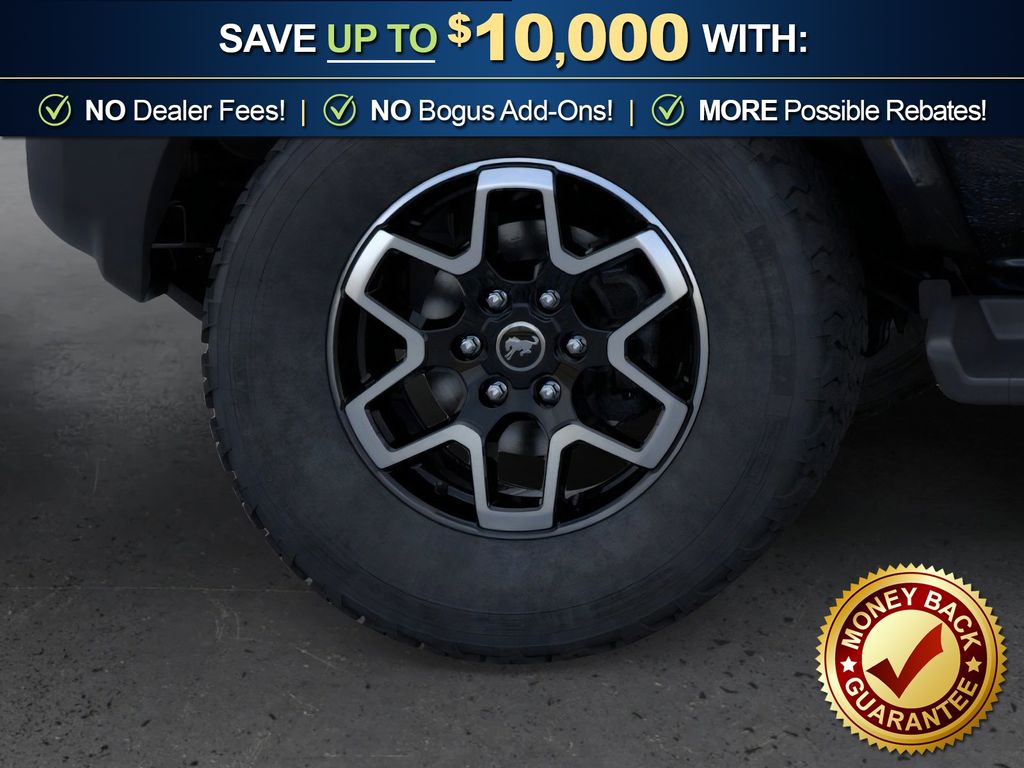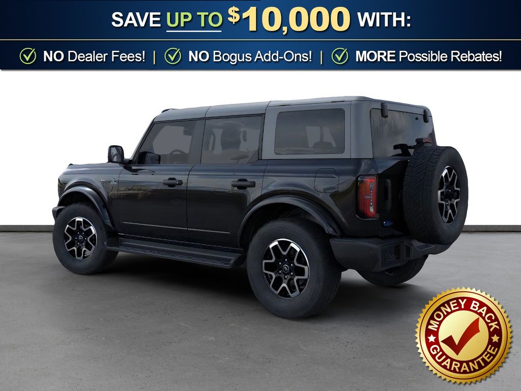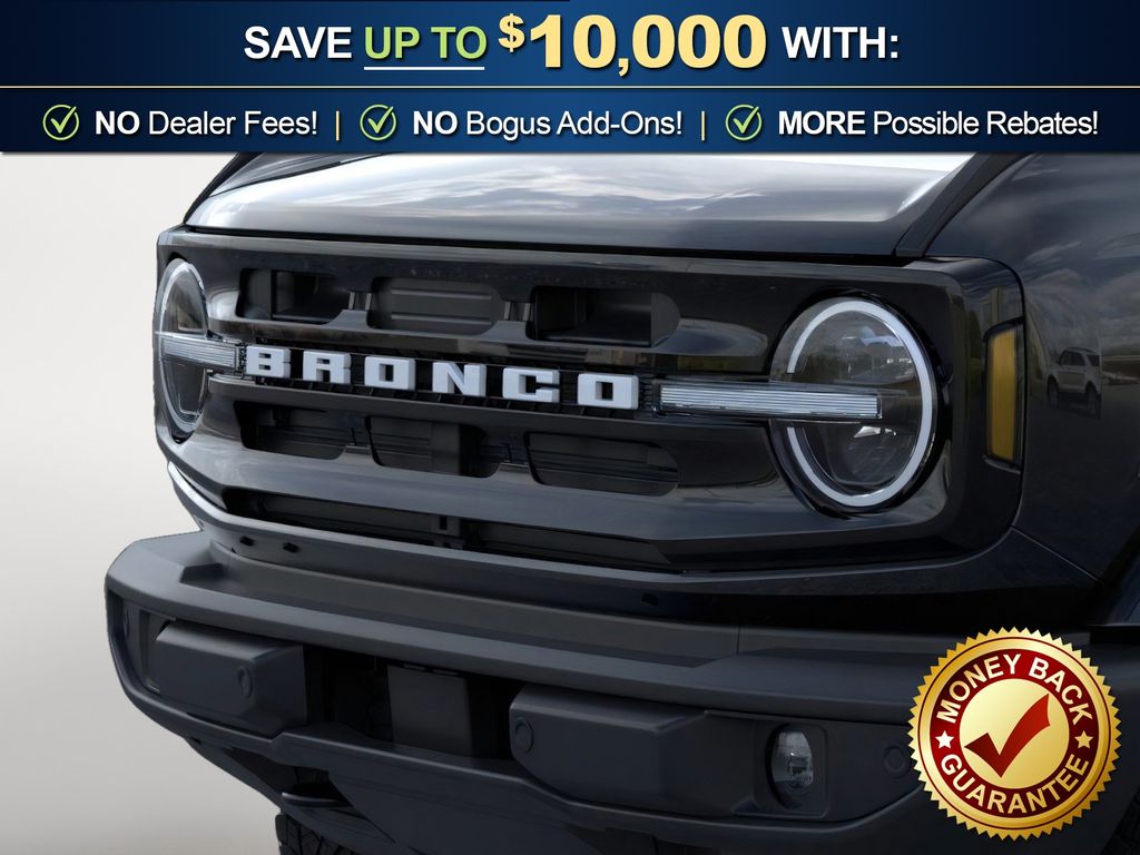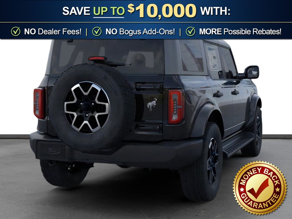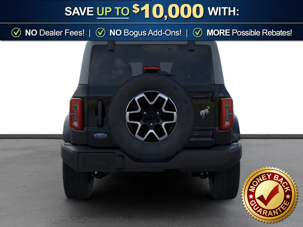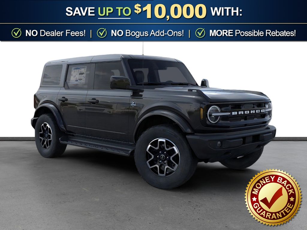 Dealer Discount of $1,215 off MSRP Shadow Black 2026 Ford Bronco Outer Banks FCT 4WD 10-Speed Automatic 2.3L EcoBoost I-4 18" Bright Machined Aluminum Wheels, 3.73 Axle Ratio, 4-Wheel Disc Brakes, 7 Speakers, ABS brakes, Air Conditioning, Alloy wheels, AM/FM radio: SiriusXM with 360L, AM/FM Stereo, Auto High-beam Headlights, Auto-dimming Rear-View mirror, Automatic temperature control, Brake assist, Carbonized Gray Molded-in-Color Hard Top, Compass, Connected Navigation, Delay-off headlights, Driver door bin, Driver vanity mirror, Dual front impact airbags, Dual front side impact airbags, Electronic Stability Control, Emergency communication system: 911 Assist, Exterior Parking Camera Rear, Ford Connectivity Package (1-Year Included), Front anti-roll bar, Front Bucket Seats, Front Center Armrest, Front dual zone A/C, Front fog lights, Front License Plate Bracket, Front reading lights, Front wheel independent suspension, Fully automatic headlights, Hard Top Sound Deadening Headliner, Heated door mirrors, Heated front seats, Heated Leather-Trimmed/Vinyl Bucket Seats, Heated steering wheel, Illuminated entry, Integrated roll-over protection, Leather Shift Knob, Low tire pressure warning, Navigation system: Connected Navigation, Occupant sensing airbag, Outside temperature display, Overhead airbag, Overhead console, Panic alarm, Passenger door bin, Passenger vanity mirror, Power door mirrors, Power driver seat, Power passenger seat, Power steering, Power windows, Radio data system, Rear seat center armrest, Rear-Window Defroster and Washer, Remote keyless entry, Security system, SiriusXM with 360L, Speed control, Split folding rear seat, Steering wheel mounted audio controls, SYNC 4, Tachometer, Telescoping steering wheel, Tilt steering wheel, Traction control, Trip computer, Variably intermittent wipers, Voltmeter. Price includes: $750 - Retail Bonus Cash. Exp. 04/30/2026 $750 - Retail Customer Cash. Exp. 04/30/2026