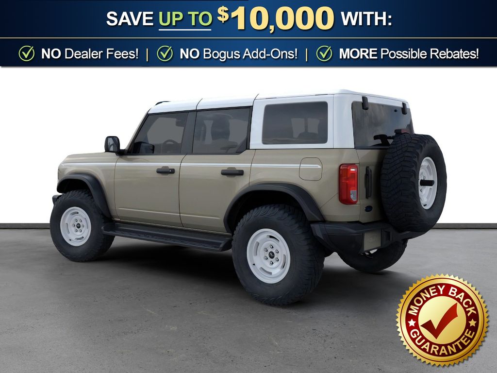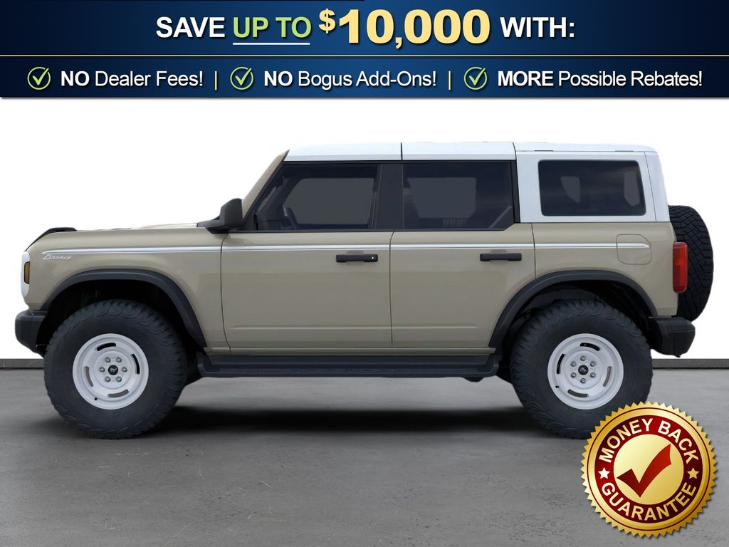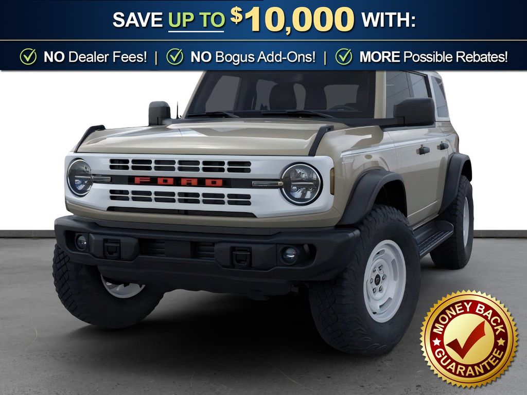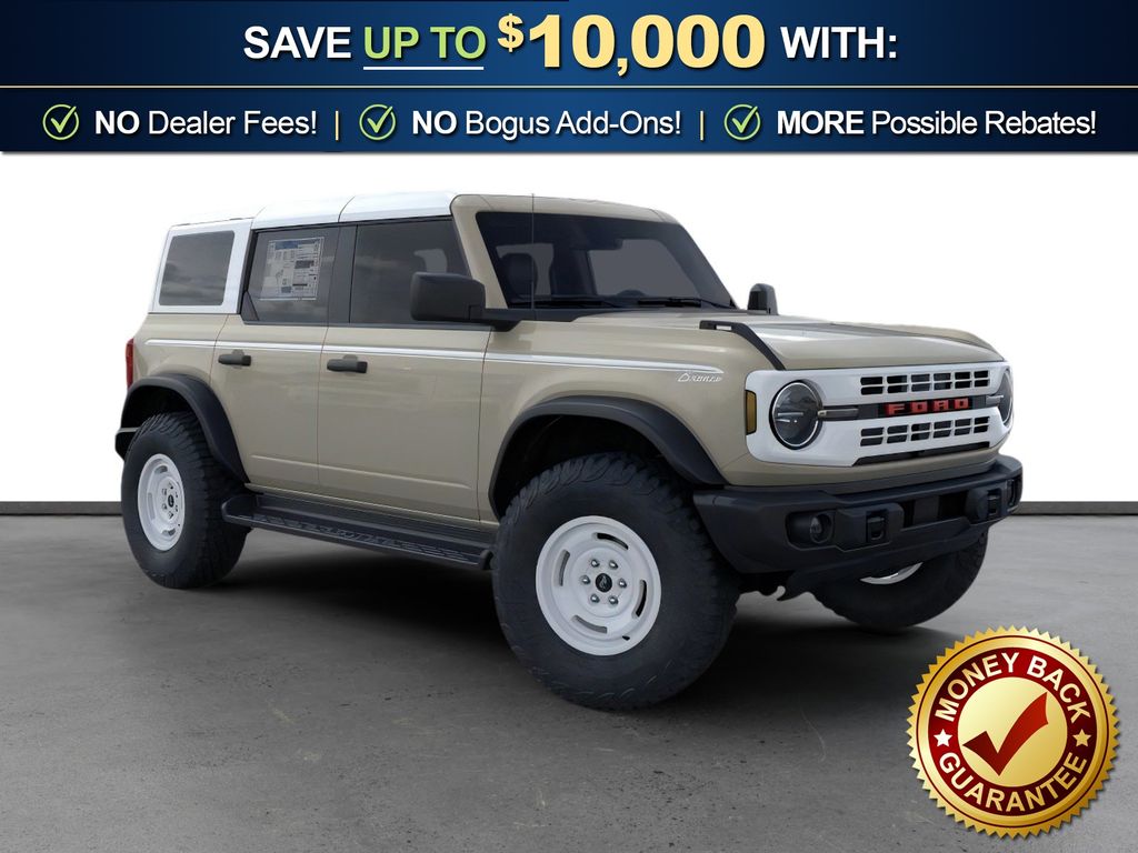 Dealer Discount of $917 off MSRP Desert Sand 2026 Ford Bronco Heritage Edition NFT 4WD 10-Speed Automatic 2.7L EcoBoost V6 4-Wheel Disc Brakes, 7 Speakers, ABS brakes, Air Conditioning, Alloy wheels, AM/FM radio: SiriusXM with 360L, AM/FM Stereo, Auto High-beam Headlights, Auto-dimming Rear-View mirror, Automatic temperature control, Brake assist, Compass, Connected Navigation, Convertible HardTop, Convertible roof lining, Delay-off headlights, Driver door bin, Driver vanity mirror, Dual front impact airbags, Dual front side impact airbags, Electronic Stability Control, Emergency communication system: 911 Assist, Exterior Parking Camera Rear, Ford Connectivity Package (1-Year Included), Front anti-roll bar, Front Bucket Seats, Front Center Armrest, Front dual zone A/C, Front fog lights, Front License Plate Bracket, Front reading lights, Front wheel independent suspension, Fully automatic headlights, Glass rear window, Heated door mirrors, Heated front seats, Heated steering wheel, Illuminated entry, Integrated roll-over protection, Low tire pressure warning, Navigation system: Connected Navigation, Occupant sensing airbag, Outside temperature display, Overhead airbag, Overhead console, Panic alarm, Passenger door bin, Passenger vanity mirror, Plaid Cloth Front Heated Bucket Seats, Power door mirrors, Power steering, Power windows, Radio data system, Rear window defroster, Rear window wiper, Remote keyless entry, Security system, SiriusXM with 360L, Speed control, Split folding rear seat, Steering wheel mounted audio controls, SYNC 4, Tachometer, Telescoping steering wheel, Tilt steering wheel, Traction control, Trip computer, Variably intermittent wipers, Wheels: 17" Unique White.