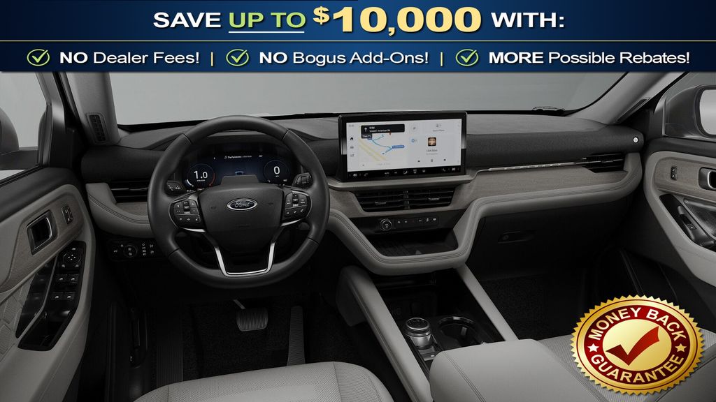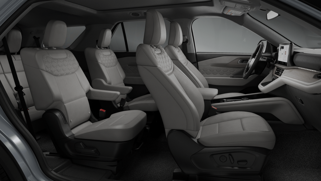 Space White Metallic 2026 Ford Explorer Platinum NFT 4WD 10-Speed Automatic 2.3L EcoBoost I-4 4WD, 14 Speakers, 3rd row seats: bench, 4-Wheel Disc Brakes, ABS brakes, ActiveX Trimmed Captain's Chairs, Air Conditioning, Alloy wheels, AM/FM radio: SiriusXM with 360L, Apple CarPlay/Android Auto, Auto High-beam Headlights, Auto-dimming door mirrors, Auto-dimming Rear-View mirror, Automatic temperature control, Brake assist, Bumpers: body-color, Compass, Delay-off headlights, Driver door bin, Driver vanity mirror, Dual front impact airbags, Dual front side impact airbags, Electronic Stability Control, Emergency communication system: 911 Assist, Exterior Parking Camera Rear, Four wheel independent suspension, Front anti-roll bar, Front Bucket Seats, Front Center Armrest, Front dual zone A/C, Front fog lights, Front License Plate Bracket, Front reading lights, Fully automatic headlights, Garage door transmitter, Heated door mirrors, Heated front seats, Heated rear seats, Heated steering wheel, Illuminated entry, Knee airbag, Leather steering wheel, Low tire pressure warning, Lux Leather Package, Memory seat, Navigation System, Occupant sensing airbag, Outside temperature display, Overhead airbag, Overhead console, Panic alarm, Panoramic Fixed Glass Roof with Power Shade, Passenger door bin, Passenger vanity mirror, Platinum Badges on Front Row Seats, Power door mirrors, Power driver seat, Power Liftgate, Power passenger seat, Power steering, Power windows, Premium Leather Seating Surfaces Captain's Chairs, Quilting and Stitching on Door Panels, Quilting and Stitching on Seats, Radio data system, Radio: B&O Sound System by Bang & Olufsen with HD, Rain sensing wipers, Rear air conditioning, Rear anti-roll bar, Rear reading lights, Rear window defroster, Rear window wiper, Remote keyless entry, SecuriCode Keyless Entry Keypad, Security system, Speed control, Speed-sensing steering, Speed-Sensitive Wipers, Split folding rear seat, Spoiler, Steering wheel mounted audio controls, Tachometer, Telescoping steering wheel, Tilt steering wheel, Traction control, Trip computer, Turn signal indicator mirrors, Variably intermittent wipers, Ventilated front seats, Wheels: : 21" Bright Machined Aluminum w/Tarnish Dark Pockets, Wheels: 20" Luster Nickel-Painted Aluminum, 4WD.