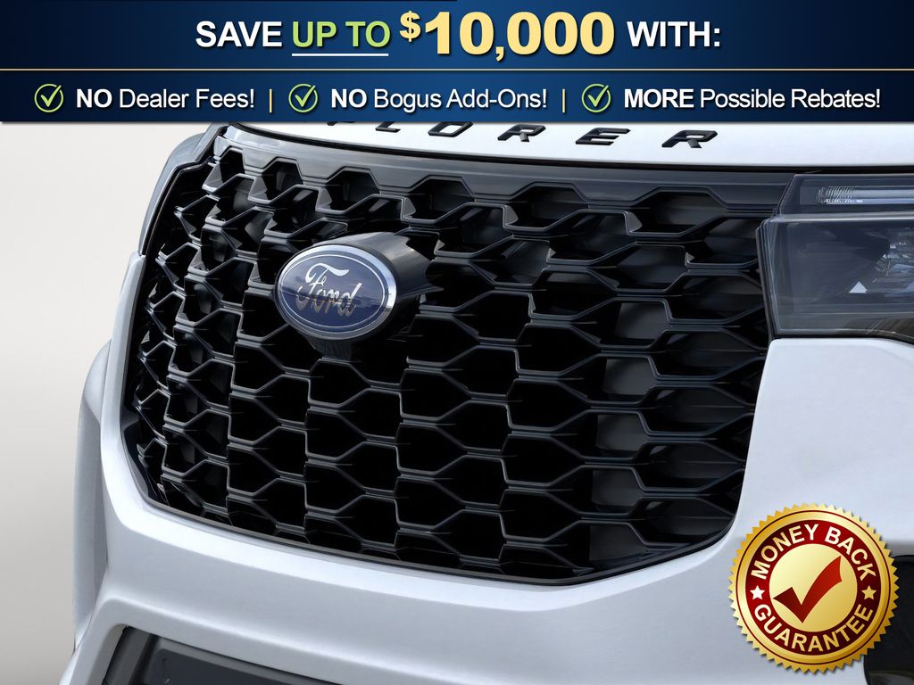 Star White Metallic Tri-Coat 2026 Ford Explorer ST-Line fctp RWD 10-Speed Automatic 2.3L EcoBoost I-4 10 Speakers, 110V/150W AC Power Outlet, 2nd Row Heated Seats, 3rd row seats: bench, 4-Wheel Disc Brakes, ABS brakes, Air Conditioning, Alloy wheels, AM/FM radio: SiriusXM with 360L, Ambient Lighting, Apple CarPlay/Android Auto, Auto High-beam Headlights, Auto-Dimming Interior Rear-View Mirror, Automatic temperature control, Brake assist, Bumpers: body-color, Compass, Delay-off headlights, Driver door bin, Driver vanity mirror, Dual front impact airbags, Dual front side impact airbags, Electronic Stability Control, Emergency communication system: 911 Assist, Exterior Parking Camera Rear, Four wheel independent suspension, Front anti-roll bar, Front Bucket Seats, Front Center Armrest, Front dual zone A/C, Front fog lights, Front License Plate Bracket, Front reading lights, Fully automatic headlights, Garage door transmitter, Heated door mirrors, Heated front seats, Heated steering wheel, Heated Unique Cloth Captain's Chairs, Illuminated entry, Knee airbag, Leather steering wheel, Low tire pressure warning, Manual-Folding Sideview Mirrors, Memory Driver's Seat, Navigation System, Occupant sensing airbag, Outside temperature display, Overhead airbag, Overhead console, Panic alarm, Passenger door bin, Passenger vanity mirror, Performance Brakes, Power door mirrors, Power driver seat, Power Liftgate, Power passenger seat, Power steering, Power windows, Premium Package, Rear air conditioning, Rear anti-roll bar, Rear reading lights, Rear window defroster, Rear window wiper, Remote keyless entry, SecuriCode Keyless Entry Keypad, Security system, Speed control, Speed-sensing steering, Speed-Sensitive Wipers, Split folding rear seat, Spoiler, ST-Line Street Pack, Steering wheel mounted audio controls, Tachometer, Telescoping steering wheel, Tilt steering wheel, Traction control, Trip computer, Variably intermittent wipers, Wheels: 20" Ebony-Painted Machined Aluminum, Wheels: 21" Magnetite-Painted Aluminum.