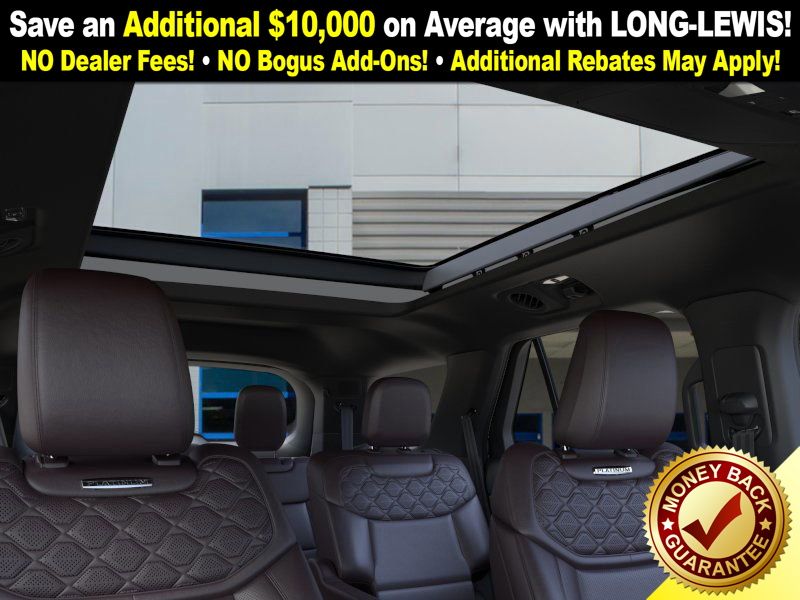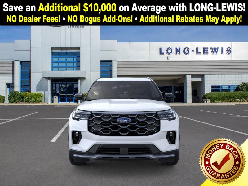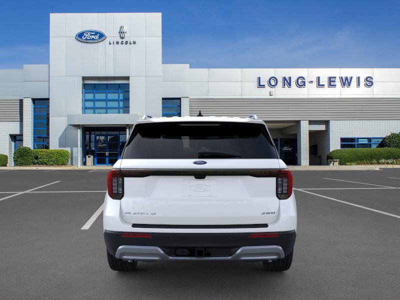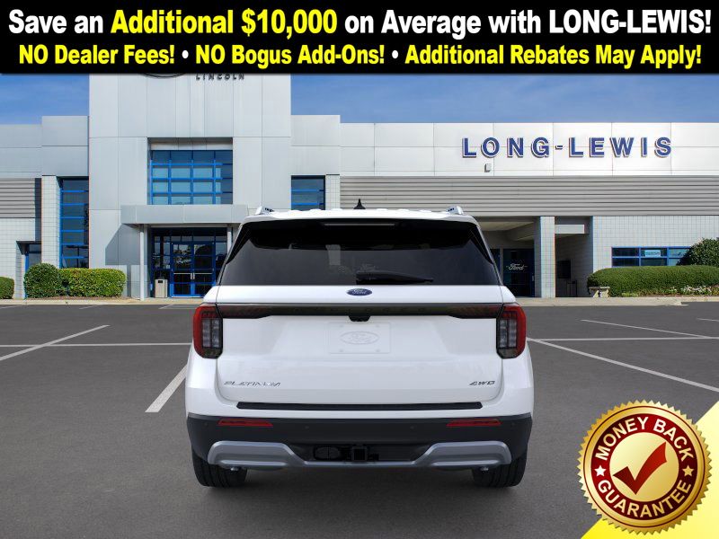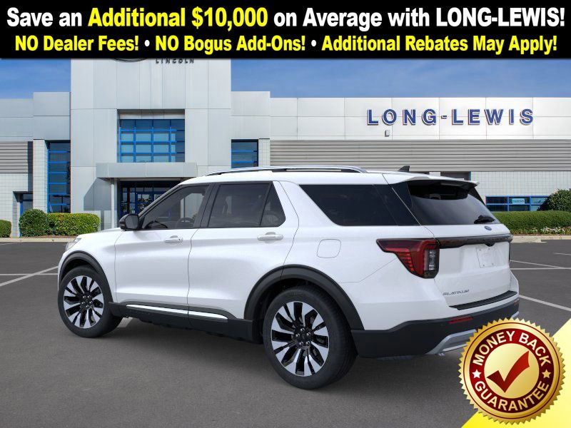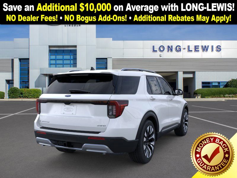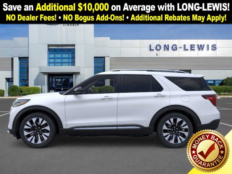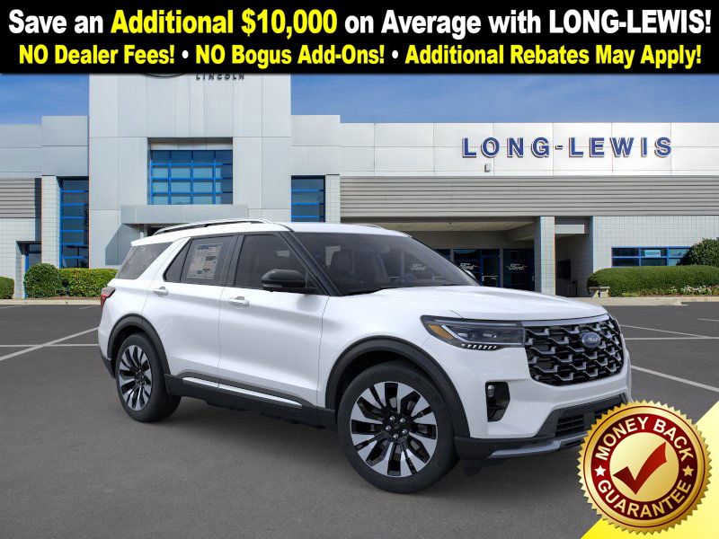 Dealer Discount of $4,443 off MSRP Star White Metallic Tri-Coat 2026 Ford Explorer Platinum FCT 4WD 10-Speed Automatic 2.3L EcoBoost I-4 4WD, 14 Speakers, 3rd row seats: bench, 4-Wheel Disc Brakes, ABS brakes, ActiveX Trimmed Captain's Chairs, Air Conditioning, Alloy wheels, AM/FM radio: SiriusXM with 360L, Apple CarPlay/Android Auto, Auto High-beam Headlights, Auto-dimming door mirrors, Auto-dimming Rear-View mirror, Automatic temperature control, Brake assist, Bumpers: body-color, Compass, Delay-off headlights, Driver door bin, Driver vanity mirror, Dual front impact airbags, Dual front side impact airbags, Electronic Stability Control, Emergency communication system: 911 Assist, Exterior Parking Camera Rear, Four wheel independent suspension, Front anti-roll bar, Front Bucket Seats, Front Center Armrest, Front dual zone A/C, Front fog lights, Front License Plate Bracket, Front reading lights, Fully automatic headlights, Garage door transmitter, Heated door mirrors, Heated front seats, Heated rear seats, Heated steering wheel, Illuminated entry, Internet access capable: FordPass Connect 5G, Knee airbag, Leather steering wheel, Low tire pressure warning, Lux Leather Package, Memory seat, Navigation System, Occupant sensing airbag, Outside temperature display, Overhead airbag, Overhead console, Panic alarm, Panoramic Fixed Glass Roof with Power Shade, Passenger door bin, Passenger vanity mirror, Platinum Badges on Front Row Seats, Power door mirrors, Power driver seat, Power Liftgate, Power passenger seat, Power steering, Power windows, Premium Leather Seating Surfaces Captain's Chairs, Quilting and Stitching on Door Panels, Quilting and Stitching on Seats, Radio data system, Radio: B&O Sound System by Bang & Olufsen with HD, Rain sensing wipers, Rear air conditioning, Rear anti-roll bar, Rear reading lights, Rear window defroster, Rear window wiper, Remote keyless entry, Security system, Speed control, Speed-sensing steering, Speed-Sensitive Wipers, Split folding rear seat, Spoiler, Steering wheel mounted audio controls, Tachometer, Telescoping steering wheel, Tilt steering wheel, Traction control, Trip computer, Turn signal indicator mirrors, Variably intermittent wipers, Ventilated front seats, Wheels: : 21" Bright Machined Aluminum w/Tarnish Dark Pockets, Wheels: 20" Luster Nickel-Painted Aluminum, 4WD.
