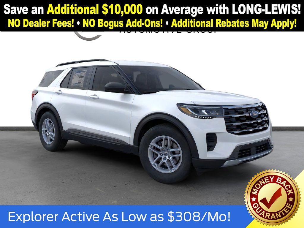 Star White Metallic Tri-Coat 2026 Ford Explorer Active NFT RWD 10-Speed Automatic 2.3L EcoBoost I-4 3rd row seats: bench, 4-Wheel Disc Brakes, 6 Speakers, ABS brakes, Air Conditioning, Alloy wheels, AM/FM radio: SiriusXM with 360L, AM/FM Stereo, Apple CarPlay/Android Auto, Auto High-beam Headlights, Automatic temperature control, Brake assist, Bumpers: body-color, Compass, Delay-off headlights, Driver door bin, Driver vanity mirror, Dual front impact airbags, Dual front side impact airbags, Electronic Stability Control, Emergency communication system: 911 Assist, Exterior Parking Camera Rear, Four wheel independent suspension, Front anti-roll bar, Front Bucket Seats, Front Center Armrest, Front dual zone A/C, Front reading lights, Fully automatic headlights, Heated door mirrors, Illuminated entry, Internet access capable: FordPass Connect 5G, Knee airbag, Low tire pressure warning, Navigation System, Occupant sensing airbag, Outside temperature display, Overhead airbag, Overhead console, Panic alarm, Passenger door bin, Passenger vanity mirror, Power driver seat, Power steering, Power windows, Rear air conditioning, Rear anti-roll bar, Rear reading lights, Rear window defroster, Rear window wiper, Remote keyless entry, Security system, Speed control, Speed-sensing steering, Speed-Sensitive Wipers, Split folding rear seat, Spoiler, Steering wheel mounted audio controls, Tachometer, Telescoping steering wheel, Tilt steering wheel, Traction control, Trip computer, Unique Cloth Captain's Chairs, Variably intermittent wipers, Wheels: 18" Sparkle Silver-Painted Aluminum.
