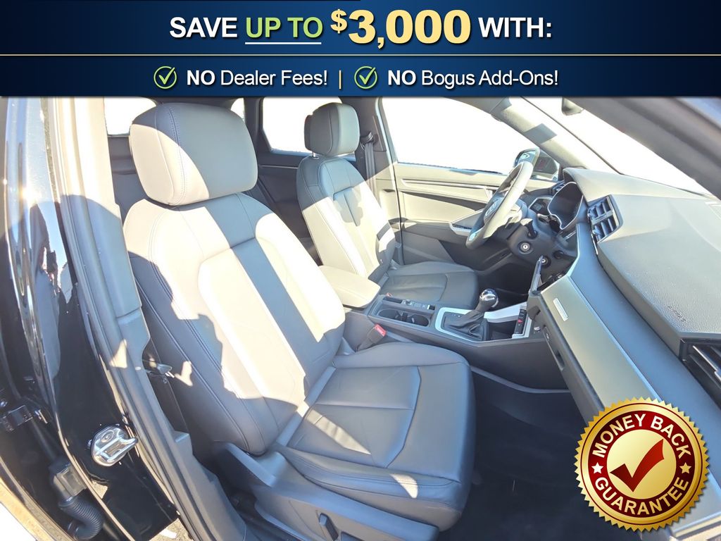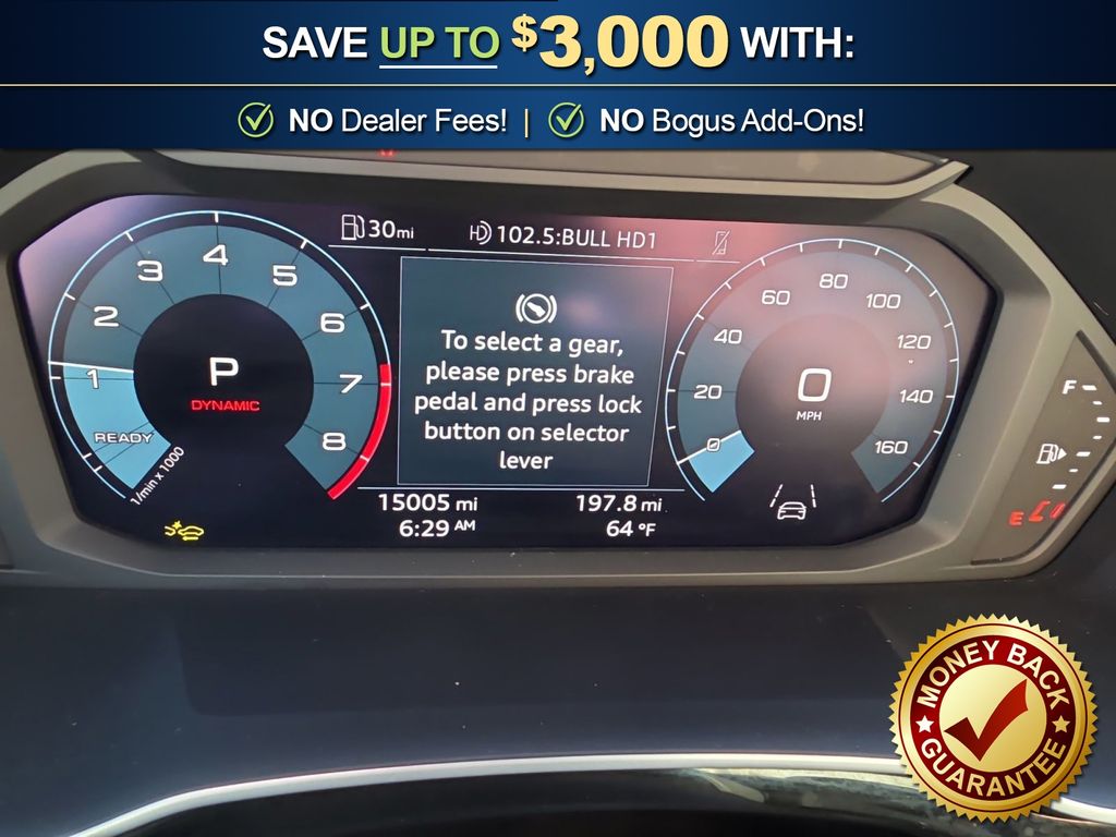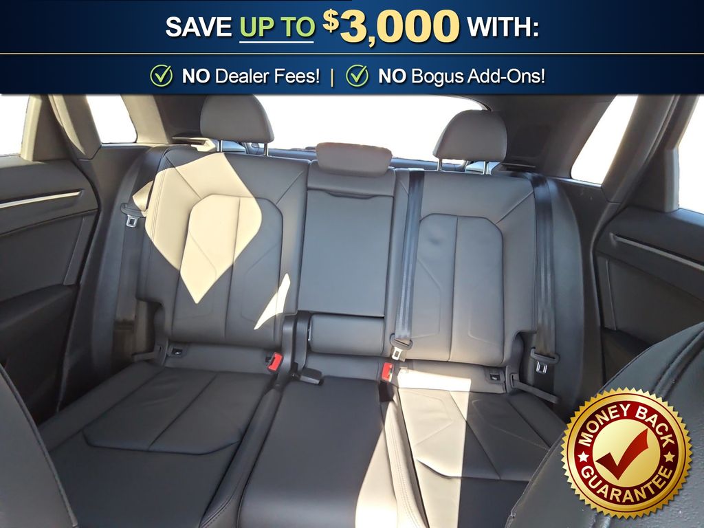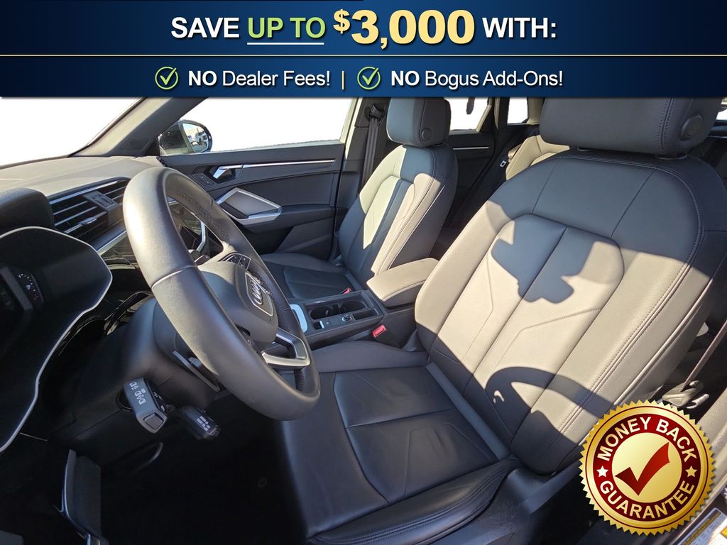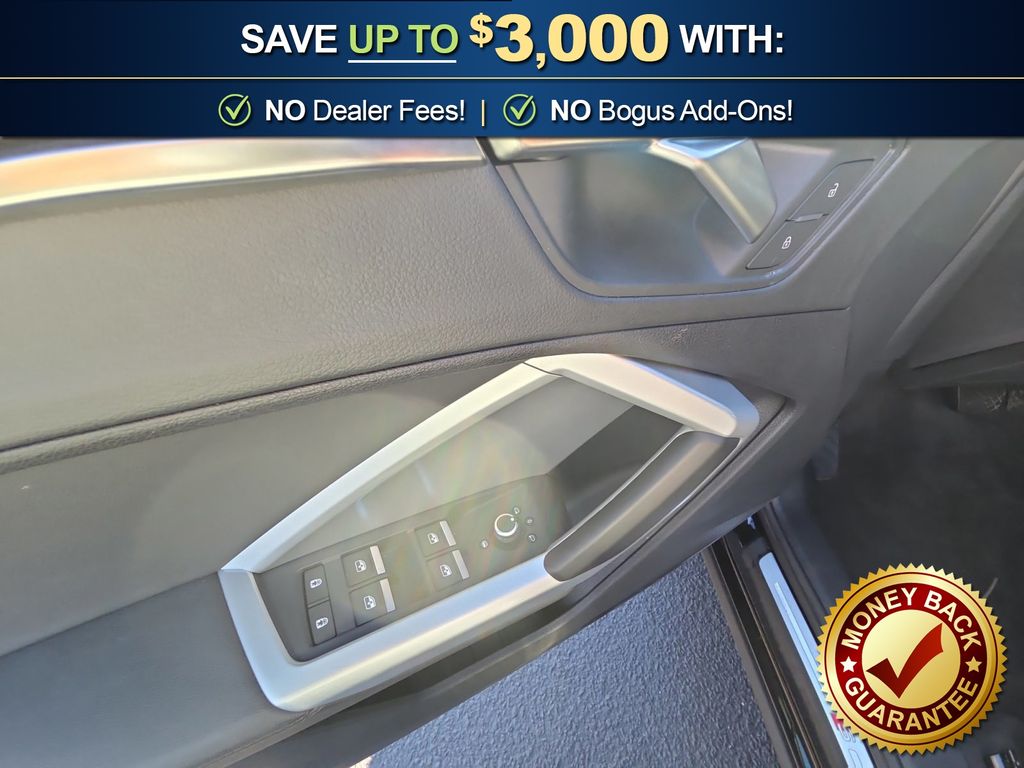 10 Speakers, 4-Wheel Disc Brakes, ABS brakes, Air Conditioning, Alloy wheels, AM/FM radio, Audi smartphone interface (Apple CarPlay/Android Auto), Auto High-beam Headlights, Automatic temperature control, Brake assist, Bumpers: body-color, Delay-off headlights, Driver door bin, Driver vanity mirror, Dual front impact airbags, Dual front side impact airbags, Electronic Stability Control, Emergency communication system: Audi connect CARE, Exterior Parking Camera Rear, Four wheel independent suspension, Front anti-roll bar, Front Bucket Seats, Front Center Armrest, Front dual zone A/C, Front fog lights, Front reading lights, Fully automatic headlights, Heated door mirrors, Heated Front Bucket Seats, Heated front seats, Illuminated entry, Knee airbag, Leather Seating Surfaces, Leather Shift Knob, Leather steering wheel, Low tire pressure warning, Occupant sensing airbag, Outside temperature display, Overhead airbag, Overhead console, Panic alarm, Passenger door bin, Passenger vanity mirror, Power door mirrors, Power driver seat, Power Liftgate, Power moonroof: Panoramic, Power passenger seat, Power steering, Power windows, Radio data system, Radio: Audi Sound System, Rain sensing wipers, Rear air conditioning, Rear anti-roll bar, Rear reading lights, Rear seat center armrest, Rear window defroster, Rear window wiper, Remote keyless entry, Speed control, Speed-sensing steering, Split folding rear seat, Spoiler, Steering wheel mounted audio controls, Tachometer, Telescoping steering wheel, Tilt steering wheel, Traction control, Trip computer, Turn signal indicator mirrors, Variably intermittent wipers, Wheels: 18" 5-V-Spoke-S Design. 2025 Audi Q3 Premium S Line quattro