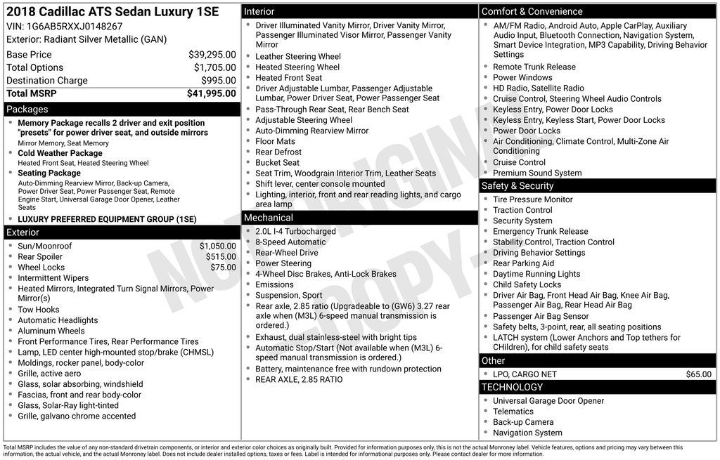 2018 Cadillac ATS 2.0L Turbo Luxury Radiant Silver Metallic 2.0L Turbo Luxury RWD 8-Speed Automatic 2.0L Turbo I4 DI DOHC VVT 10 Speakers, 110V Power Receptacle, 2.85 Rear Axle Ratio, 4-Wheel Disc Antilock Brembo Fr Performance Brakes, 4-Wheel Disc Brakes, ABS brakes, Active Aero Grille, Air Conditioning, Alloy wheels, AM/FM radio: SiriusXM, Apple CarPlay/Android Auto, Auto-dimming door mirrors, Auto-dimming Rear-View mirror, Automatic Heated Steering Wheel, Automatic Stop/Start, Automatic temperature control, Bluetooth For Phone/Audio, Bose Premium Surround Sound 10-Speaker System, Brake assist, Bumpers: body-color, Cargo Net, Cold Weather Package, Compass, Delay-off headlights, Driver & Front Passenger Frontal Air Bags, Driver & Front Passenger Seat Adjusters, Driver door bin, Driver vanity mirror, Dual front impact airbags, Dual front side impact airbags, Electronic Stability Control, Emergency communication system: OnStar and Cadillac connected services capable, Exterior Parking Camera Rear, Four wheel independent suspension, Front anti-roll bar, Front Bucket Seats, Front Center Armrest, Front dual zone A/C, Front reading lights, Fully automatic headlights, Garage door transmitter, Heated door mirrors, Heated Driver & Front Passenger Seats, Heated front seats, Heated steering wheel, Illuminated entry, Knee airbag, Leather Seating Surfaces, Leather Shift Knob, Low tire pressure warning, Luxury Equipment Group 1SE, Memory seat, Navigation System, Occupant sensing airbag, Outside temperature display, Overhead airbag, Overhead console, Panic alarm, Passenger door bin, Passenger vanity mirror, Power door mirrors, Power driver seat, Power passenger seat, Power steering, Power Sunroof, Power windows, Radio data system, Radio: Cadillac User Experience AM/FM Stereo w/Nav, Rear anti-roll bar, Rear reading lights, Rear seat center armrest, Rear Spoiler, Rear window defroster, Remote keyless entry, SiriusXM Satellite & HD Radio, Speed control, Speed-sensing steering, Split folding rear seat, Steering wheel mounted audio controls, Tachometer, Telescoping steering wheel, Tilt steering wheel, Traction control, Trip computer, Turn signal indicator mirrors, Variably intermittent wipers, Voltmeter, Wheel Locks, Wheels: 17" x 8" Polished Alloy, Wireless Charging.