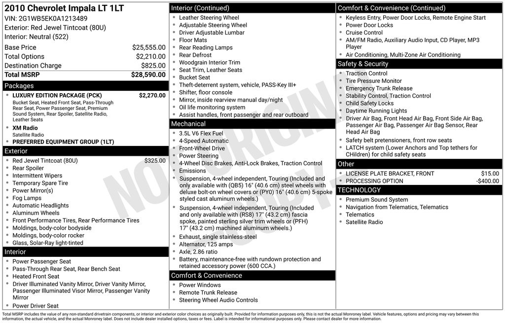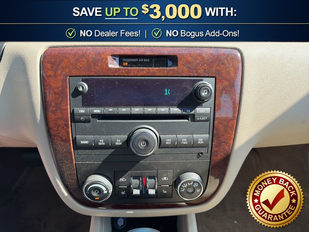 17" Machined Aluminum Wheels, 4-Wheel Disc Brakes, 4-Wheel Independent Touring Suspension (FE2), 40/40 Front Bucket Seats, 6 Speakers, 6-Way Power Front Passenger Seat Adjuster, ABS brakes, Air Conditioning, Alloy wheels, AM/FM radio: XM, AM/FM Stereo w/CD/MP3 Playback, Bodyside moldings, Bumpers: body-color, CD player, Cloth Seat Trim, Compass, Delay-off headlights, Driver & Front Passenger Heated Seats, Driver door bin, Driver vanity mirror, Dual front impact airbags, Dual front side impact airbags, Electronic Stability Control, Emergency communication system: OnStar Safe & Sound, Flip-and-Fold Flat Rear Seat w/Armrest, Four wheel independent suspension, Front anti-roll bar, Front Bucket Seats, Front Center Armrest, Front dual zone A/C, Front fog lights, Front License Plate Bracket, Front reading lights, Fully automatic headlights, Illuminated entry, Leather steering wheel, Leather-Accent Seating, Low tire pressure warning, Luxury Edition Package, Occupant sensing airbag, Outside temperature display, Overhead airbag, Panic alarm, Passenger door bin, Passenger vanity mirror, Power door mirrors, Power driver seat, Power steering, Power windows, Preferred Equipment Group 1LT, Radio data system, Rear anti-roll bar, Rear reading lights, Rear Spoiler, Rear window defroster, Remote keyless entry, Speed control, Steering wheel mounted audio controls, Tachometer, Tilt steering wheel, Traction control, Trip computer, Variably intermittent wipers, XM Radio, XM Radio 1-Year Subscription. 2010 Chevrolet Impala LT