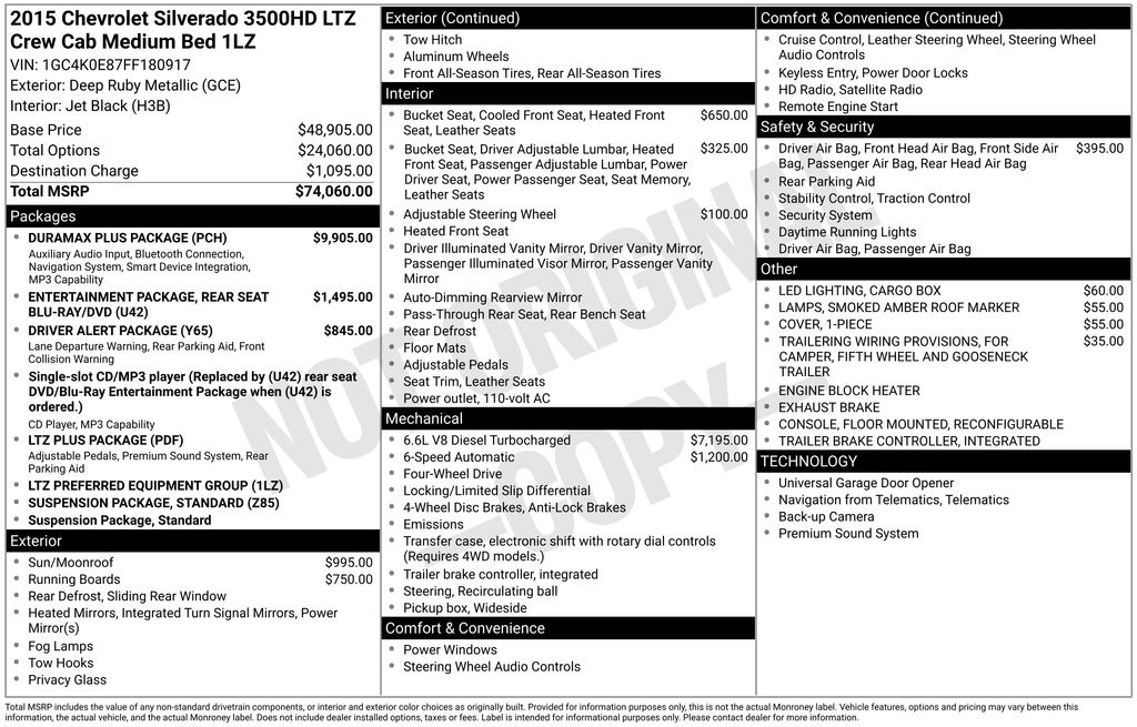 2015 Chevrolet Silverado 3500HD LTZ Deep Ruby Metallic LTZ 4WD Allison 1000 6-Speed Automatic Duramax 6.6L V8 Turbodiesel Allison 1000 6-Speed Automatic, 4WD, Black Leather, 110-Volt AC Power Outlet, 150 Amps Alternator, 18" Polished Aluminum Wheels, 4-Wheel Disc Brakes, 4.2" Diagonal Color Display Driver Info Center, 6 Speakers, ABS brakes, Air Conditioning, Alloy wheels, AM/FM radio: SiriusXM, Auto-Dimming Inside Rear-View Mirror, Auto-dimming Rear-View mirror, Automatic temperature control, Bodyside moldings, Bose 6 Speaker Sound System, Brake assist, Bumpers: chrome, CD player, Chrome Bodyside Moldings, Chrome Door Handles, Chrome Power-Adjustable Heated Outside Mirrors, Color-Keyed Carpeting Floor Covering, Compass, Deep-Tinted Glass, Delay-off headlights, Driver & Front Passenger Visors, Driver Alert Package, Driver door bin, Driver vanity mirror, Dual front impact airbags, Dual-Zone Automatic Climate Control, Duramax Plus Package, Electric Rear-Window Defogger, Electronic Shift Transfer Case, Electronic Stability Control, Emergency communication system, Engine Block Heater, Exhaust Brake, Exterior Parking Camera Rear, EZ-Lift & Lower Tailgate, Floor Mounted Console, Front 40/20/40 Split Bench Seat, Front anti-roll bar, Front Center Armrest w/Storage, Front dual zone A/C, Front fog lights, Front Full Feature Bucket Seats, Front Halogen Fog Lamps, Front reading lights, Front wheel independent suspension, Fully automatic headlights, Garage door transmitter, Heated & Cooled Driver & Front Passenger Seats, Heated door mirrors, Heated Driver & Front Passenger Seats, Heated front seats, Illuminated entry, Leather Wrapped Heated Steering Wheel, Leather-Appointed Seat Trim, Leather-Wrapped Steering Wheel, LED Cargo Box Lighting, Low tire pressure warning, LTZ Plus Package, Manual Tilt-Wheel/Telescoping Steering Col (DISC), Manual Tilt-Wheel/Telescoping Steering Column, Memory seat, Occupant sensing airbag, OnStar 6 Months Directions/Connections, OnStar w/4G LTE, Outside temperature display, Overhead console, Panic alarm, Passenger door bin, Passenger vanity mirror, Power Adjustable Pedals, Power door mirrors, Power driver seat, Power passenger seat, Power Sliding Rear Window w/Defogger, Power steering, Power Sunroof, Power Windows, Power windows, Preferred Equipment Group 1LZ, Radiator Grille & Front Bumper Opening Cover, Radio: AM/FM/SiriusXM w/Chevrolet MyLink, Radio: AM/FM/SiriusXM w/Chevrolet MyLink & Nav, Rear 60/40 Folding Bench Seat (Folds Up), Rear reading lights, Rear seat center armrest, Rear Seat Entertainment System, Rear step bumper, Rear Vision Camera w/Dynamic Guide Lines, Rear Wheelhouse Liners, Rear window defroster, Remote Keyless Entry, Remote keyless entry, Remote Vehicle Starter System, Security system, Single-Slot CD/MP3 Player, Single-Stage Driver & Front Passenger Air Bags, SiriusXM Satellite Radio, Smoked Amber Roof Marker Lamps, Speed control, Split folding rear seat, Standard Suspension Package, Steering Wheel Audio Controls, Steering wheel mounted audio controls, Tachometer, Telescoping steering wheel, Tilt steering wheel, Tire Pressure Monitoring System, Traction control, Trailering Equipment, Trip computer, Turn signal indicator mirrors, Ultrasonic Front & Rear Park Assist, Unauthorized Entry Theft-Deterrent System, Universal Home Remote, Variably intermittent wipers, Voltmeter, Wheels: 18" Chromed Aluminum (DISC), Allison 1000 6-Speed Automatic, 4WD, Black Leather.
