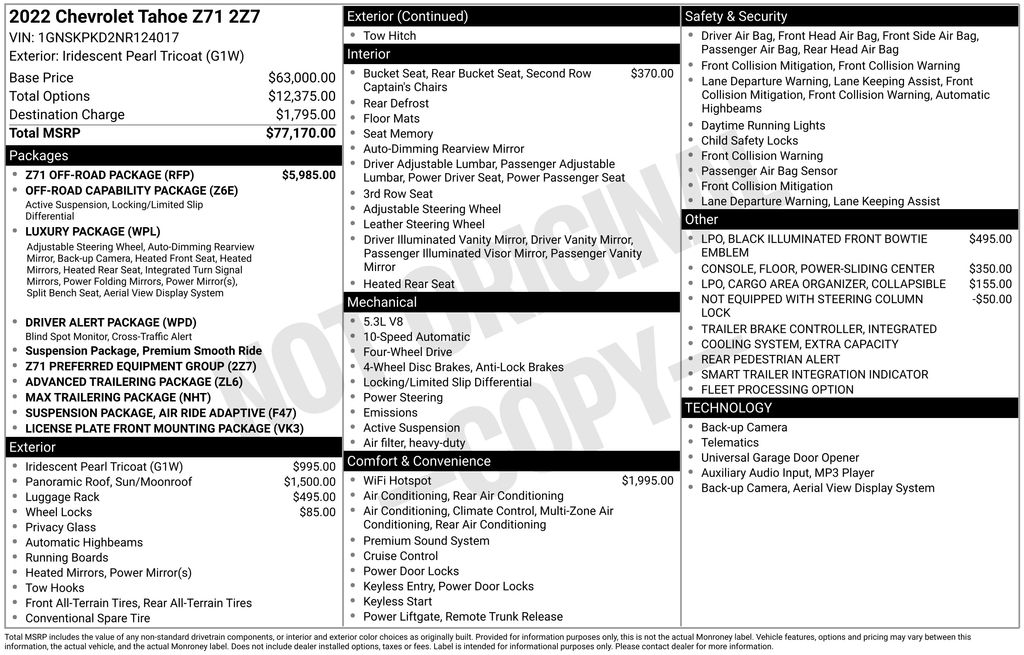 2022 Chevrolet Tahoe Z71 4WD 10-Speed Automatic with Overdrive EcoTec3 5.3L V8 Iridescent Pearl Tricoat