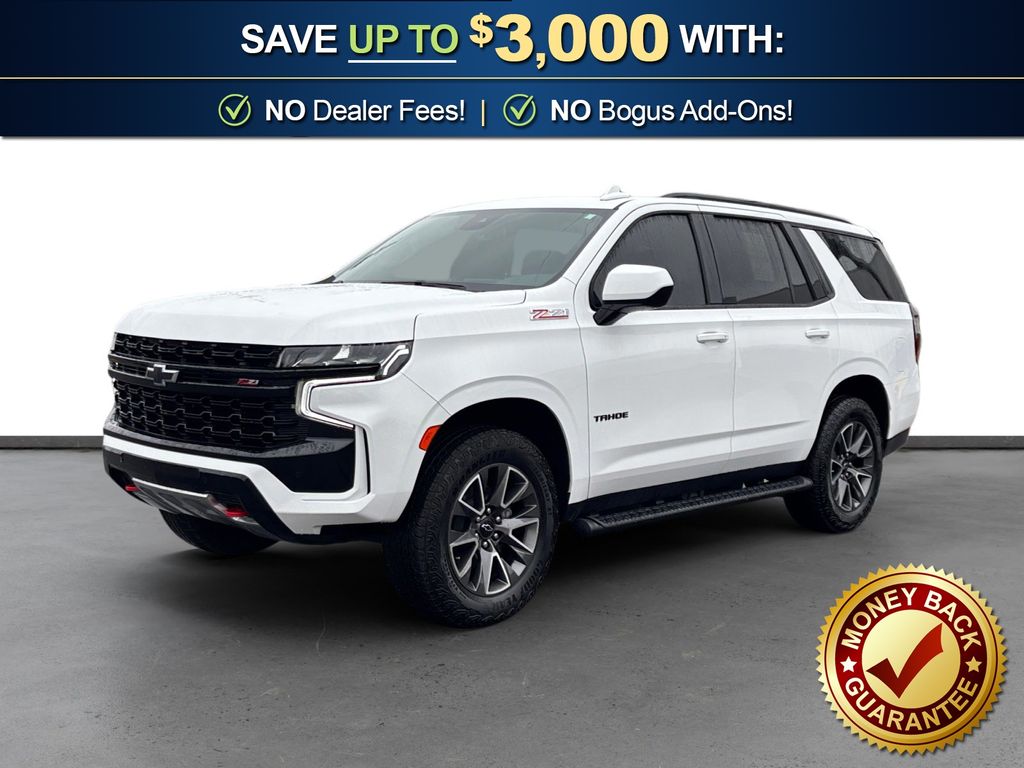 2023 Chevrolet Tahoe Z71 Summit White Z71 4WD 10-Speed Automatic with Overdrive EcoTec3 5.3L V8 4WD, Black Leather, 10-Way Power Driver & Passenger Seat Adjusters, 1st & 2nd Row Color-Keyed Carpeted Floor Mats, 2-Speed Active Electronic AutoTrac Transfer Case, 2nd Row Manual Bucket Seats, 3.23 Rear Axle Ratio, 3rd row seats: split-bench, 4-Wheel Disc Brakes, 9 Speakers, ABS brakes, Air Conditioning, Alloy wheels, AM/FM radio: SiriusXM with 360L, Apple CarPlay/Android Auto, Auto High-beam Headlights, Auto-Dimming Inside Rear-View Mirror, Auto-dimming Rear-View mirror, Automatic temperature control, Black Tubular Assist Steps, Bose 9-Speaker Stereo Audio System Feature, Brake assist, Bright Front & Rear Door Sill Plates, Bumpers: body-color, Color-Keyed Carpeting Floor Covering, Compass, Delay-off headlights, Driver & Front Outboard Passenger Airbags, Driver door bin, Driver vanity mirror, Dual front impact airbags, Dual front side impact airbags, Dual-Pane Power Panoramic Sunroof, Electronic Stability Control, Emergency communication system: OnStar and Chevrolet connected services capable, Enhanced Driver Information Center, Floor Console w/Storage Area, Four wheel independent suspension, Front anti-roll bar, Front Bucket Seats, Front Center Armrest, Front dual zone A/C, Front High-Approach Angle Fascia, Front High-Back Reclining Bucket Seats, Front reading lights, Fully automatic headlights, Garage door transmitter, Hands-Free Rear Power Programmable Liftgate, Heated door mirrors, Heated Driver & Front Passenger Seats, Heated front seats, Hill Descent Control, Illuminated entry, Infotainment Display, Leather-Appointed Seat Trim, LED Daytime Running Lamps, Low tire pressure warning, Memory seat, Memory Settings for Driver, Navigation System, Not Equipped w/Wireless Charging, Occupant sensing airbag, Outside temperature display, Overhead airbag, Overhead console, Panic alarm, Passenger door bin, Passenger vanity mirror, Power door mirrors, Power driver seat, Power Liftgate, Power passenger seat, Power steering, Power windows, Preferred Equipment Group 2Z7, Premium audio system: Chevrolet Infotainment 3 Premium, Premium Smooth Ride Suspension, Radio: Chevrolet Infotainment 3 Premium System, Rain sensing wipers, Rear air conditioning, Rear anti-roll bar, Rear reading lights, Rear seat center armrest, Rear window defroster, Rear window wiper, Red Horizontal-Mounted Recovery Hooks, Remote keyless entry, Remote Start, Roof rack: rails only, Security system, SiriusXM Radio w/360L, Speed control, Speed-sensing steering, Split folding rear seat, Spoiler, Steering wheel mounted audio controls, Tachometer, Telescoping steering wheel, Tilt steering wheel, Traction control, Trip computer, Universal Home Remote, Variably intermittent wipers, Voltmeter, Wheels: 20" x 9" Machined Aluminum, Wireless Charging, Wrapped Steering Wheel, 4WD, Black Leather.