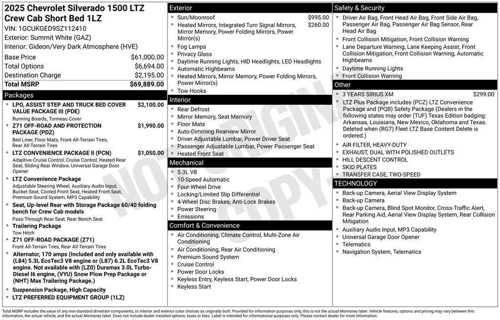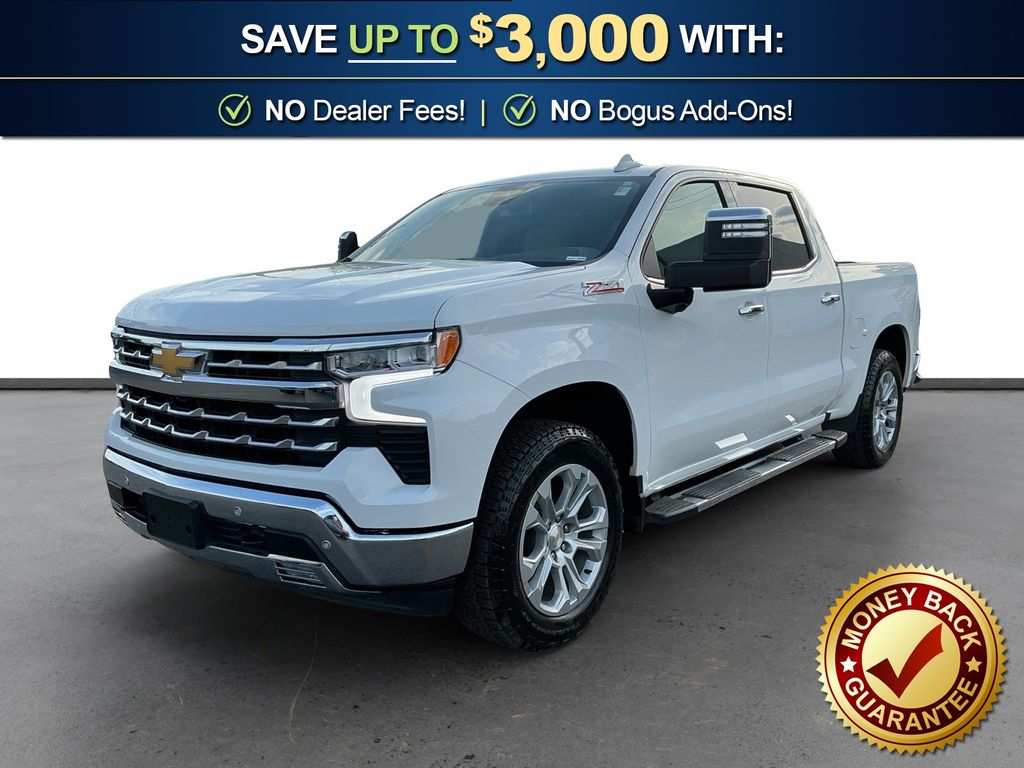 2025 Chevrolet Silverado 1500 LTZ Summit White LTZ 4WD 10-Speed Automatic EcoTec3 5.3L V8 10-Speed Automatic, 4WD, Gideon/Very Dark Atmosphere Leather, 10-Way Power Driver Seat w/Lumbar, 10-Way Power Passenger Seat Adjuster w/Lumbar, 12.3" Multicolor Reconfigurable Digital Display, 120-Volt Bed Mounted Power Outlet, 120-Volt Interior Power Outlet, 170 Amp Alternator, 2 USB Data Ports, 2nd Row Heated Outboard Seats, 3 Years SiriusXM, 3.23 Rear Axle Ratio, 4-Wheel Disc Brakes, 6" Rectangular Chrome Tubular Assist Steps (LPO), 7 Speakers, ABS brakes, Adaptive Cruise Control, Air Conditioning, All-Weather Floor Liner (LPO) (AAK), Alloy wheels, AM/FM radio: SiriusXM with 360L, Apple CarPlay/Android Auto, Assist Step & Truck Bed Cover Value Pkg III (LPO), Auto High-beam Headlights, Auto-dimming door mirrors, Auto-Dimming Inside Rear-View Mirror, Auto-dimming Rear-View mirror, Auto-Locking Rear Differential, Automatic Emergency Braking, Automatic temperature control, Bluetooth® For Phone, Brake assist, Bumpers: chrome, Chevytec Spray-On Black Bedliner, Chrome Mirror Caps, Color-Keyed Carpeting Floor Covering, Compass, Deep-Tinted Glass, Delay-off headlights, Driver door bin, Driver Memory, Driver vanity mirror, Dual Exhaust w/Polished Outlets, Dual front impact airbags, Dual front side impact airbags, Dual Rear USB Ports (Charge Only), Electric Rear-Window Defogger, Electronic Cruise Control, Electronic Stability Control, Electronic Transmission Range Selector Shifter, Emergency communication system: OnStar, Floor Mounted Center Console, Following Distance Indicator, Forward Collision Alert, Front anti-roll bar, Front Bucket Seats, Front Center Armrest, Front dual zone A/C, Front fog lights, Front Frame-Mounted Black Recovery Hooks, Front LED Fog Lamps, Front Pedestrian Braking, Front Rain-Sensing Wipers, Front reading lights, Front Rubberized Vinyl Floor Mats, Front wheel independent suspension, Fully automatic headlights, Hard Folding Truck Bed Cover (LPO), HD Surround Vision, Heated door mirrors, Heated Driver & Front Outboard Passenger Seats, Heated front seats, Heated Steering Wheel, Heated steering wheel, Heavy-Duty Air Filter, High Capacity Suspension Package, Hill Descent Control, Hitch Guidance, Hitch Guidance w/Hitch View, Illuminated entry, In-Vehicle Trailering System App, Integrated Trailer Brake Controller, IntelliBeam Automatic High Beam On/Off, Keyless Open & Start, Lane Keep Assist w/Lane Departure Warning, LED Cargo Area Lighting, Low tire pressure warning, LTZ Convenience Package, LTZ Convenience Package II, LTZ Plus Package, Memory seat, Occupant sensing airbag, Off-Road Suspension, OnStar Services Capable, Outside Heated Power-Adjustable Mirrors, Outside temperature display, Overhead airbag, Overhead console, Panic alarm, Passenger door bin, Passenger vanity mirror, Perforated Leather-Appointed Front Seat Trim, Perimeter Lighting, Power door mirrors, Power driver seat, Power Front Passenger Windows w/Express Up/Down, Power Front Windows w/Driver Express Up/Down, Power passenger seat, Power Rear Windows w/Express Down, Power Sliding Rear Window w/Rear Defogger, Power steering, Power Sunroof, Power Tailgate, Power Tilt & Telescoping Steering Column, Power windows, Preferred Equipment Group 1LZ, Premium audio system: Chevrolet Infotainment 3 Premium, Premium Bose 7-Speaker Sound System, Pwr-Adjustable Vertical Trailering Outside Mirrors, Radio data system, Radio: Chevrolet Infotainment 3 Premium System, Rain sensing wipers, Rear Cross Traffic Braking, Rear Pedestrian Alert, Rear reading lights, Rear Rubberized-Vinyl Floor Mats, Rear seat center armrest, Rear step bumper, Rear Wheelhouse Liners, Rear window defroster, Remote keyless entry, Remote Vehicle Starter System, Safety Alert Seat, Safety Package, Security system, SiriusXM w/360L Trial Subscription, Speed control, Speed-sensing steering, Split folding rear seat, Standard Tailgate, Steering Wheel Audio Controls, Steering wheel mounted audio controls, Tachomete