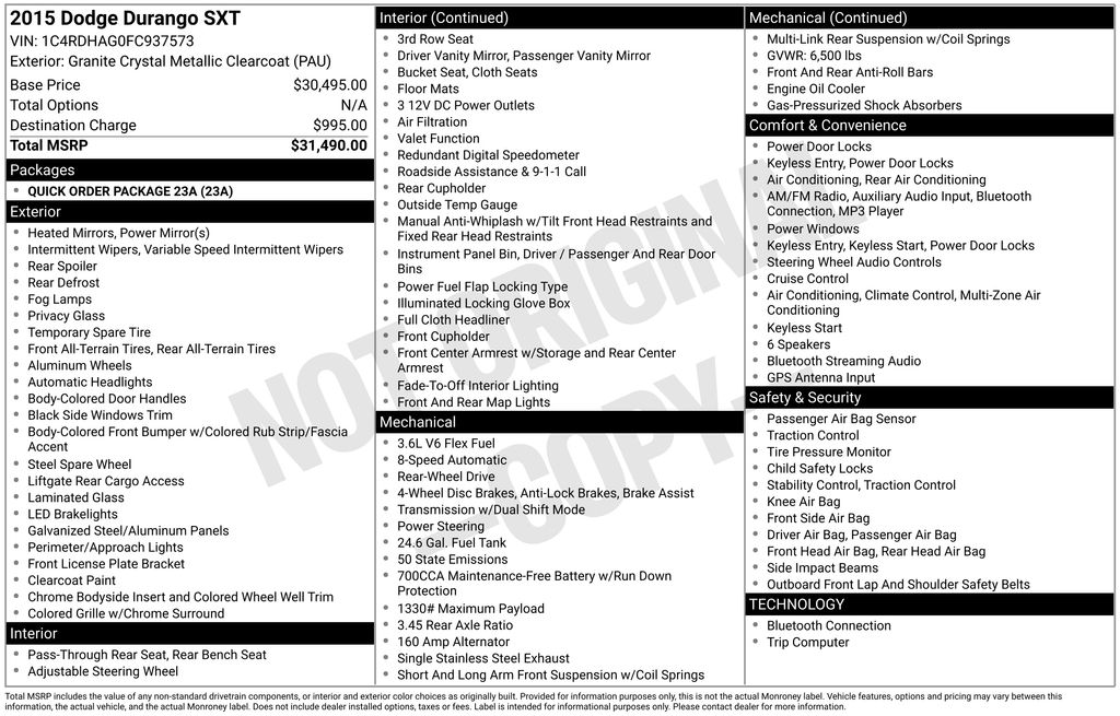 2015 Dodge Durango SXT RWD 8-Speed Automatic 3.6L V6 Flex Fuel 24V VVT Granite Crystal Metallic Clearcoat