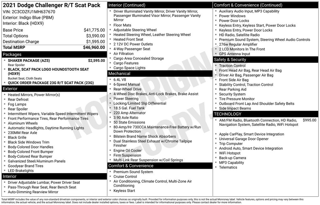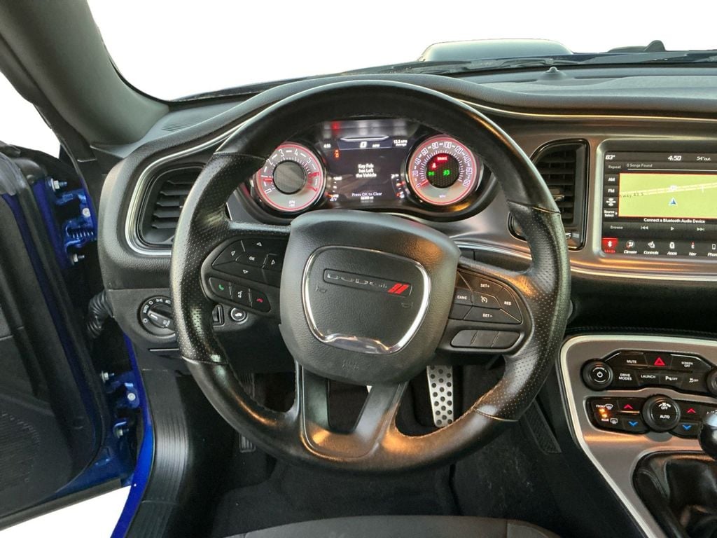 2021 Dodge Challenger R/T Scat Pack Indigo Blue R/T Scat Pack RWD Tremec 6-Speed Manual SRT HEMI 6.4L V8 1-Yr SiriusXM Guardian Trial, 230MM Rear Axle, 4-Wheel Disc Brakes, 4G LTE Wi-Fi Hot Spot, 5-Year SiriusXM Traffic Service, 5-Year SiriusXM Travel Link Service, 6 Speakers, 8.4" Touchscreen Display, ABS brakes, Air Conditioning, Alloy wheels, AM/FM radio: SiriusXM, Anti-whiplash front head restraints, Apple CarPlay, Apple CarPlay/Android Auto, Auto-dimming Rear-View mirror, Automatic temperature control, Bee Fender Badge, Brake assist, Bumpers: body-color, Compass, Dash Plaque, Delay-off headlights, Driver door bin, Driver vanity mirror, Dual front impact airbags, Dual front side impact airbags, Electronic Stability Control, Emergency communication system: SiriusXM Guardian, For Details, Visit DriveUconnect.com, Four wheel independent suspension, Front anti-roll bar, Front Bucket Seats, Front Center Armrest, Front dual zone A/C, Front fog lights, Front reading lights, Fully automatic headlights, Garage door transmitter, Gloss Black I/P Cluster Trim Rings, Google Android Auto, GPS Antenna Input, GPS Navigation, HD Radio, Heated door mirrors, Heated front seats, Heated steering wheel, Illuminated entry, Integrated Center Stack Radio, Integrated Voice Command w/Bluetooth, Leather Shift Knob, Low tire pressure warning, Media Hub (2 USB, AUX), MOPAR Shaker Hood, MOPAR Shaker Intake, Outside temperature display, Overhead airbag, Overhead console, Panic alarm, ParkView Rear Back-Up Camera, Passenger door bin, Passenger vanity mirror, Power door mirrors, Power driver seat, Power steering, Power windows, Quick Order Package 23G R/T Scat Pack, Radio data system, Radio: Uconnect 4C Nav w/8.4" Display, Radio: Uconnect 4C w/8.4" Display, Rear anti-roll bar, Rear reading lights, Rear seat center armrest, Rear window defroster, Remote keyless entry, Scat Pack Logo Houndstooth Seat, Security system, Shaker Mounted 392 HEMI Badge, Shaker Package, Shark Fin Antenna, SiriusXM Satellite Radio, SiriusXM Traffic Plus, SiriusXM Travel Link, Speed control, Speed-sensing steering, Split folding rear seat, Spoiler, Sport steering wheel, Steering wheel mounted audio controls, Tachometer, Telescoping steering wheel, Tilt steering wheel, Traction control, Trip computer, Underhood Shaker Decal, USB Host Flip, Variably intermittent wipers, Wheels: 20" x 9" Lo Gloss Granite Crystal, White Face Instrument Cluster.