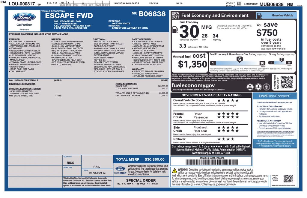 Drive in comfort and confidence with the 2021 Ford Escape SEL in Oxford White, featuring a luxurious Sandstone leather interior. Powered by the 1.5L EcoBoost engine paired with a new 8-speed automatic transmission, this SUV delivers smooth performance and excellent fuel efficiencyaveraging 30 MPG (28 city / 34 highway).