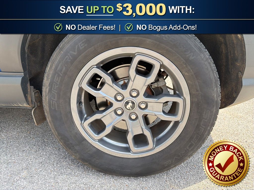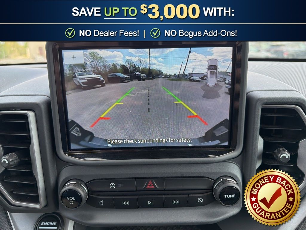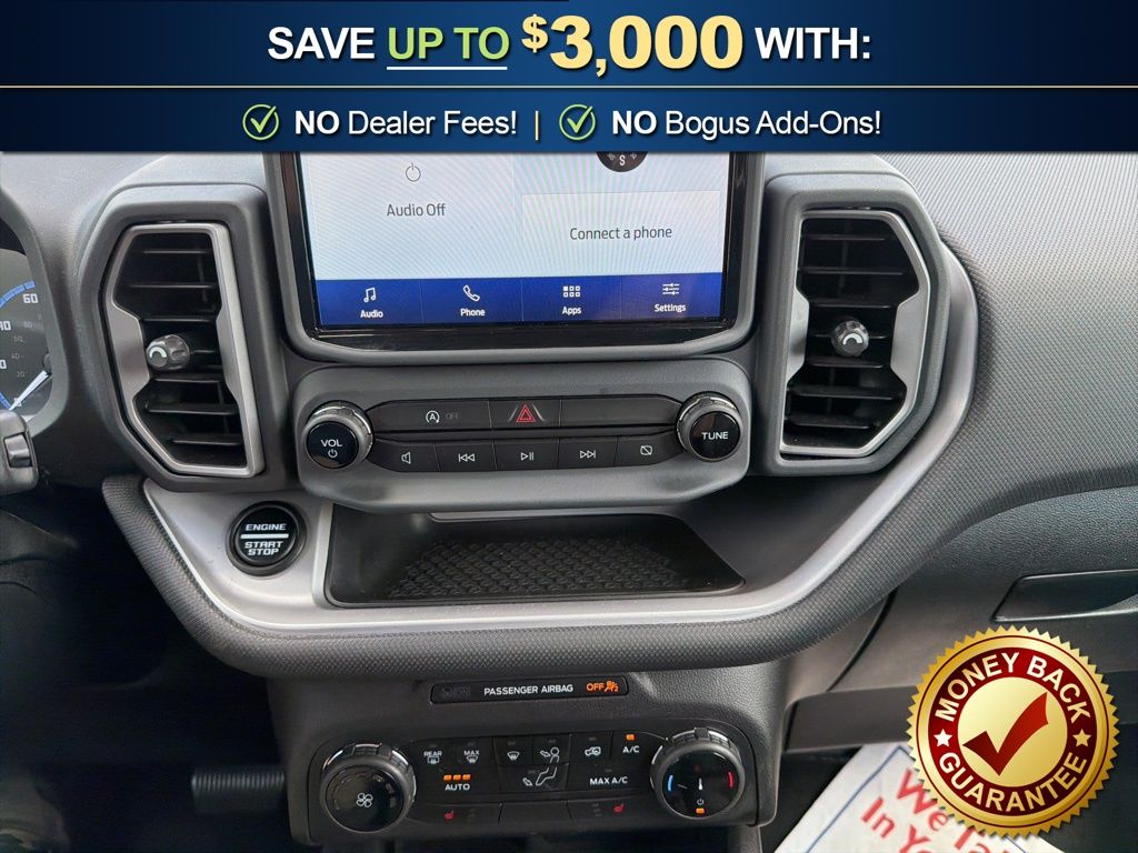 3.80 Axle Ratio, 4-Wheel Disc Brakes, 6 Speakers, ABS brakes, Air Conditioning, Alloy wheels, AM/FM radio: SiriusXM, AM/FM Stereo, Auto High-beam Headlights, Automatic temperature control, Brake assist, Cargo Management System, Compass, Convenience Package, Delay-off headlights, Driver door bin, Driver vanity mirror, Dual front impact airbags, Dual front side impact airbags, Electronic Stability Control, Emergency communication system: SYNC 3 911 Assist, Equipment Group 200A, Four wheel independent suspension, Front anti-roll bar, Front Bucket Seats, Front Center Armrest, Front Driver & Passenger Seatback Zipper Pockets, Front License Plate Bracket, Front reading lights, Fully automatic headlights, Heated door mirrors, Heated Front Bucket Seats, Illuminated entry, Intelligent Access (Lock/Unlock), Knee airbag, Leather-Wrapped Steering Wheel, LED Fog Lamps, Low tire pressure warning, Occupant sensing airbag, Outside temperature display, Overhead airbag, Overhead console, Panic alarm, Passenger door bin, Passenger vanity mirror, Power door mirrors, Power steering, Power windows, Radio data system, Rear anti-roll bar, Rear Parking Sensors, Rear reading lights, Rear seat center armrest, Rear window defroster, Rear window wiper, Remote keyless entry, Security system, SiriusXM, Speed control, Speed-sensing steering, Speed-Sensitive Wipers, Split folding rear seat, Steering wheel mounted audio controls, SYNC 3 Communications & Entertainment System, SYNC 3/Apple CarPlay/Android Auto, Tachometer, Telescoping steering wheel, Tilt steering wheel, Traction control, Trip computer, Unique Cloth Front Bucket Seats, Universal Garage Door Opener (UGDO), Variably intermittent wipers, Wheels: 17" Carbonized Gray-Painted Aluminum, Wireless Charging Pad. 2023 Ford Bronco Sport Big Bend