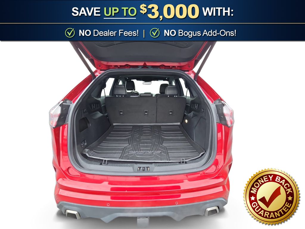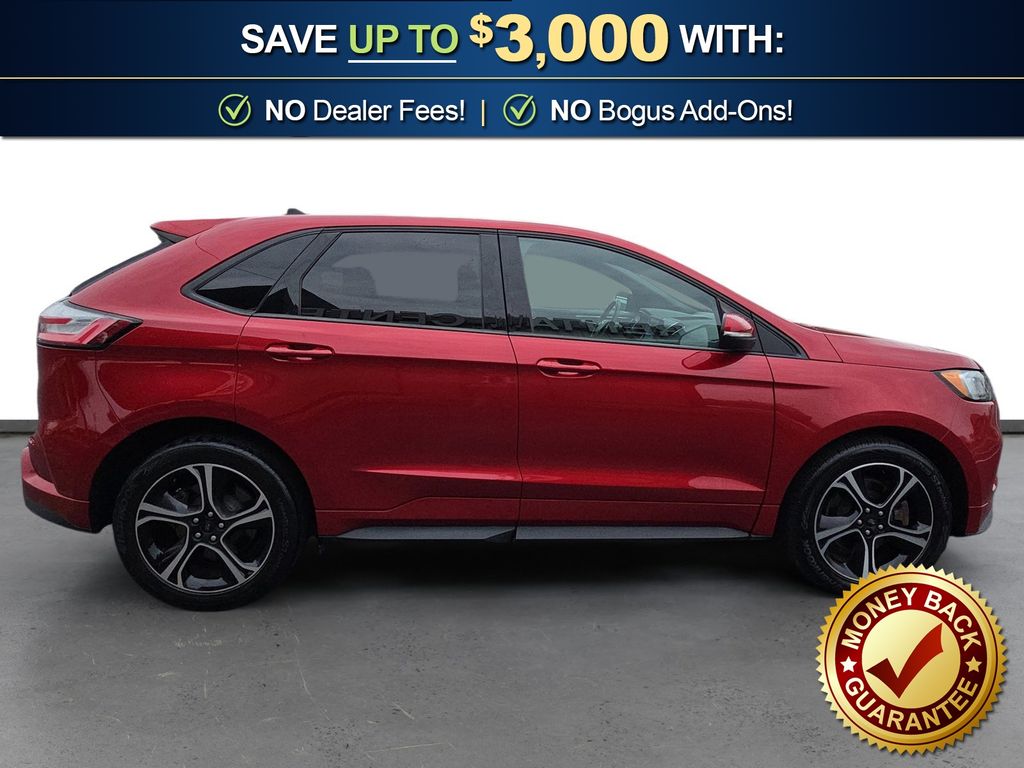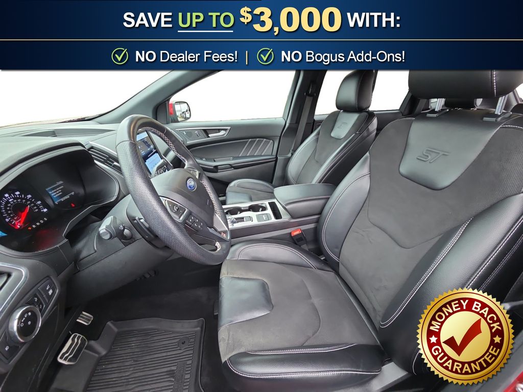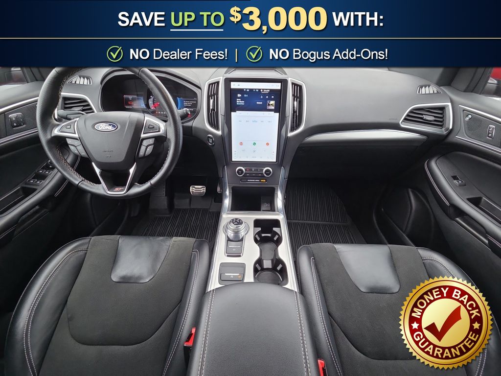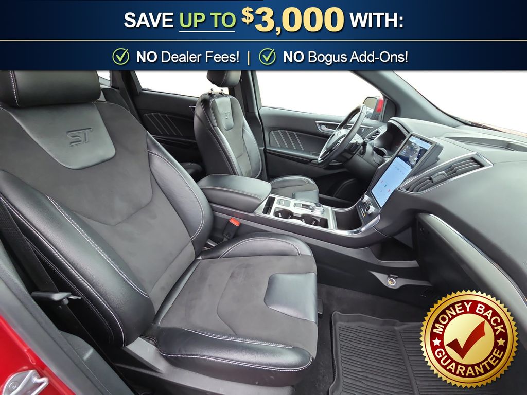AWD, 12 Speakers, 3.39 Axle Ratio, 4-Wheel Disc Brakes, ABS brakes, Air Conditioning, Alloy wheels, AM/FM radio: SiriusXM with 360L, Auto High-beam Headlights, Auto-dimming Rear-View mirror, Automatic temperature control, Brake assist, Bumpers: body-color, Compass, Delay-off headlights, Driver door bin, Driver vanity mirror, Dual front impact airbags, Dual front side impact airbags, Electronic Stability Control, Emergency communication system: SYNC 4 911 Assist, Equipment Group 400A, FordPass Connect, Four wheel independent suspension, Front anti-roll bar, Front Bucket Seats, Front Center Armrest w/Storage, Front dual zone A/C, Front fog lights, Front License Plate Bracket, Front reading lights, Fully automatic headlights, Heated door mirrors, Heated front seats, Illuminated entry, Knee airbag, Leather steering wheel, Leather-Trimmed Heated ST Bolstered Bucket Seats, Leather-Trimmed Htd ST Bolstered Bucket Seats, Low tire pressure warning, Memory seat, Occupant sensing airbag, Outside temperature display, Overhead airbag, Overhead console, Panic alarm, Passenger door bin, Passenger vanity mirror, Power door mirrors, Power driver seat, Power Liftgate, Power passenger seat, Power steering, Power windows, Race Red & Raptor Blue Accent Stitching, Radio: B&O Sound System by Bang & Olufsen, Rain sensing wipers, Rear anti-roll bar, Rear Parking Sensors, Rear reading lights, Rear seat center armrest, Rear window defroster, Rear window wiper, Remote keyless entry, Security system, SiriusXM w/360L, Speed control, Speed-Sensitive Wipers, Split folding rear seat, Spoiler, Steering wheel mounted audio controls, SYNC 4A w/Enhanced Voice Recognition, Tachometer, Telescoping steering wheel, Tilt steering wheel, Traction control, Trip computer, Turn signal indicator mirrors, Variably intermittent wipers, Wheels: 20" Bright-Machined Aluminum, AWD. 2023 Ford Edge ST