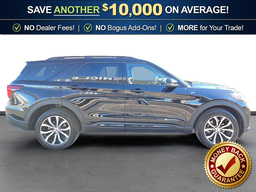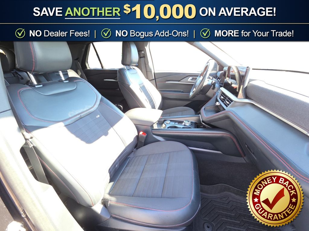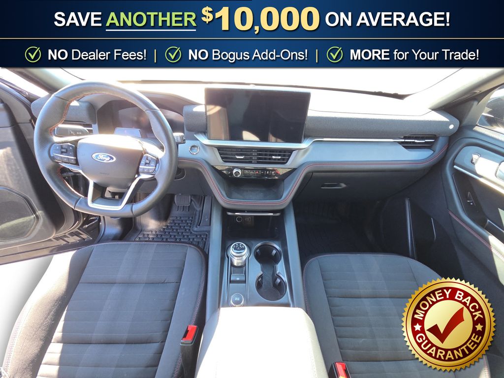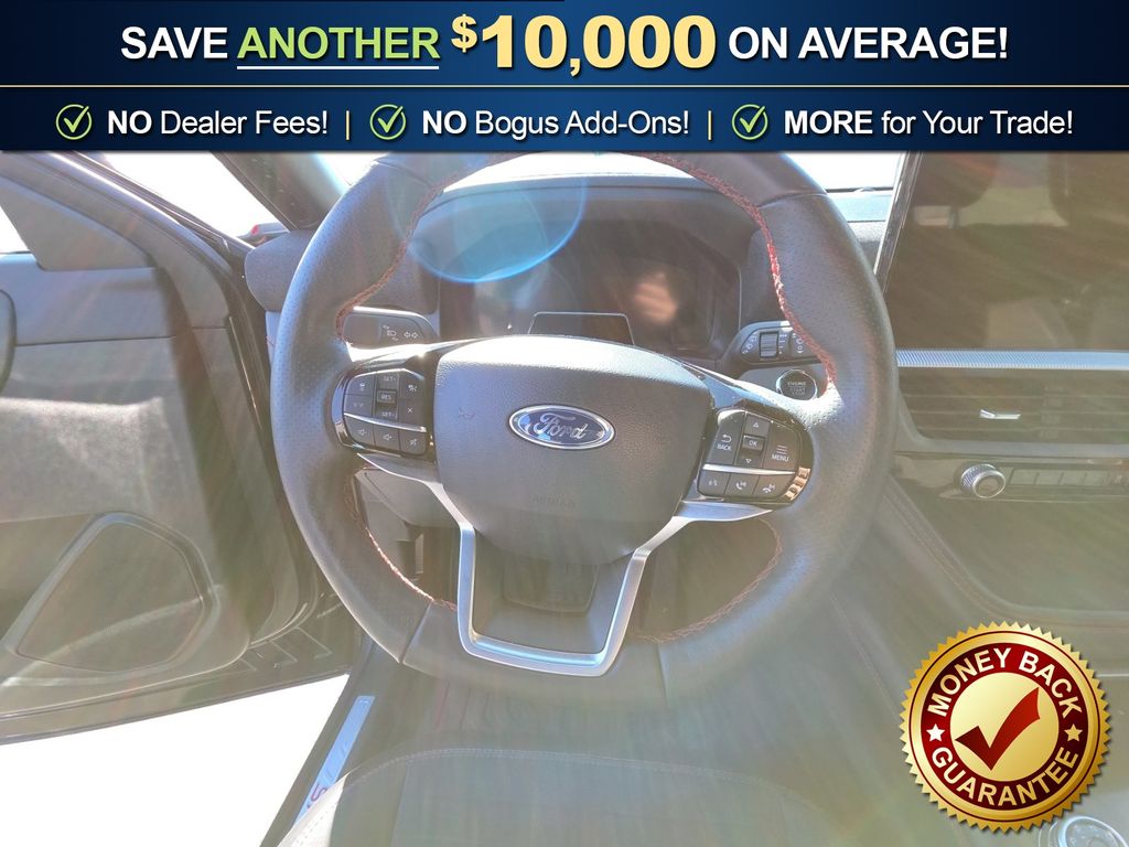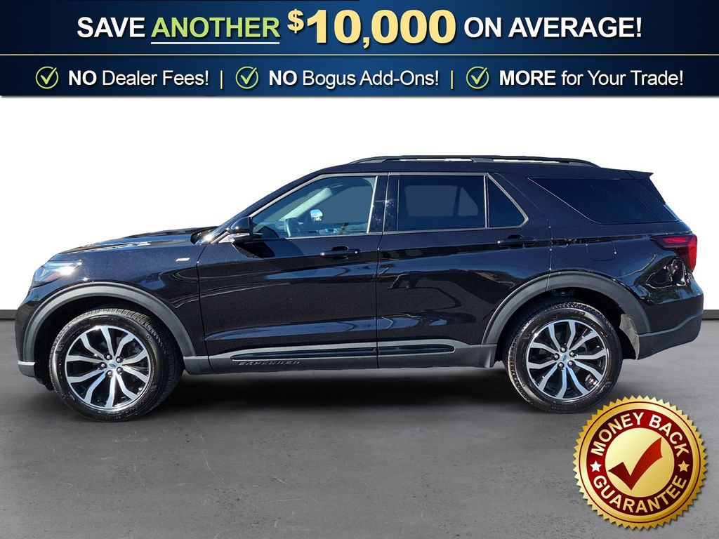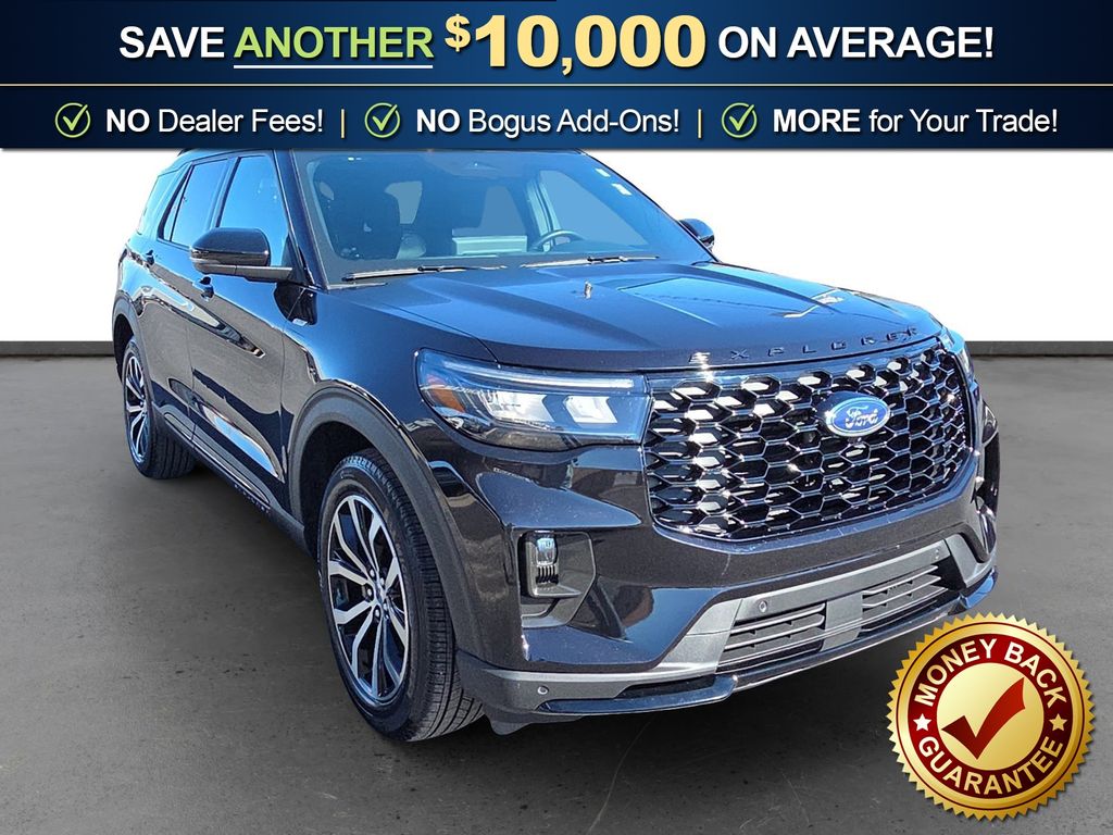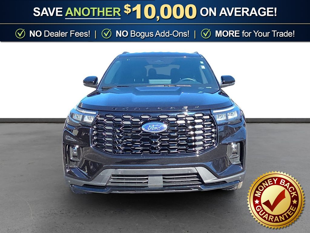 4WD, 10 Speakers, 2nd Row Captain's Chairs w/E-Z Entry & Armrest, 3.58 Non-Limited Slip Rear Axle, 3rd row seats: bench, 4-Wheel Disc Brakes, ABS brakes, Air Conditioning, Alloy wheels, AM/FM radio: SiriusXM with 360L, Apple CarPlay/Android Auto, Auto High-beam Headlights, Automatic temperature control, Brake assist, Bumpers: body-color, Compass, Delay-off headlights, Driver door bin, Driver vanity mirror, Dual front impact airbags, Dual front side impact airbags, Electronic Stability Control, Emergency communication system: 911 Assist, Equipment Group 300A Standard Package, Exterior Parking Camera Rear, Four wheel independent suspension, Front anti-roll bar, Front Bucket Seats, Front Center Armrest, Front dual zone A/C, Front fog lights, Front License Plate Bracket, Front reading lights, Fully automatic headlights, Garage door transmitter, Heated door mirrors, Heated front seats, Heated steering wheel, Heated Unique Cloth Captain's Chairs, Illuminated entry, Internet access capable: FordPass Connect 5G, Knee airbag, Leather steering wheel, Low tire pressure warning, Navigation System, Occupant sensing airbag, Outside temperature display, Overhead airbag, Overhead console, Panic alarm, Passenger door bin, Passenger vanity mirror, Power door mirrors, Power driver seat, Power Liftgate, Power passenger seat, Power steering, Power windows, Radio: B&O Sound System by Bang & Olufsen, Rear air conditioning, Rear anti-roll bar, Rear reading lights, Rear window defroster, Rear window wiper, Remote keyless entry, Security system, Speed control, Speed-sensing steering, Speed-Sensitive Wipers, Split folding rear seat, Spoiler, Steering wheel mounted audio controls, Tachometer, Telescoping steering wheel, Tilt steering wheel, Traction control, Trip computer, Variably intermittent wipers, Wheels: 20" Ebony-Painted Machined Aluminum, 4WD. 2025 Ford Explorer ST-Line